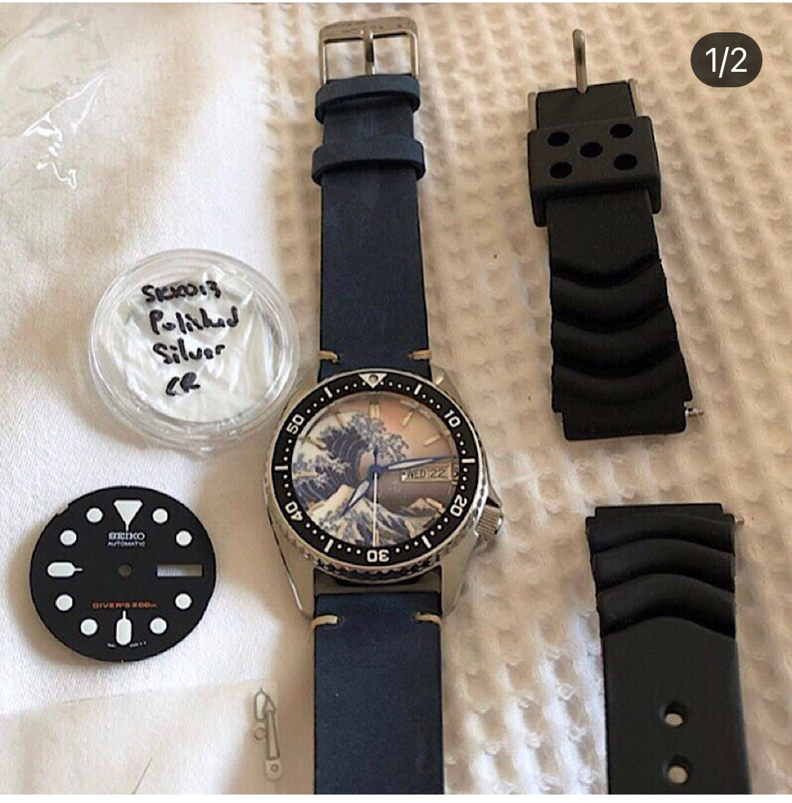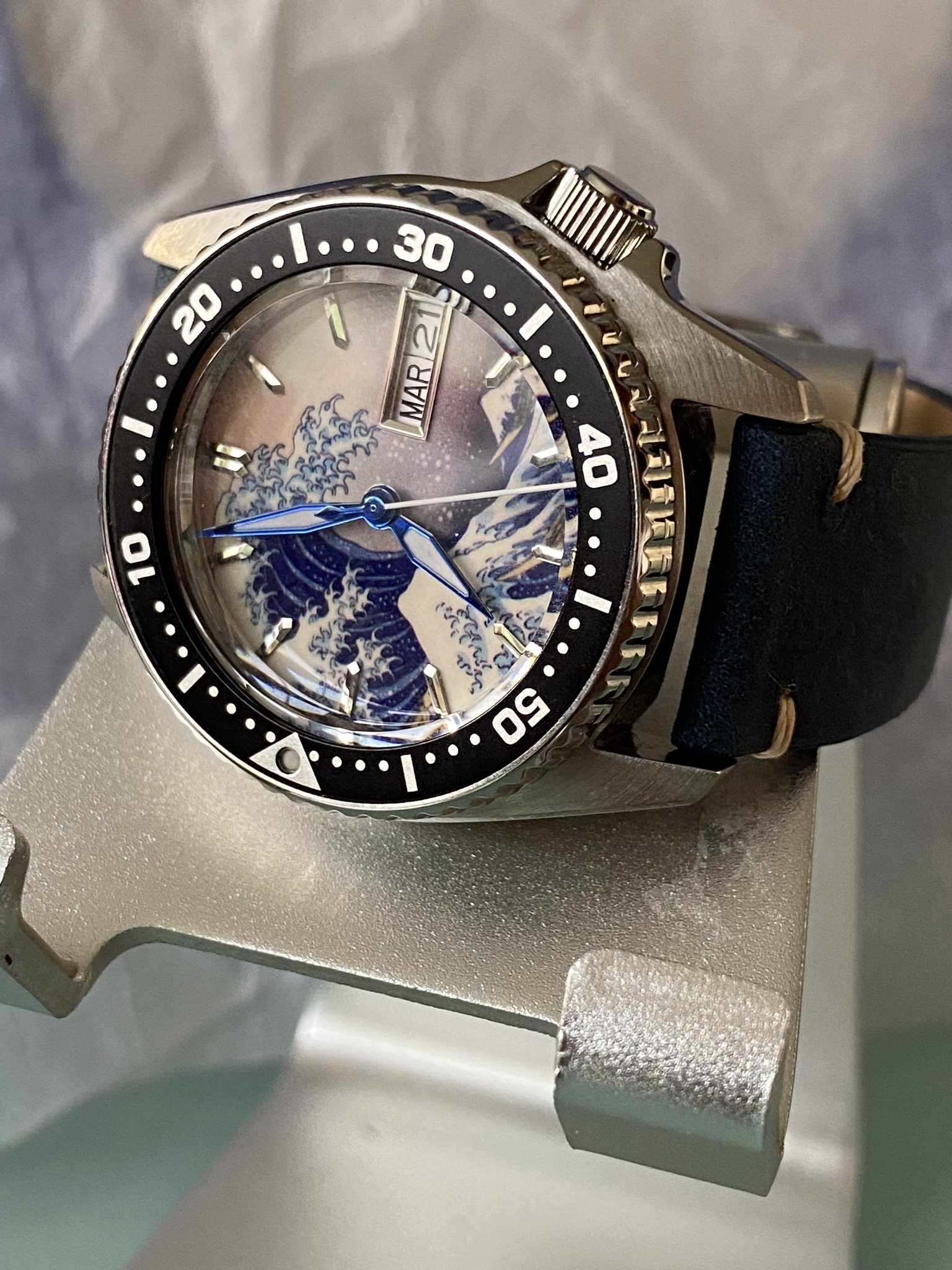 ·Here we have a rarely worn and now discontinued Seiko SKX 013. This one has the long sold out Lucius Atelier ‘Wave of Kanagawa’ dial, with hands and strap to match.