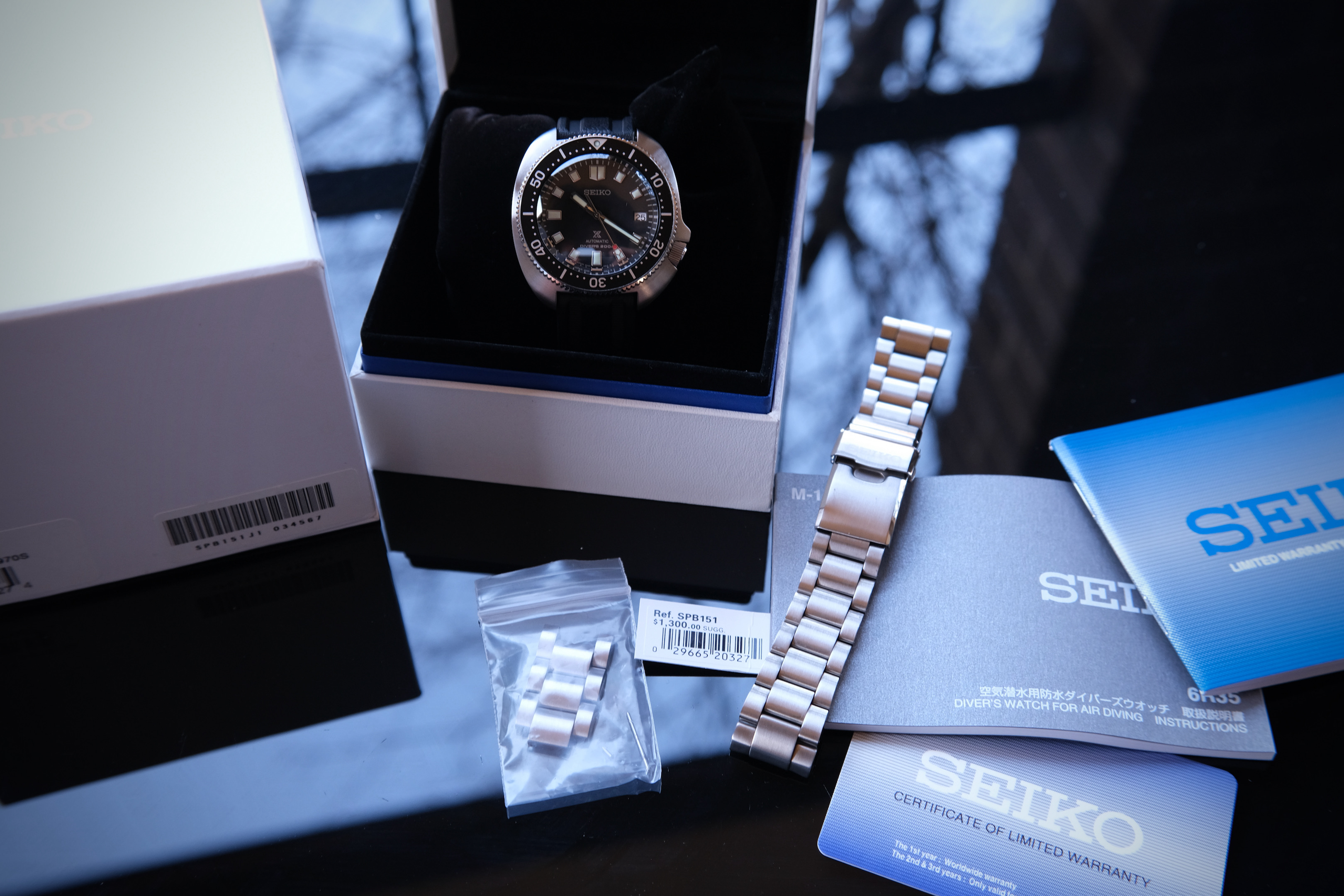 Up for sale is my Seiko SPB151. It is in excellent condition without any significant signs of wear on the case. The OEM stainless steel bracelet has several superficial marks that could easily be polished out. The watch comes full set with box, instruction booklet, warranty card, and a barely used Uncle Seiko XGL-731 tire tread rubber strap. I am the original owner and purchased the watch from an AD in May 2022.