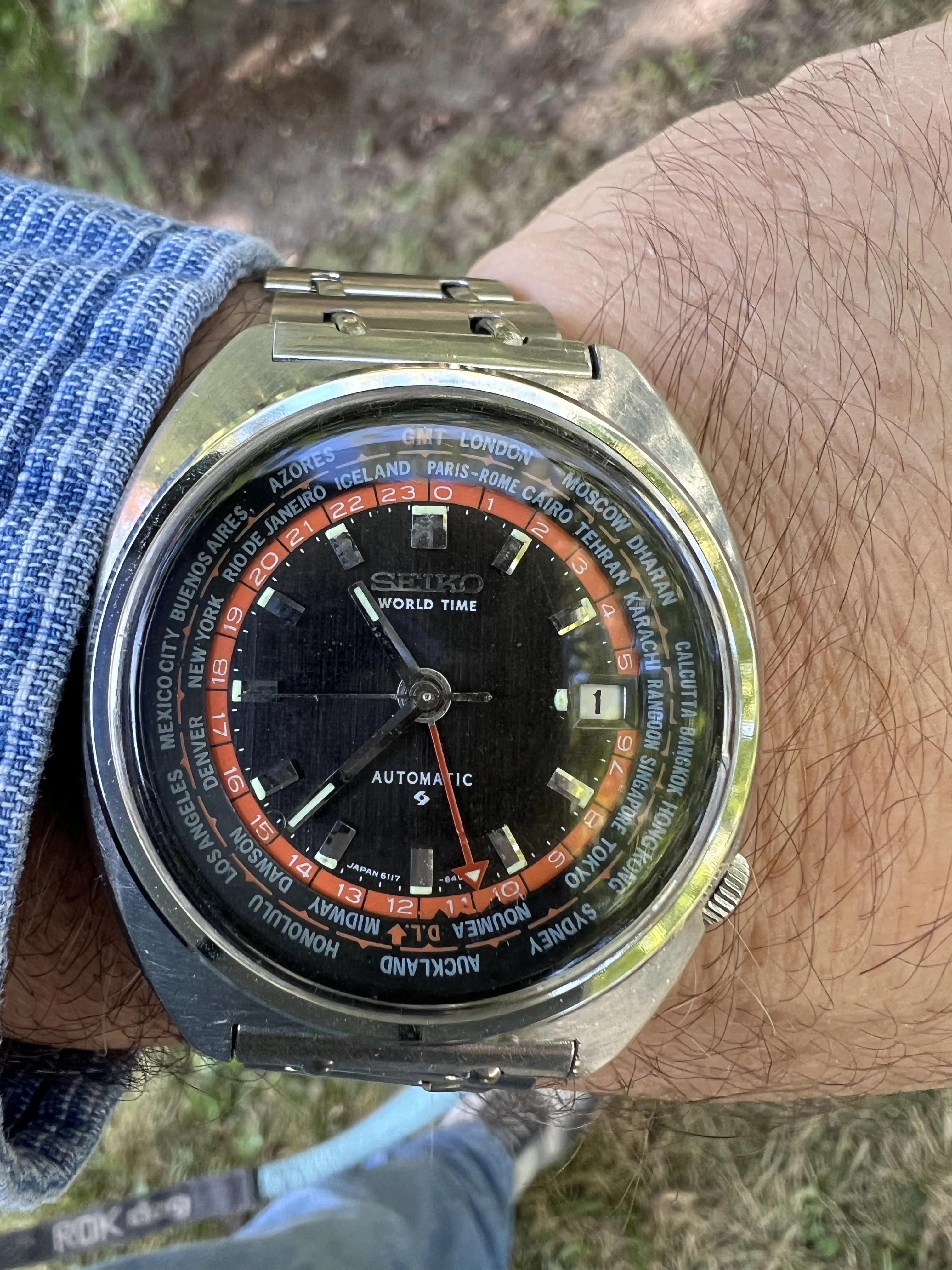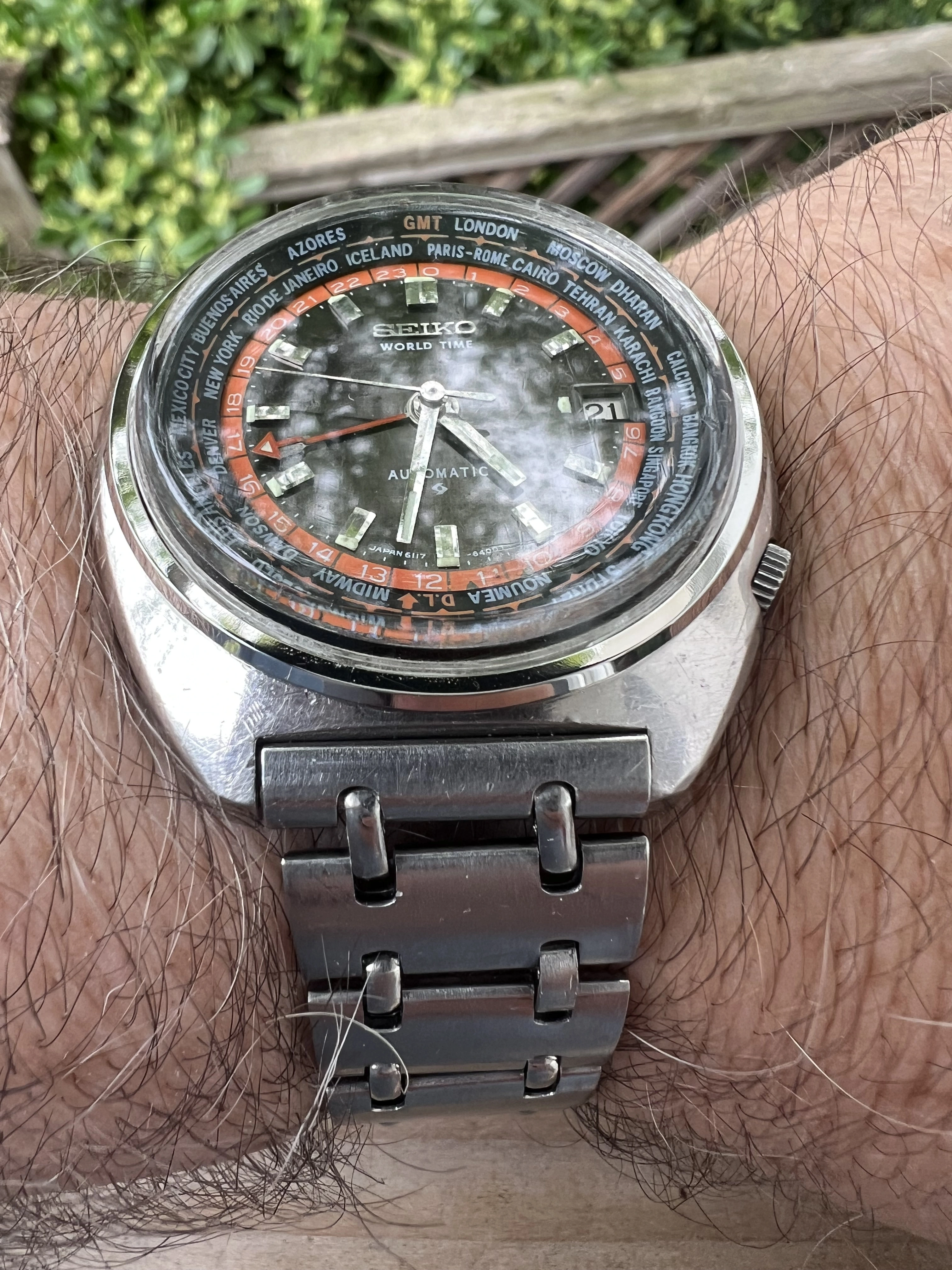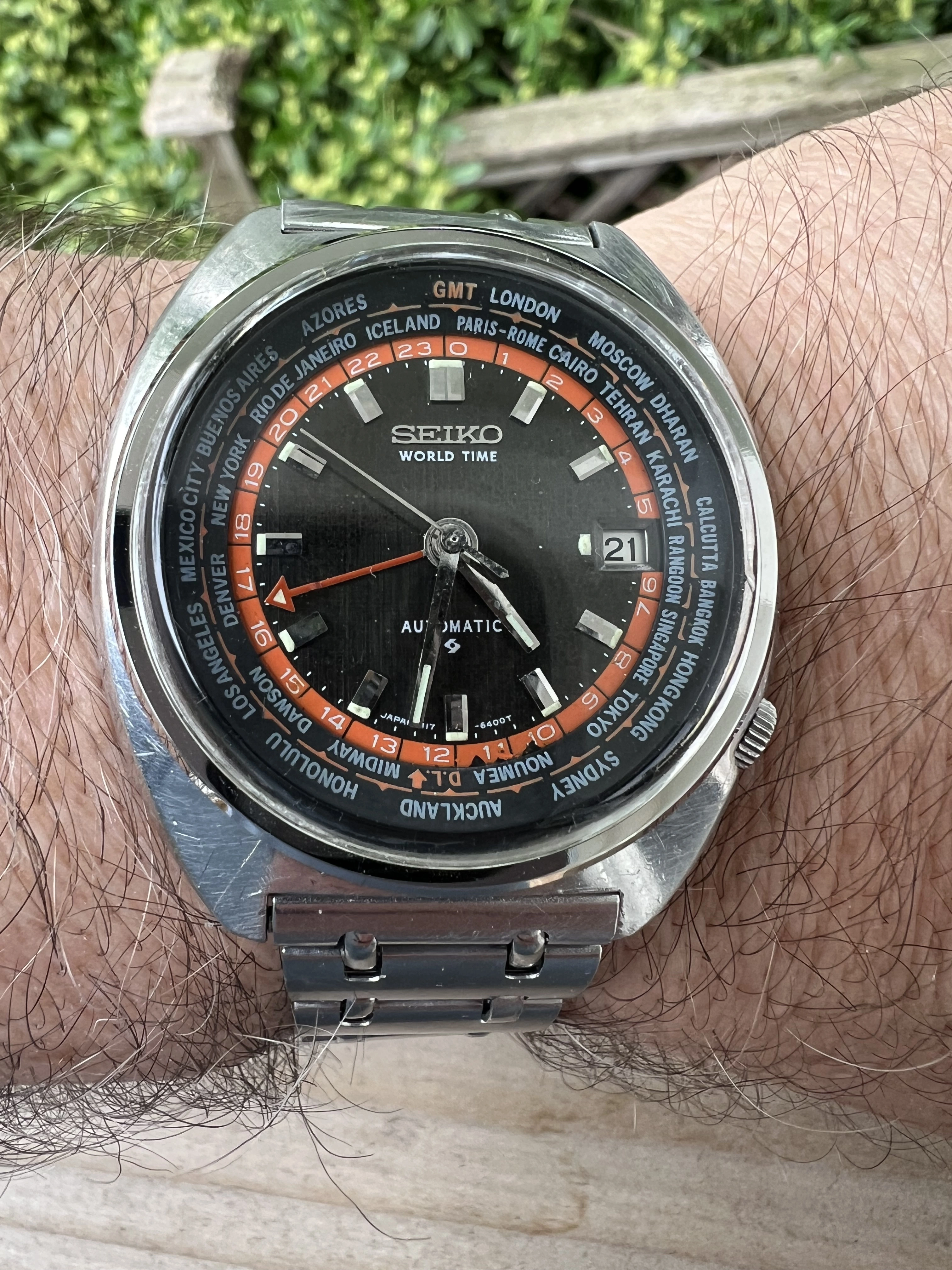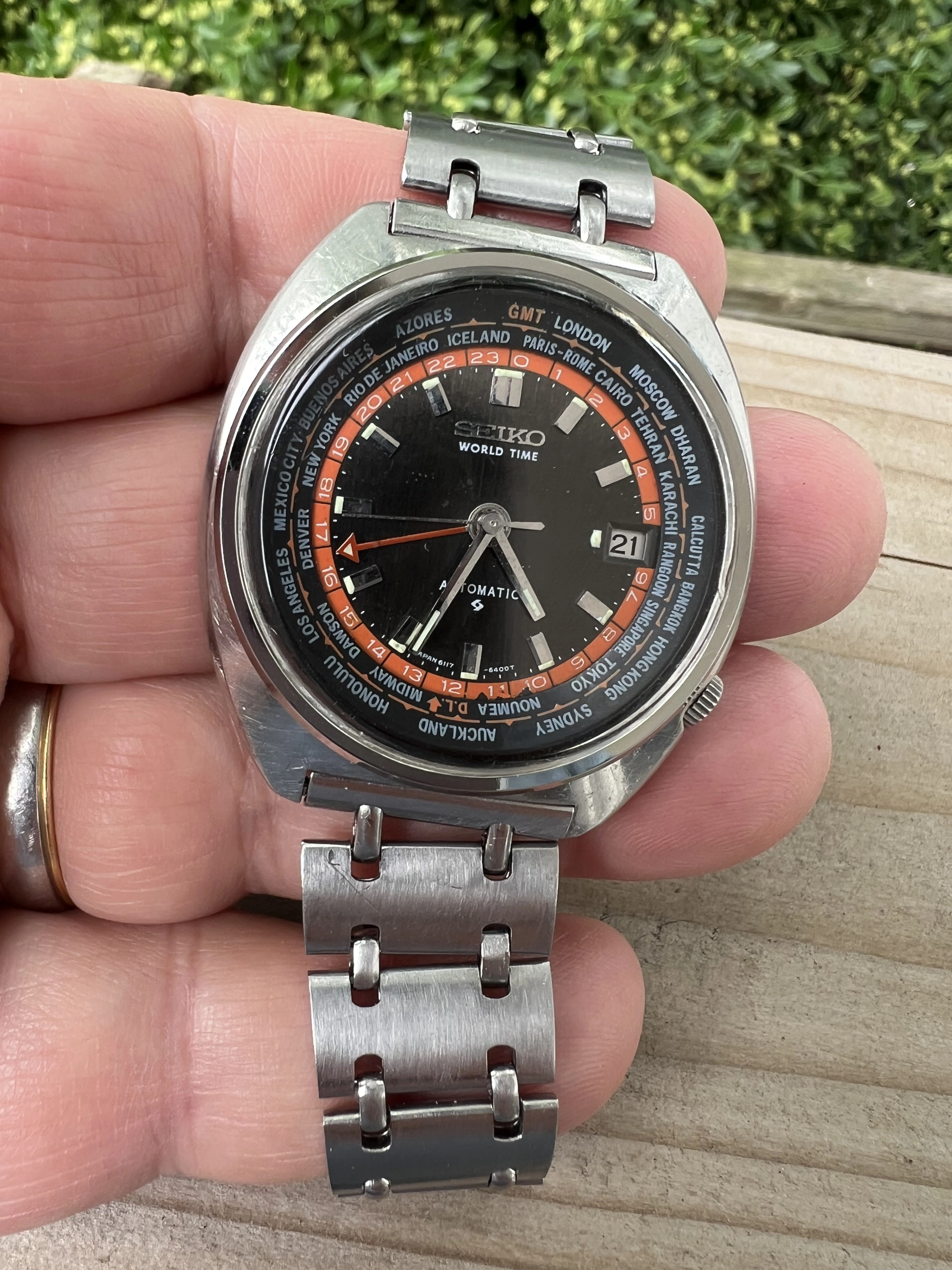 ·Seiko World Time GMT Automatic 6117-6049, with black and orange dial, is a sought after watch for Seiko collectors with rotating inner bezel with cities of the world, and red GMT hand. This one is a nice vintage example with original rail track bracelet. I am thinnning a rather large Seiko collection.