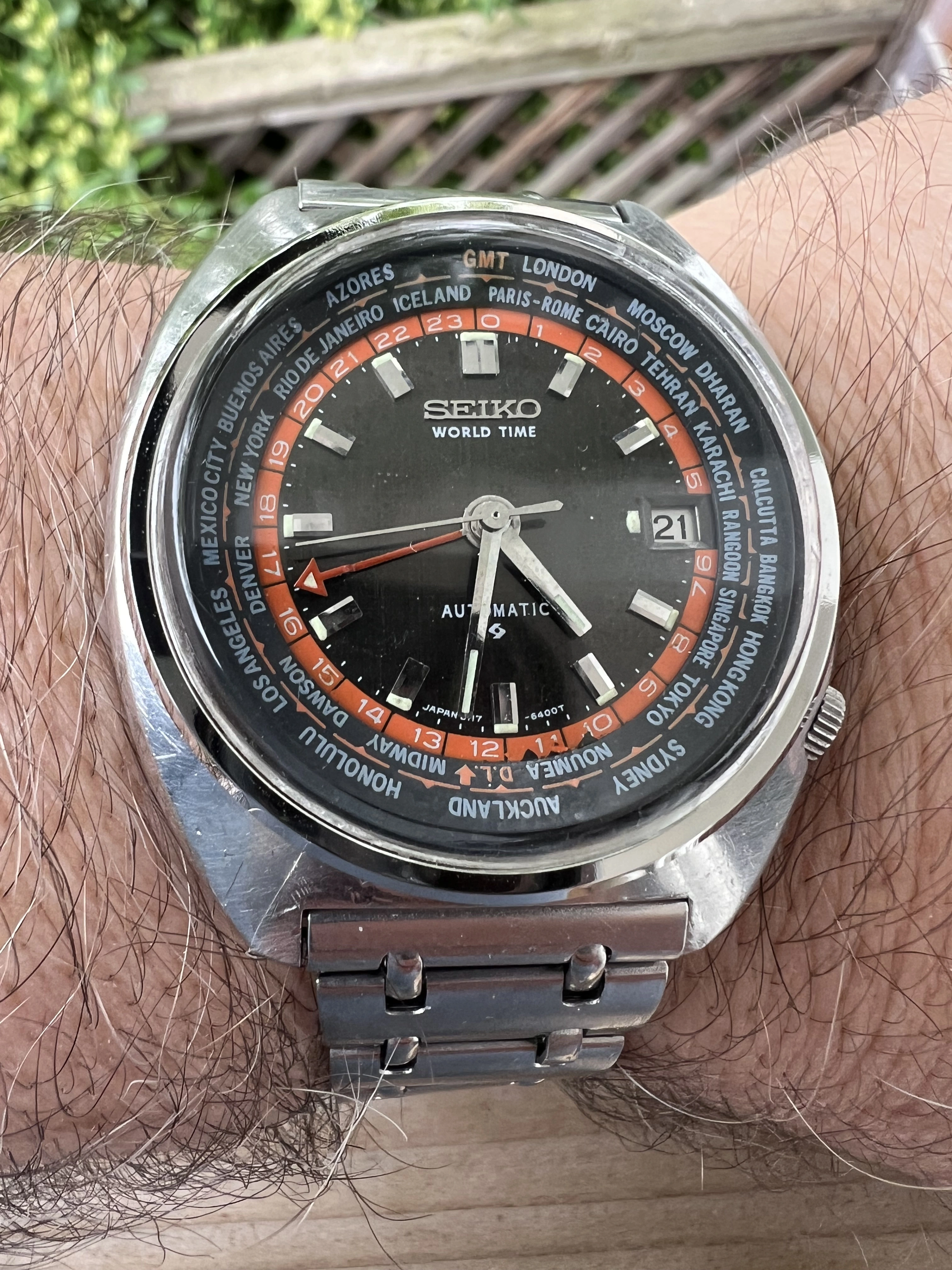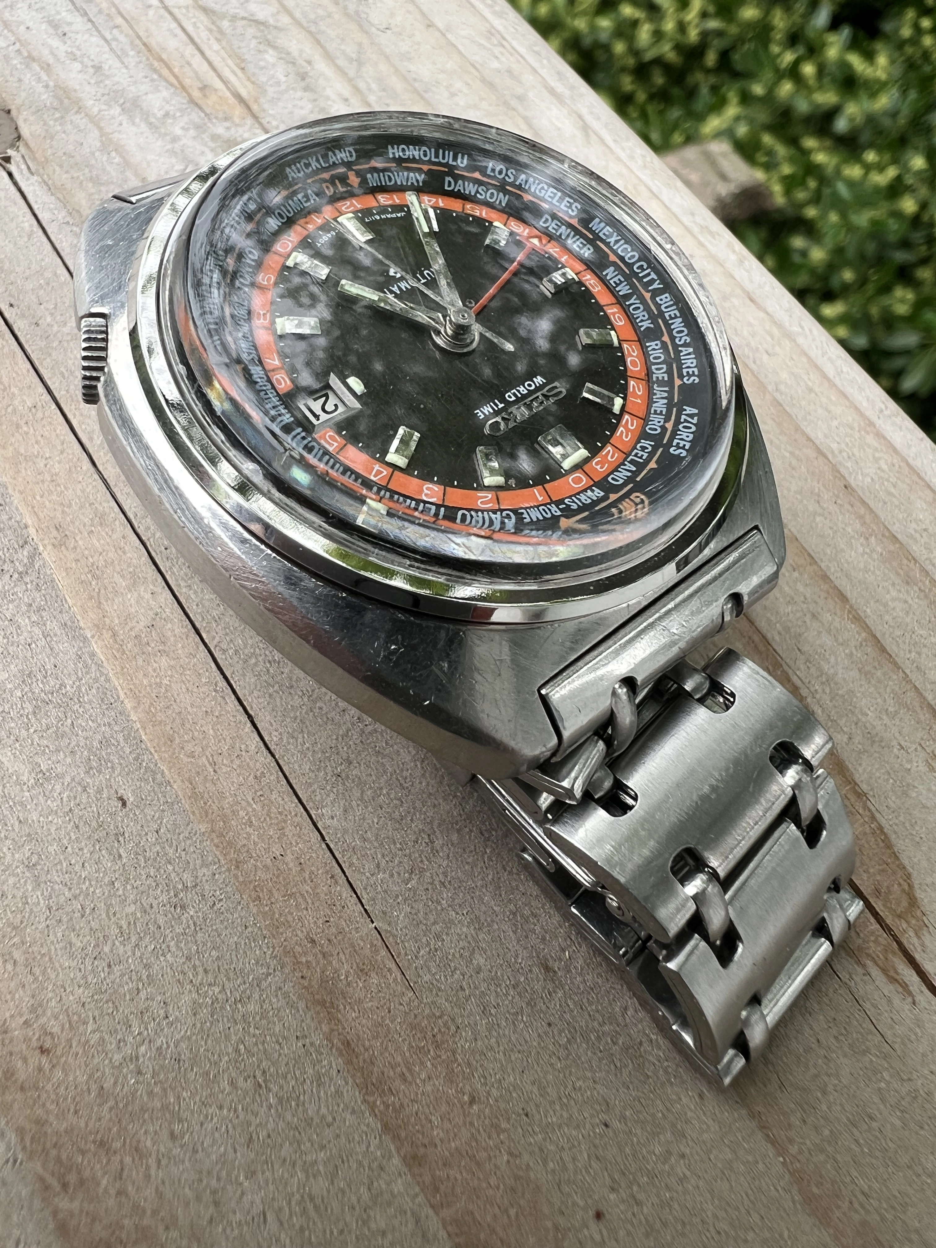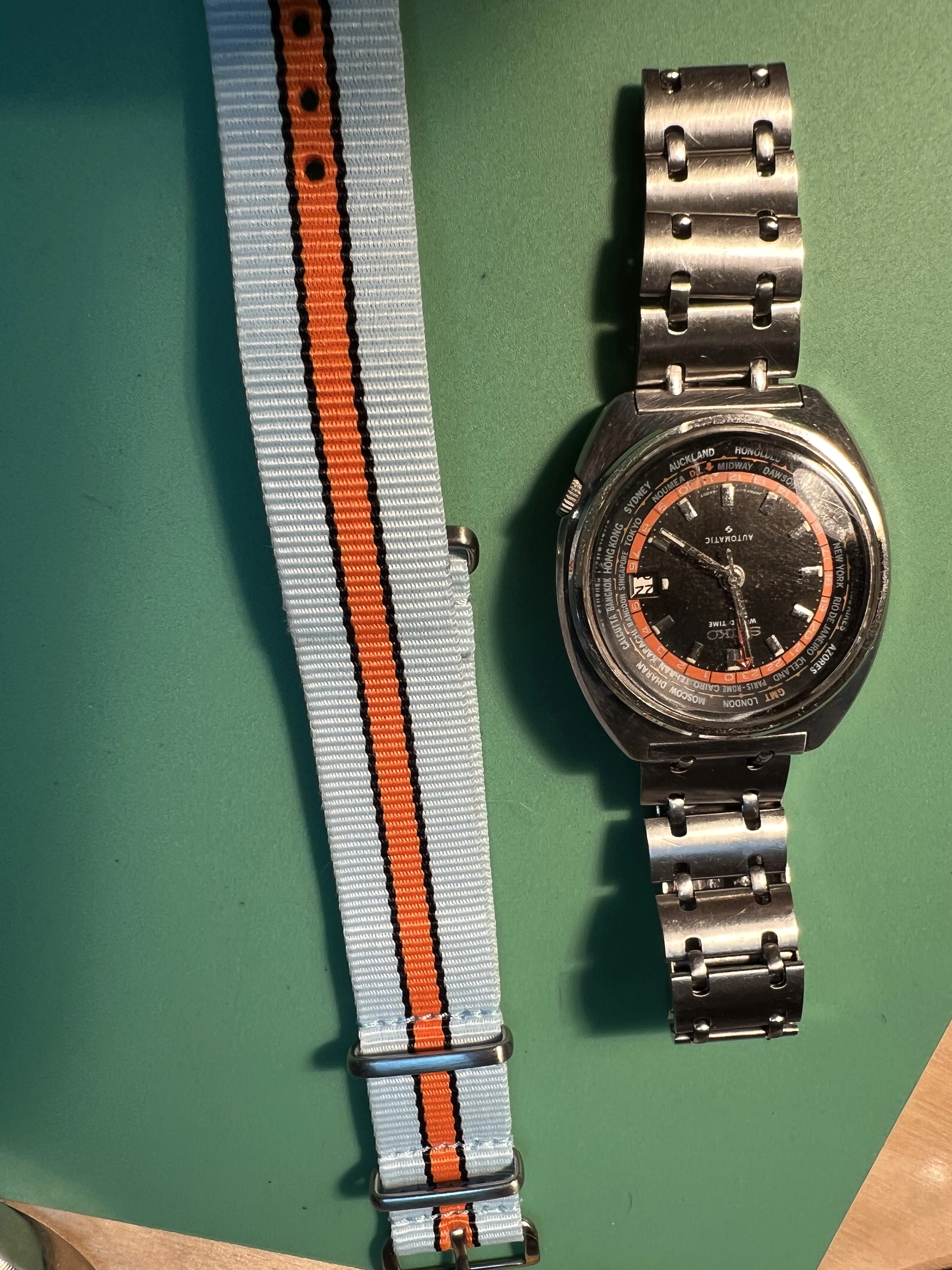 ·Seiko World Time GMT Automatic 6117-6049, with black and orange dial, is a sought after watch for Seiko collectors with rotating inner bezel with cities of the world, and red GMT hand. This one is a nice vintage example with original rail track bracelet. I am thinnning a rather large Seiko collection.