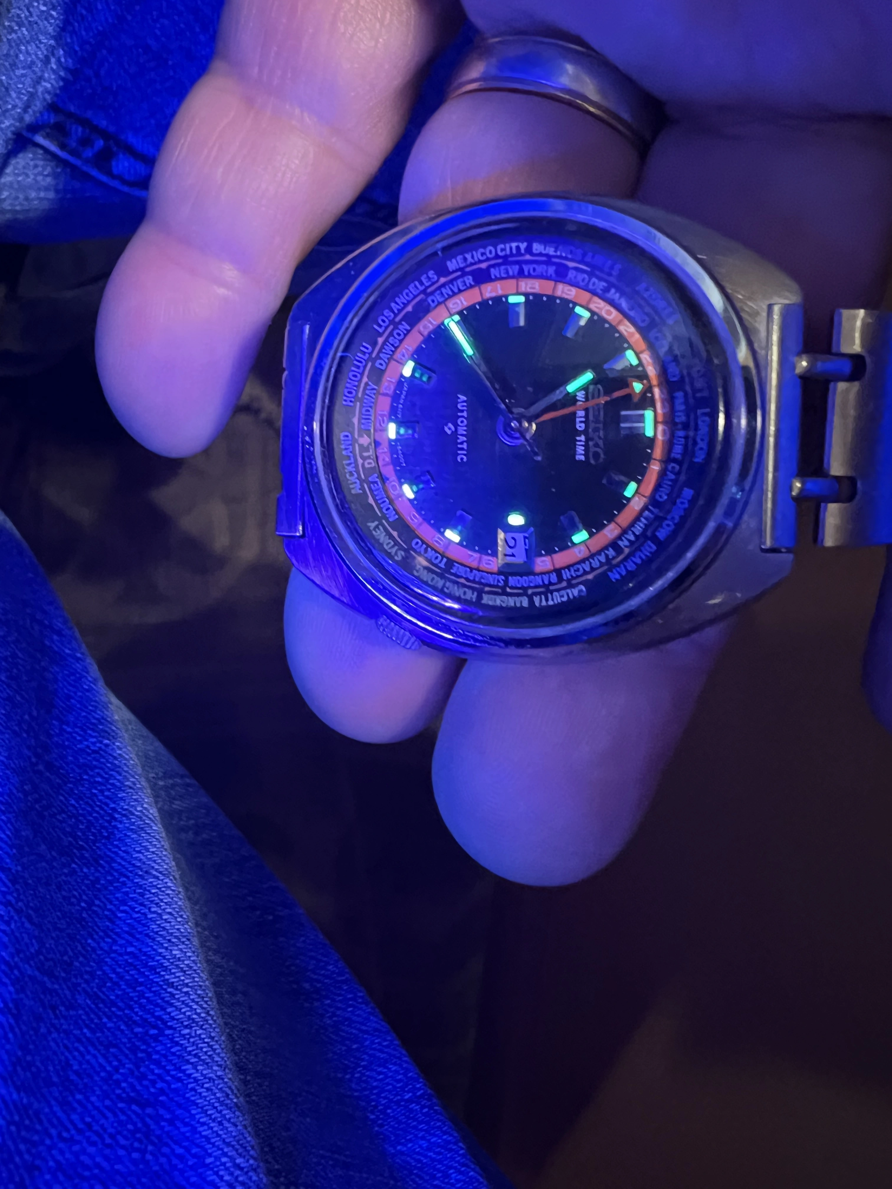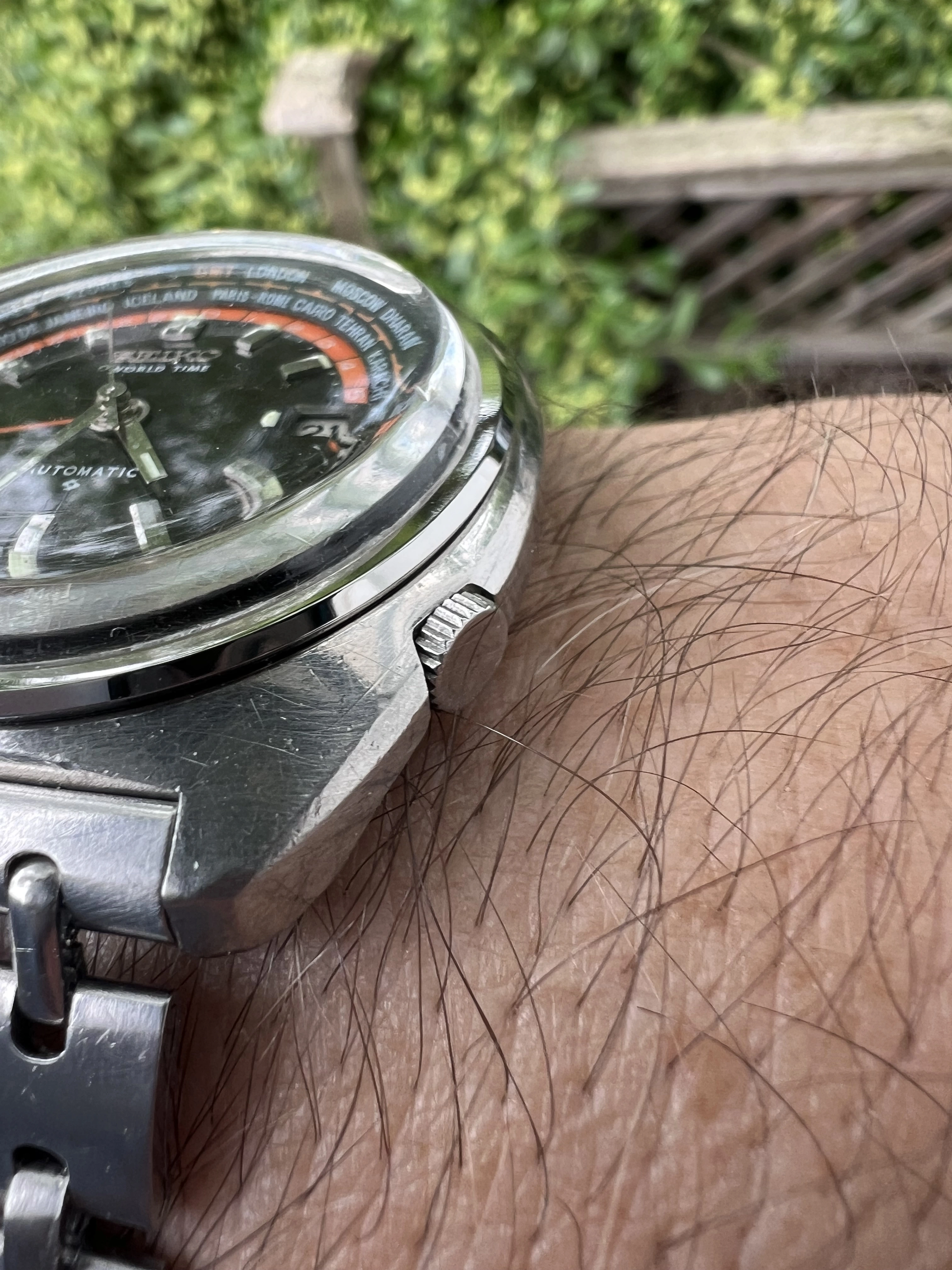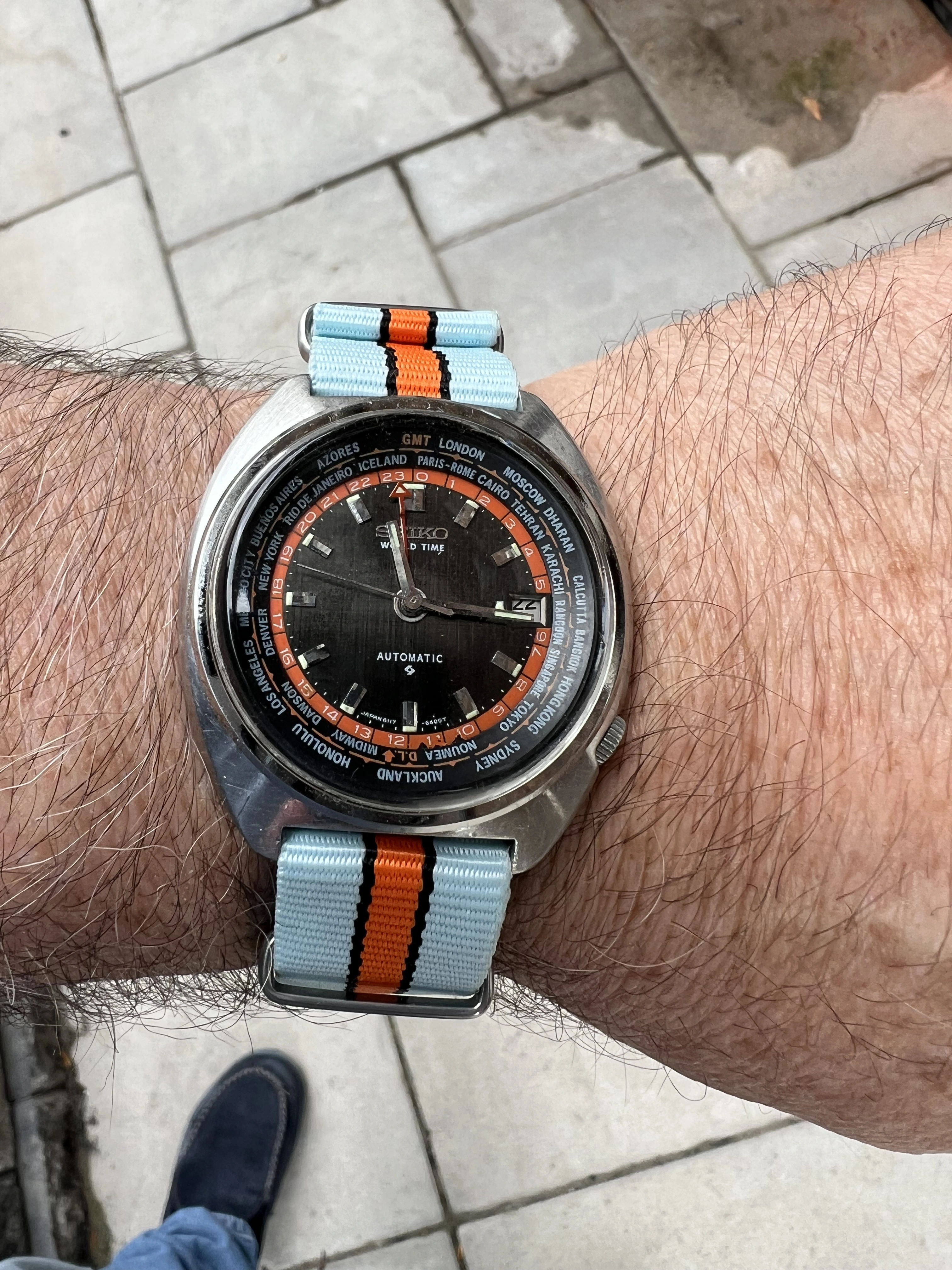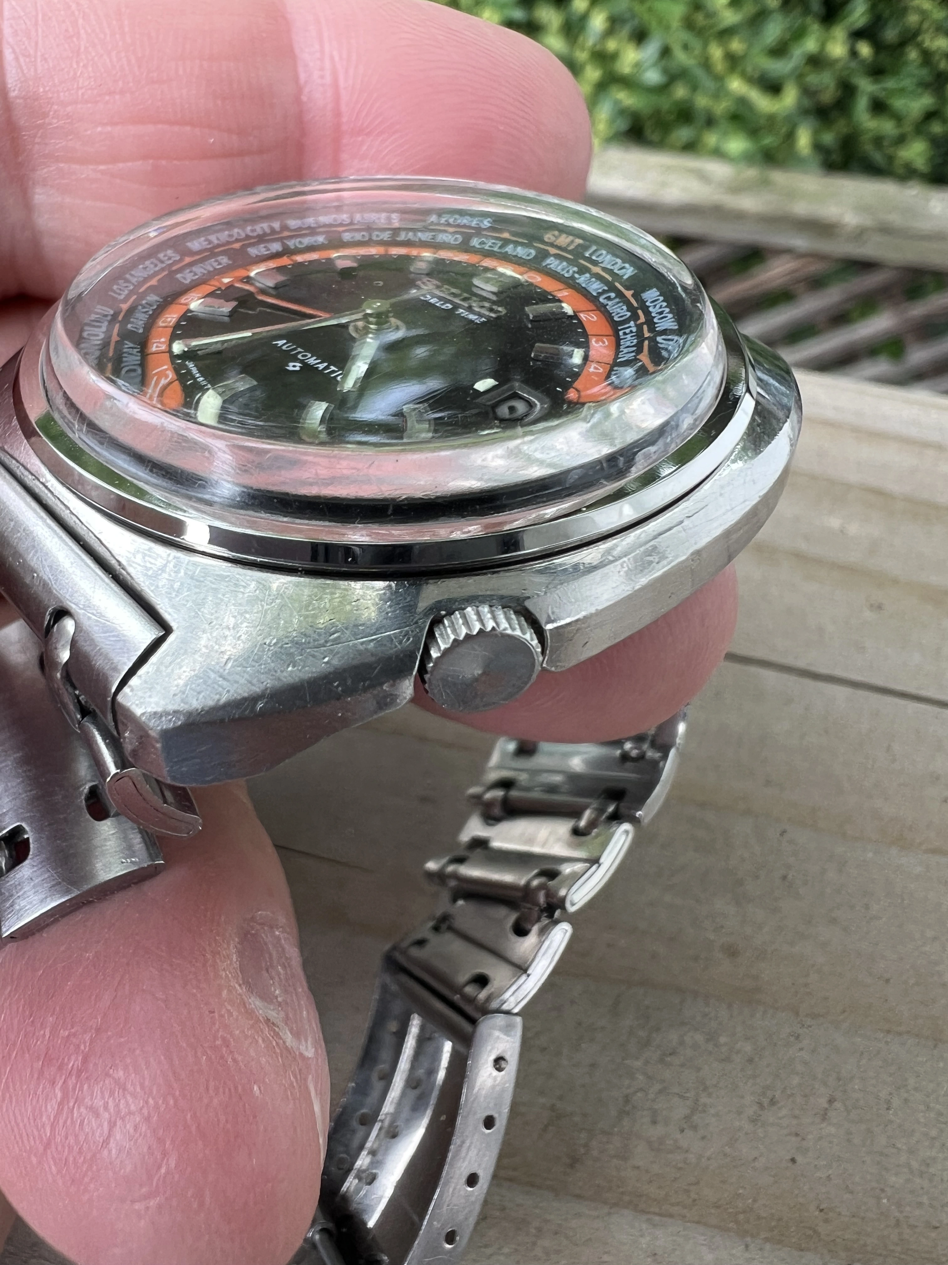·Seiko World Time GMT Automatic 6117-6049, with black and orange dial, is a sought after watch for Seiko collectors with rotating inner bezel with cities of the world, and red GMT hand. This one is a nice vintage example with original rail track bracelet. I am thinnning a rather large Seiko collection.
