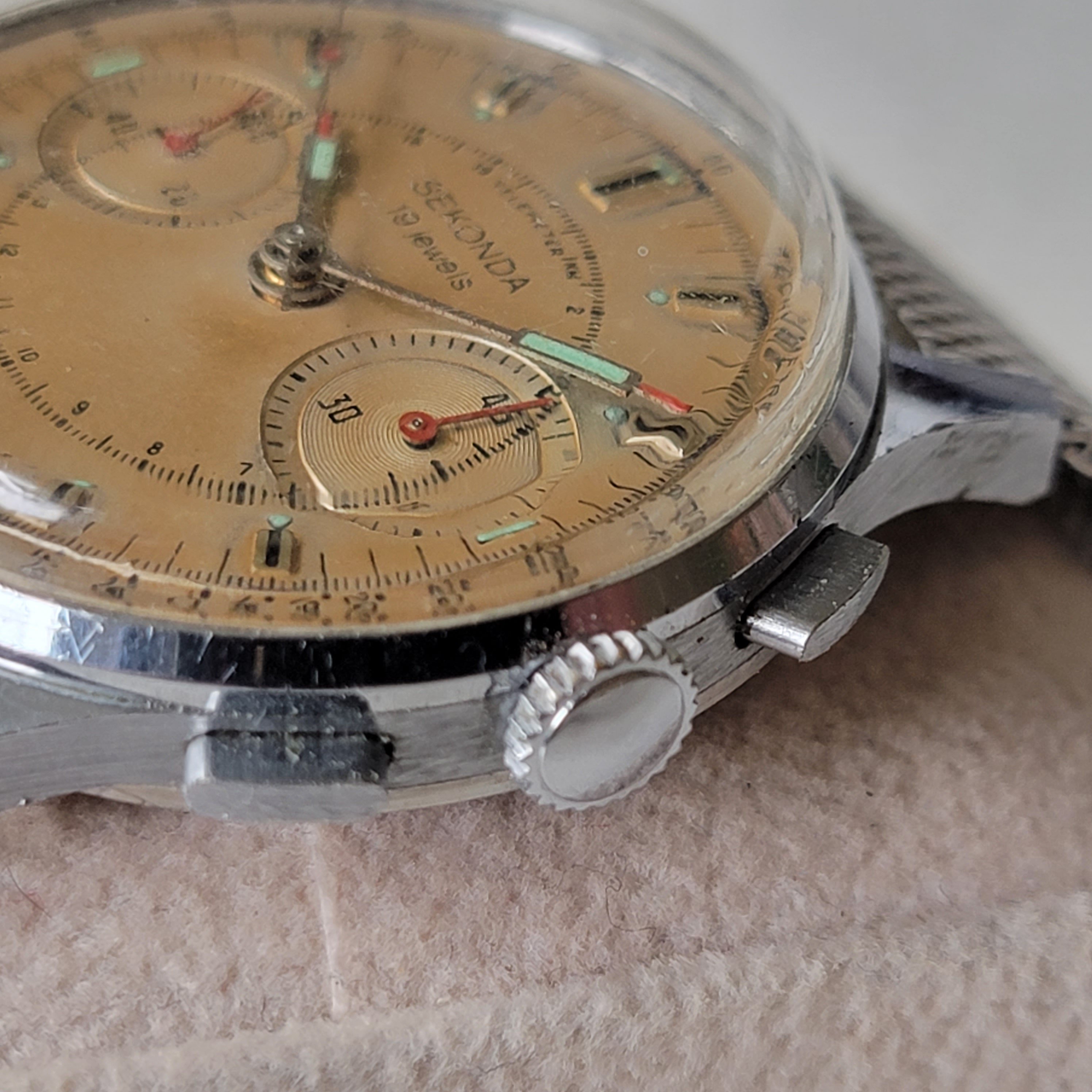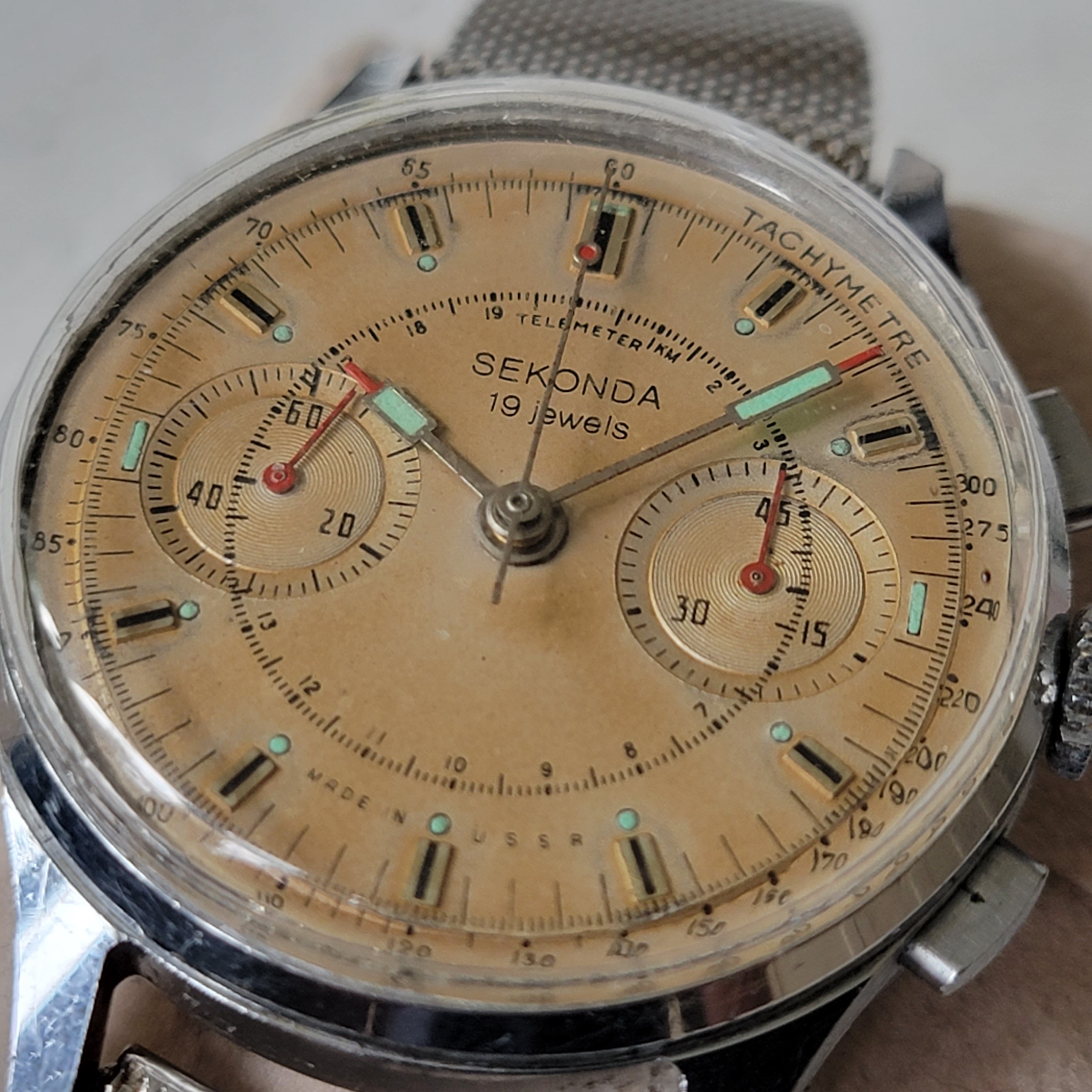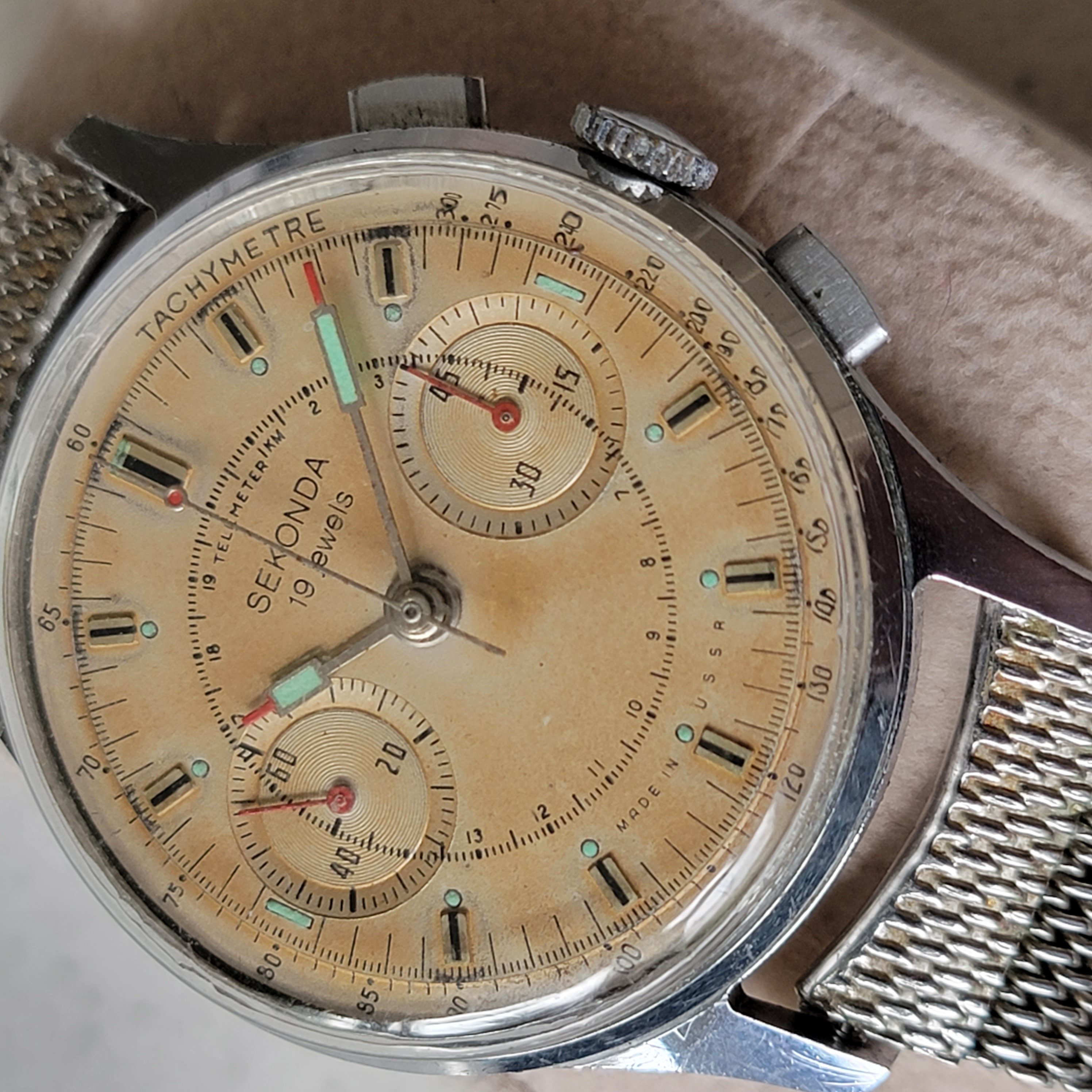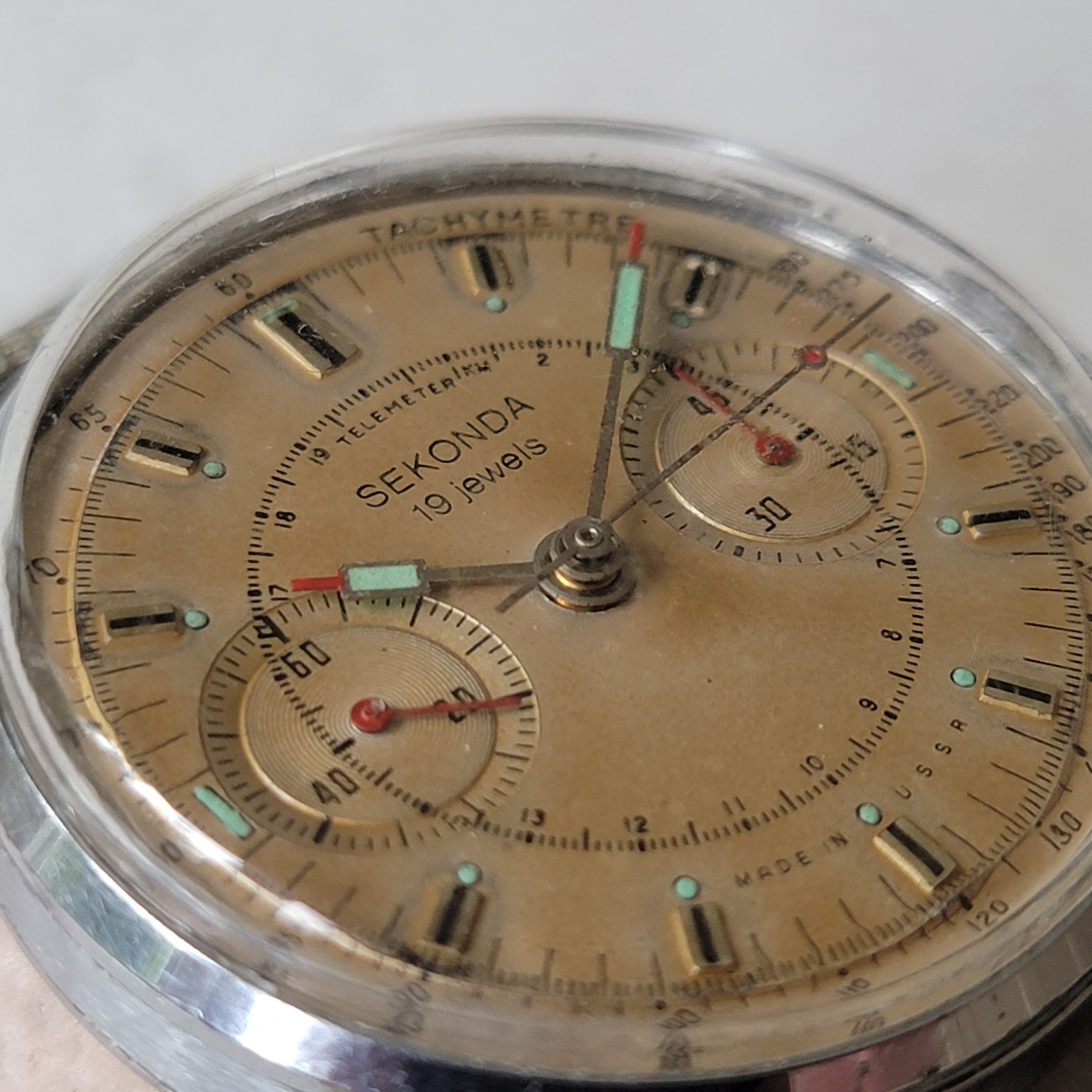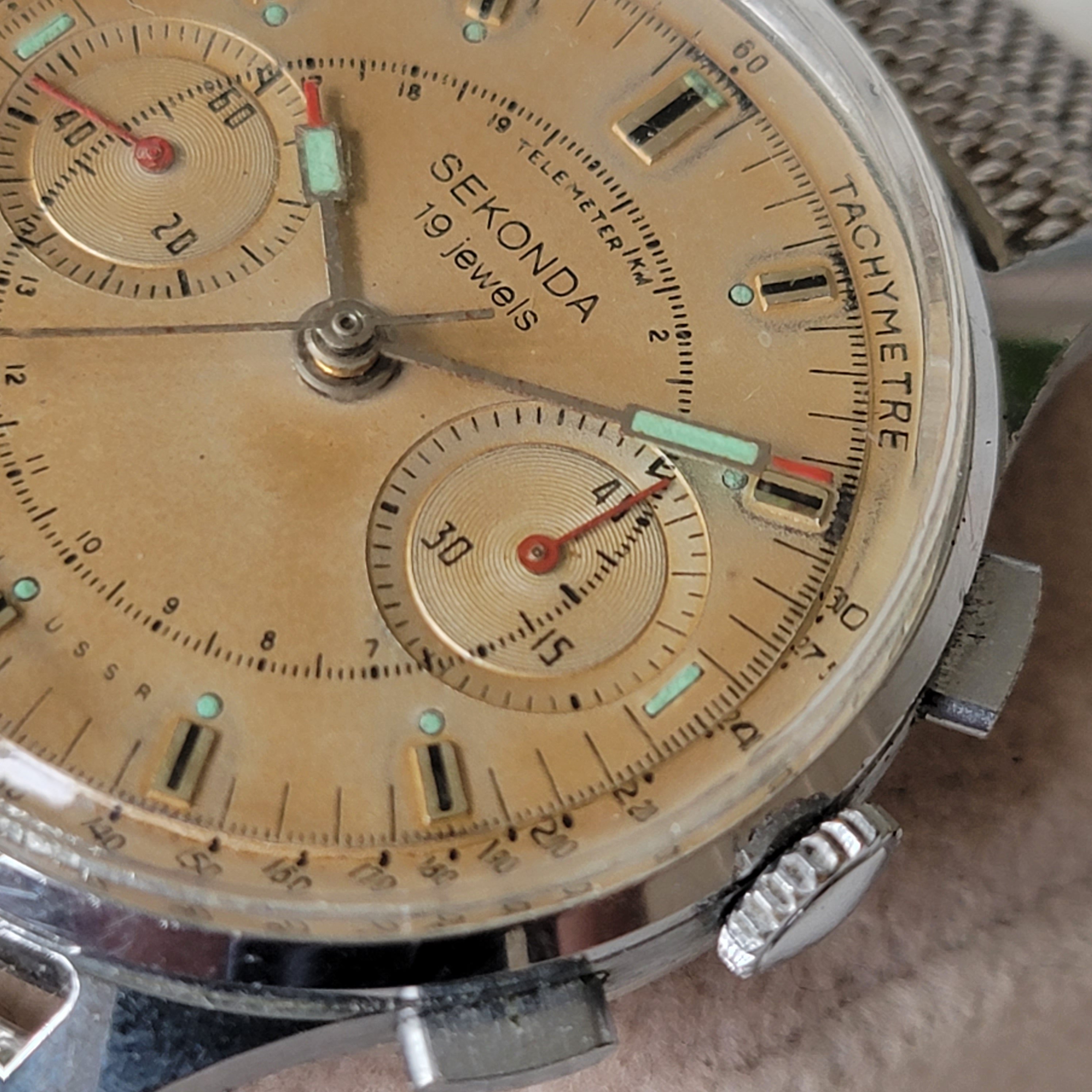 Sekonda was a brand established to market Russian watches to UK buyers. This watch has a Russian-made 3017 caliber column wheel chronograph movement, which I read was based on the Swiss Venus 150 movement. These 3017 caliber watches were said to have been manufactured for Soviet pilots between the years 1959 and 1979 and were available under the Strela, Poljot and Sekonda labels. The chronograph has a very smooth and satisfying feel when activated and reset.