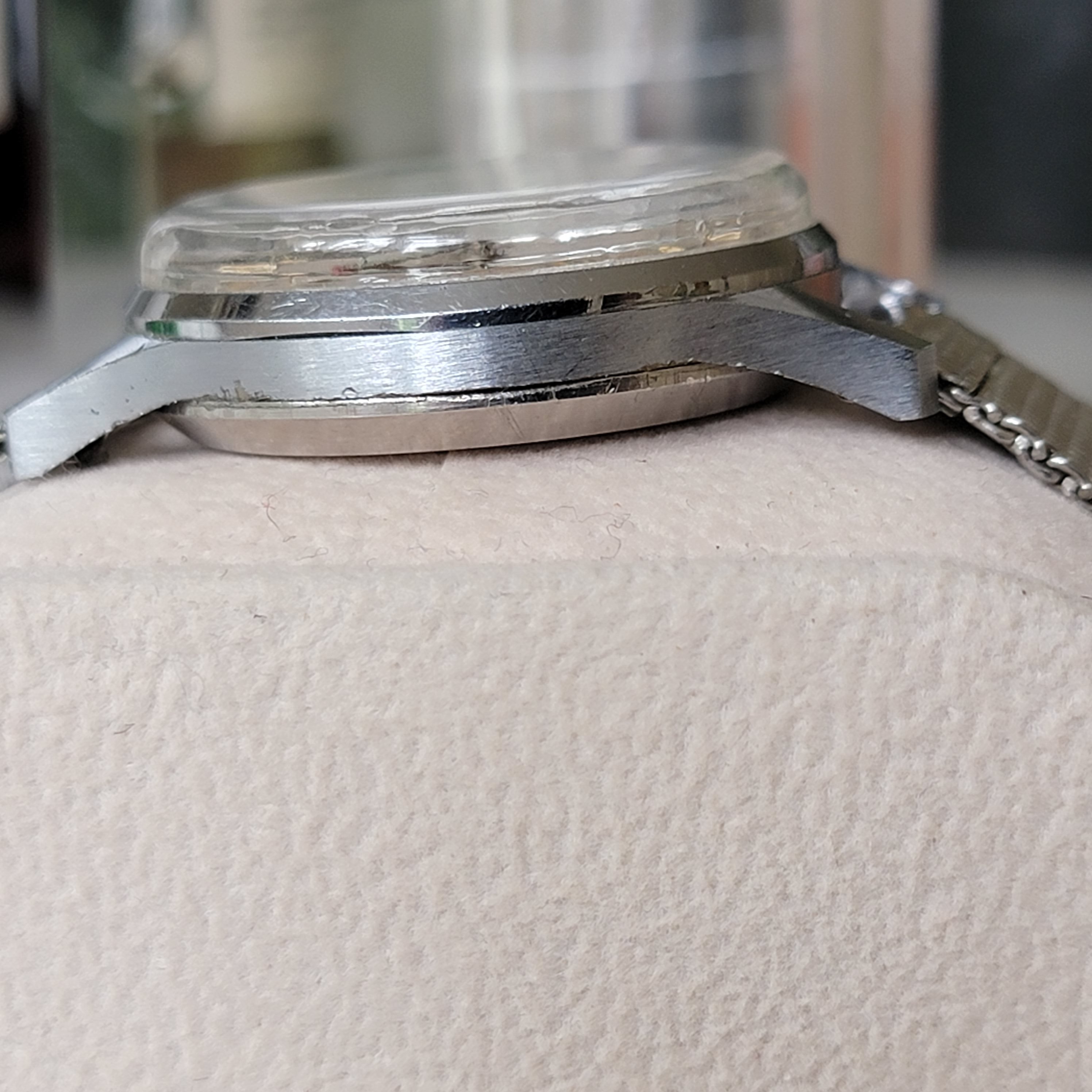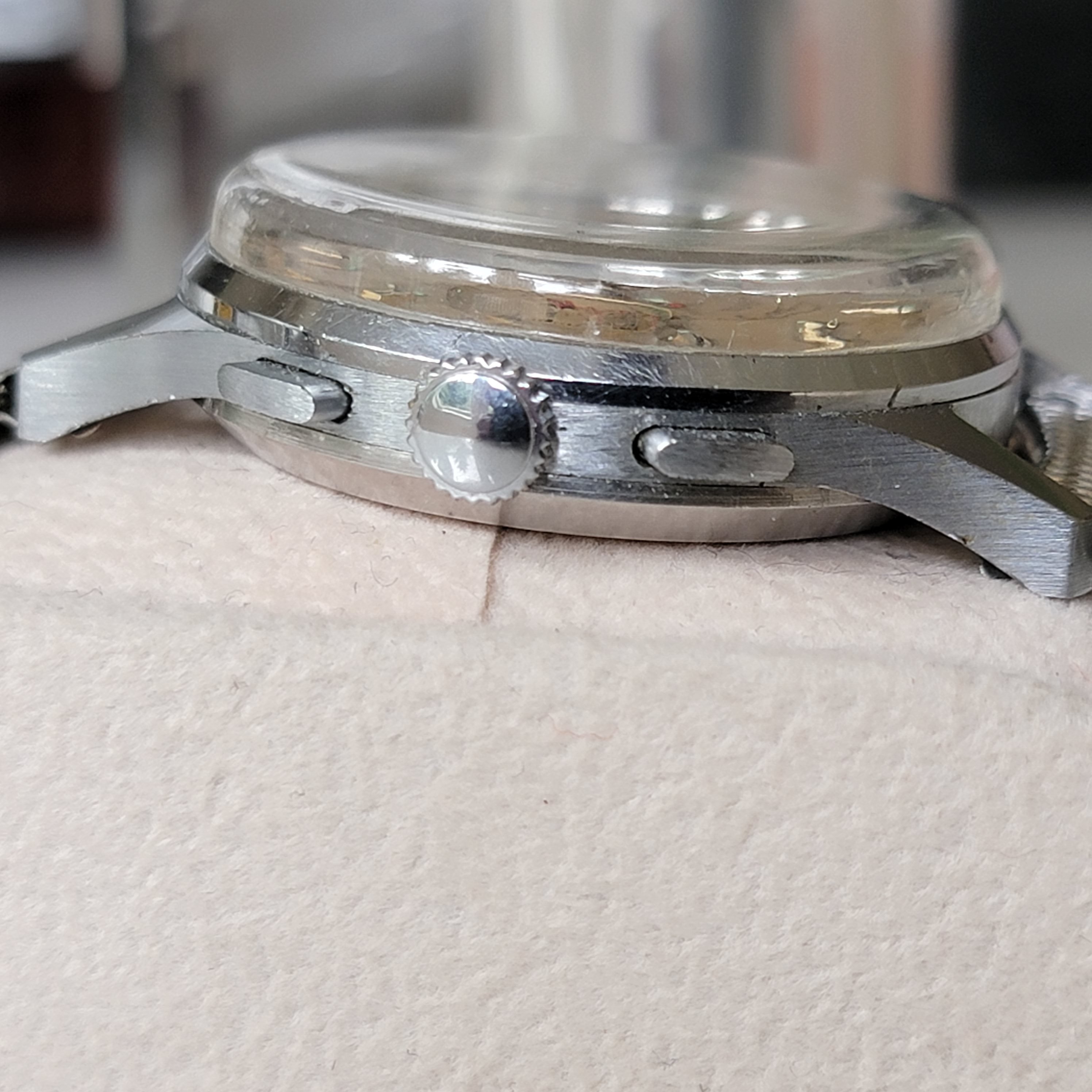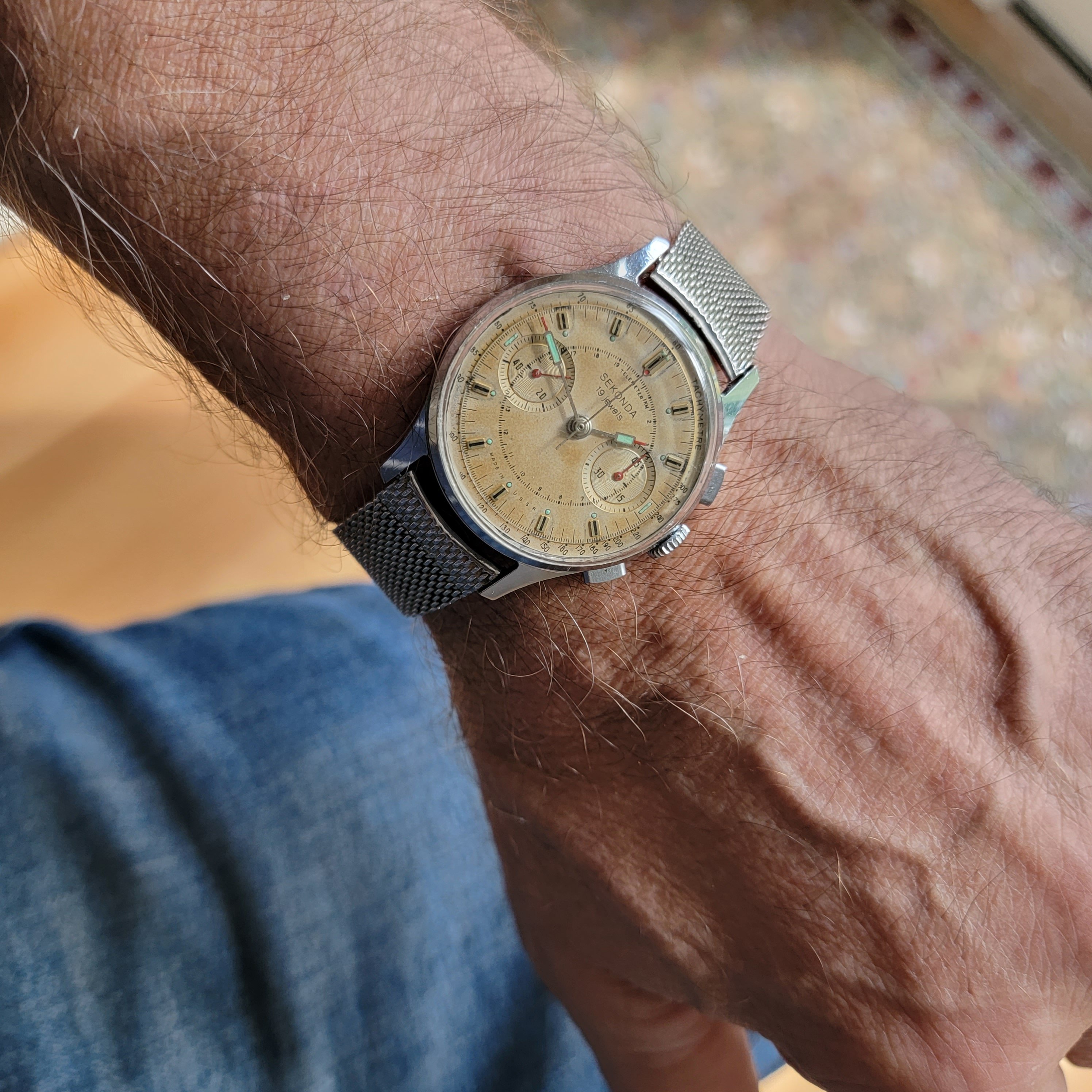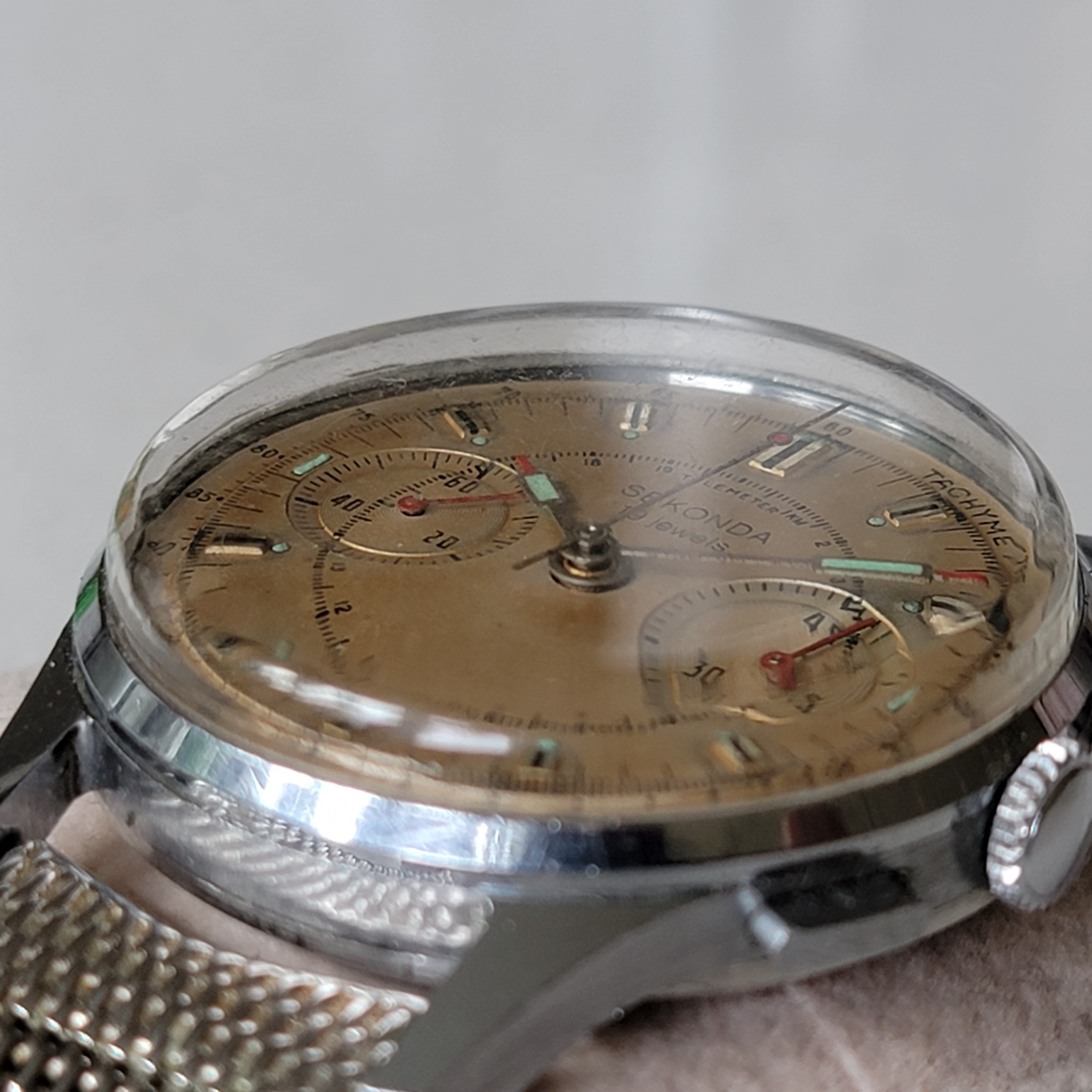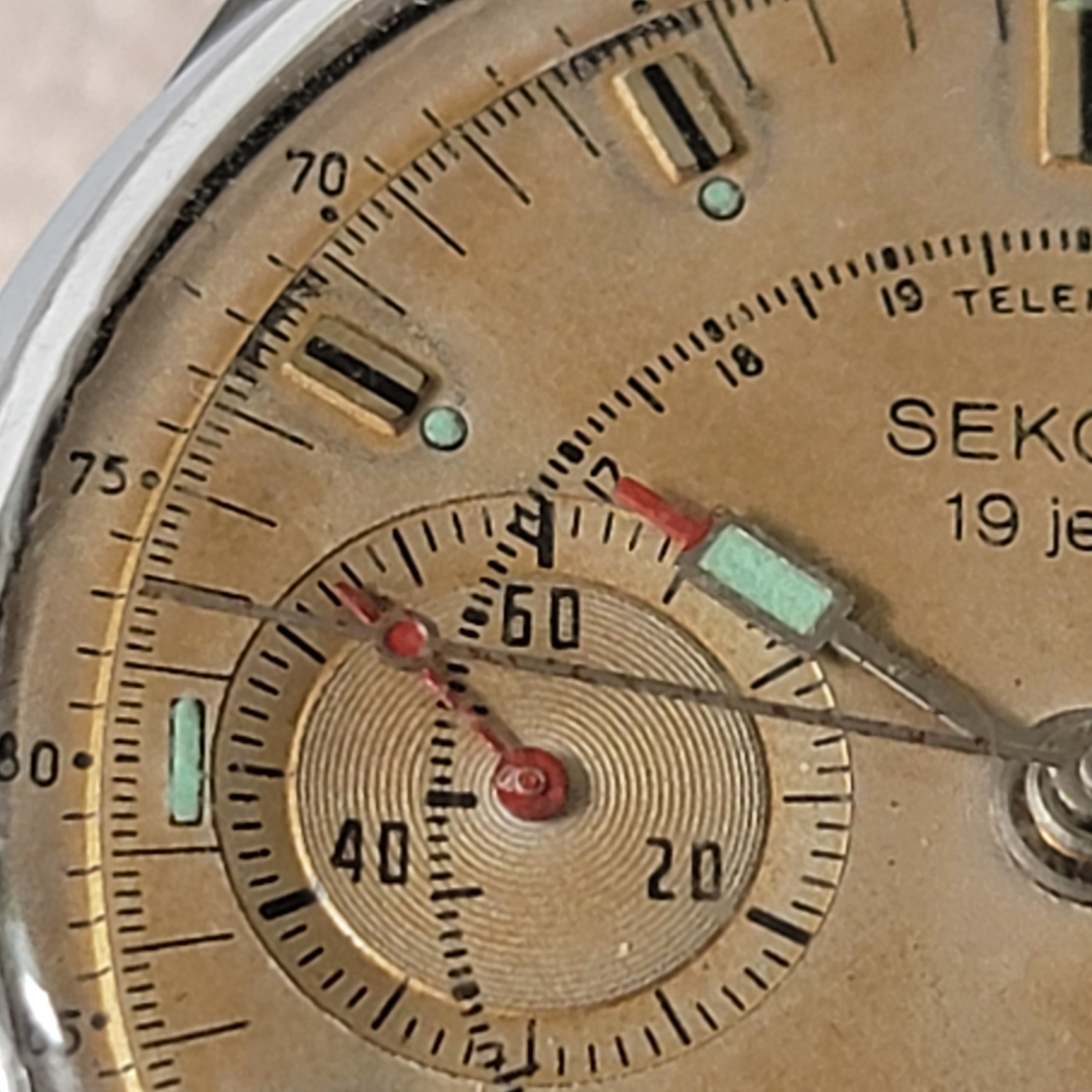 Sekonda was a brand established to market Russian watches to UK buyers. This watch has a Russian-made 3017 caliber column wheel chronograph movement, which I read was based on the Swiss Venus 150 movement. These 3017 caliber watches were said to have been manufactured for Soviet pilots between the years 1959 and 1979 and were available under the Strela, Poljot and Sekonda labels. The chronograph has a very smooth and satisfying feel when activated and reset.