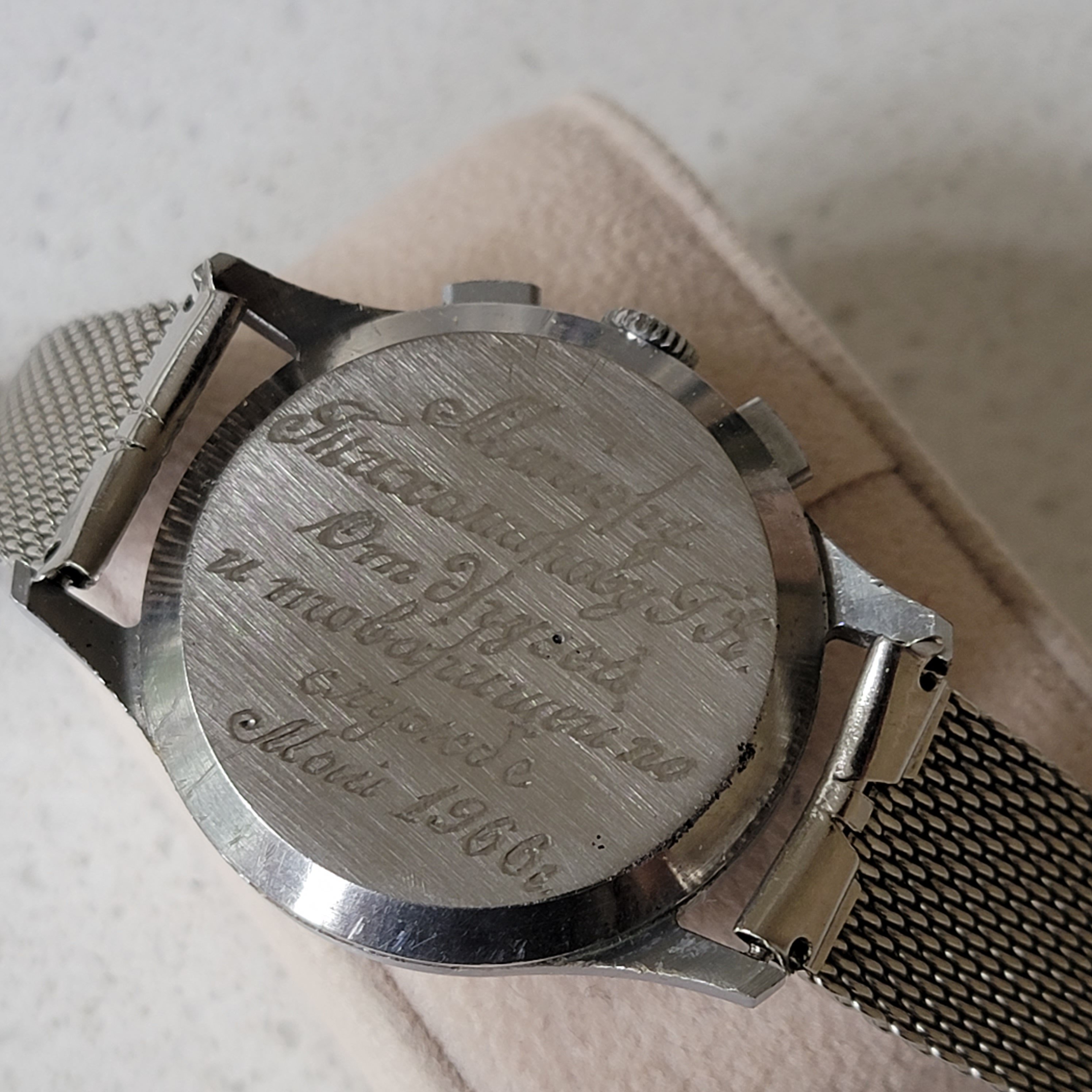 This brings us to this watch. It has a Russian inscription on the back, which when translated to English states: "To Major Tikhomirov from friends and comrades by service. May 1966 year."