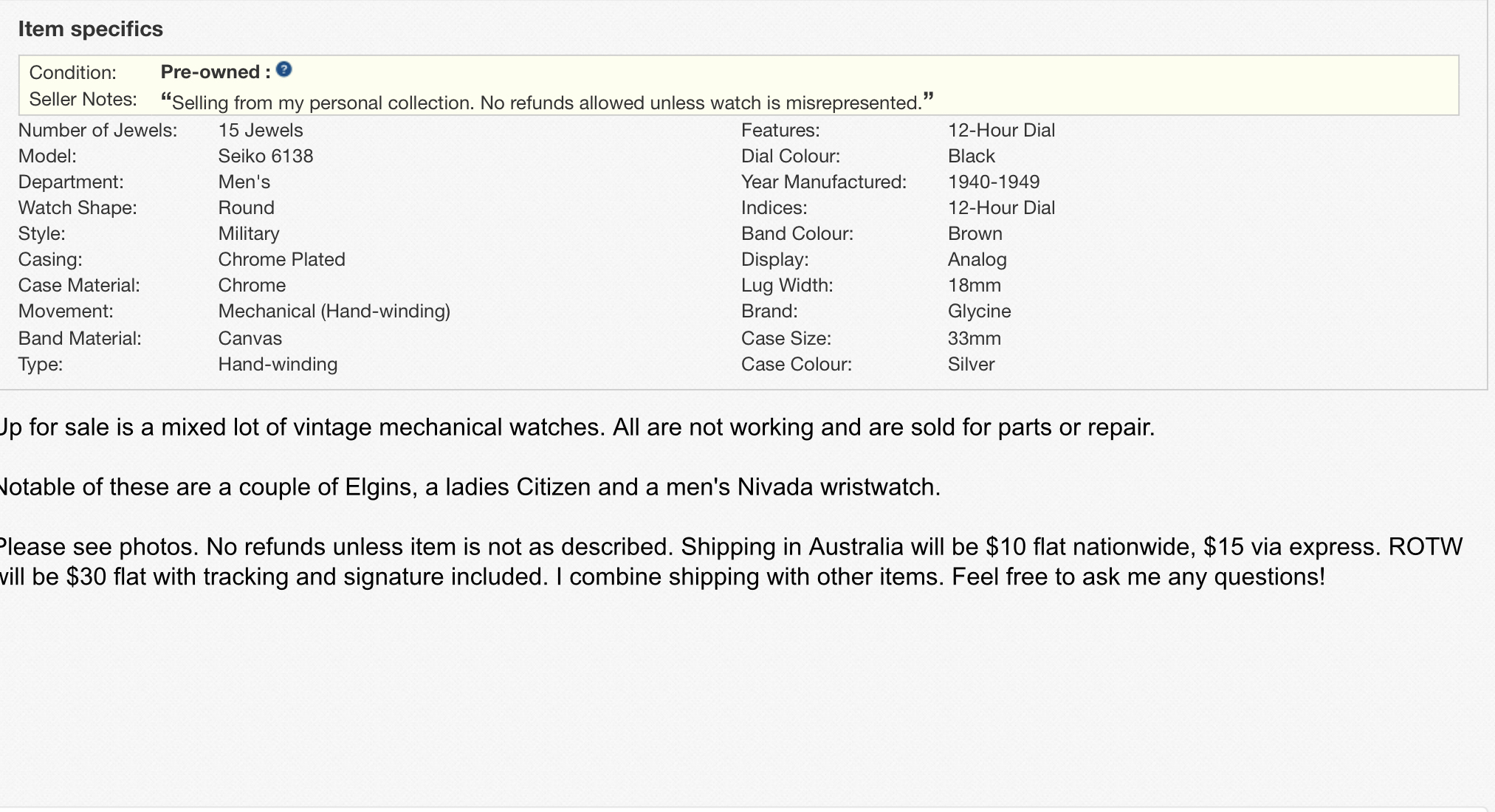 2) Asking me if any of the watches were broken or missing parts. I responded that the photos showed if visible parts were missing and/or the fact I listed the watches as a job lot would be enough for that