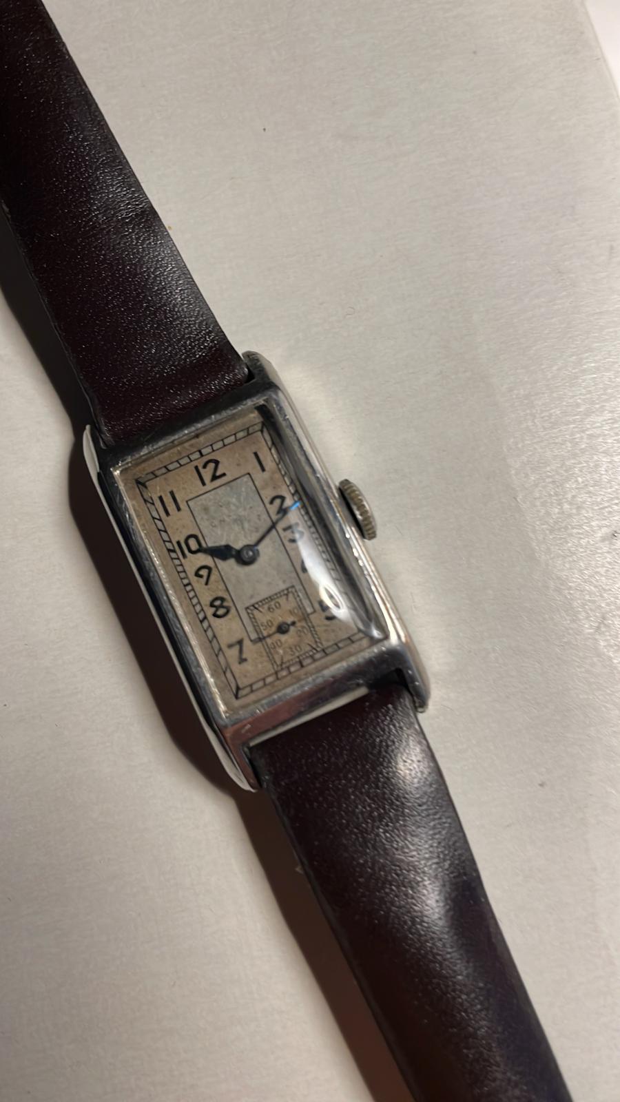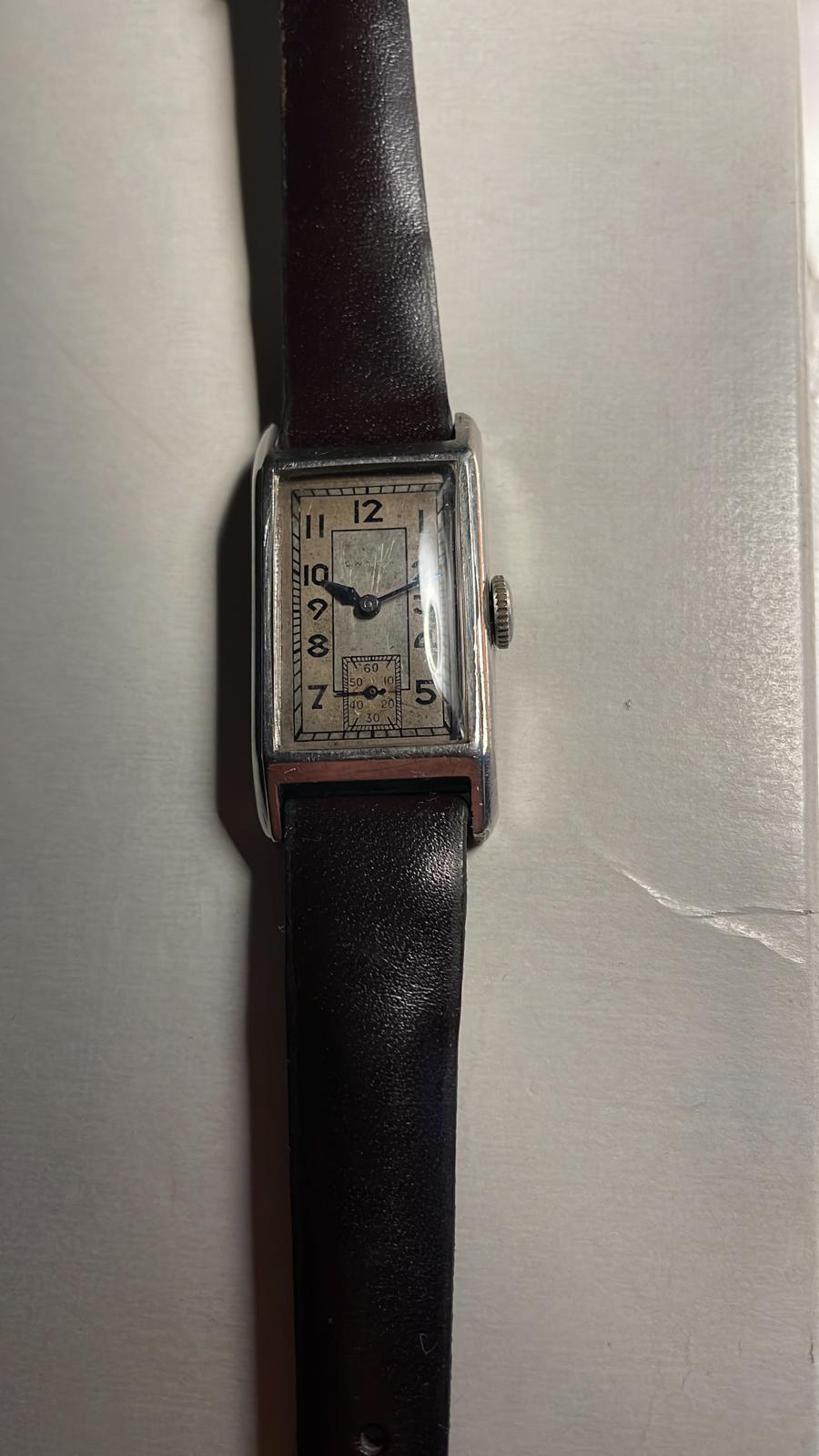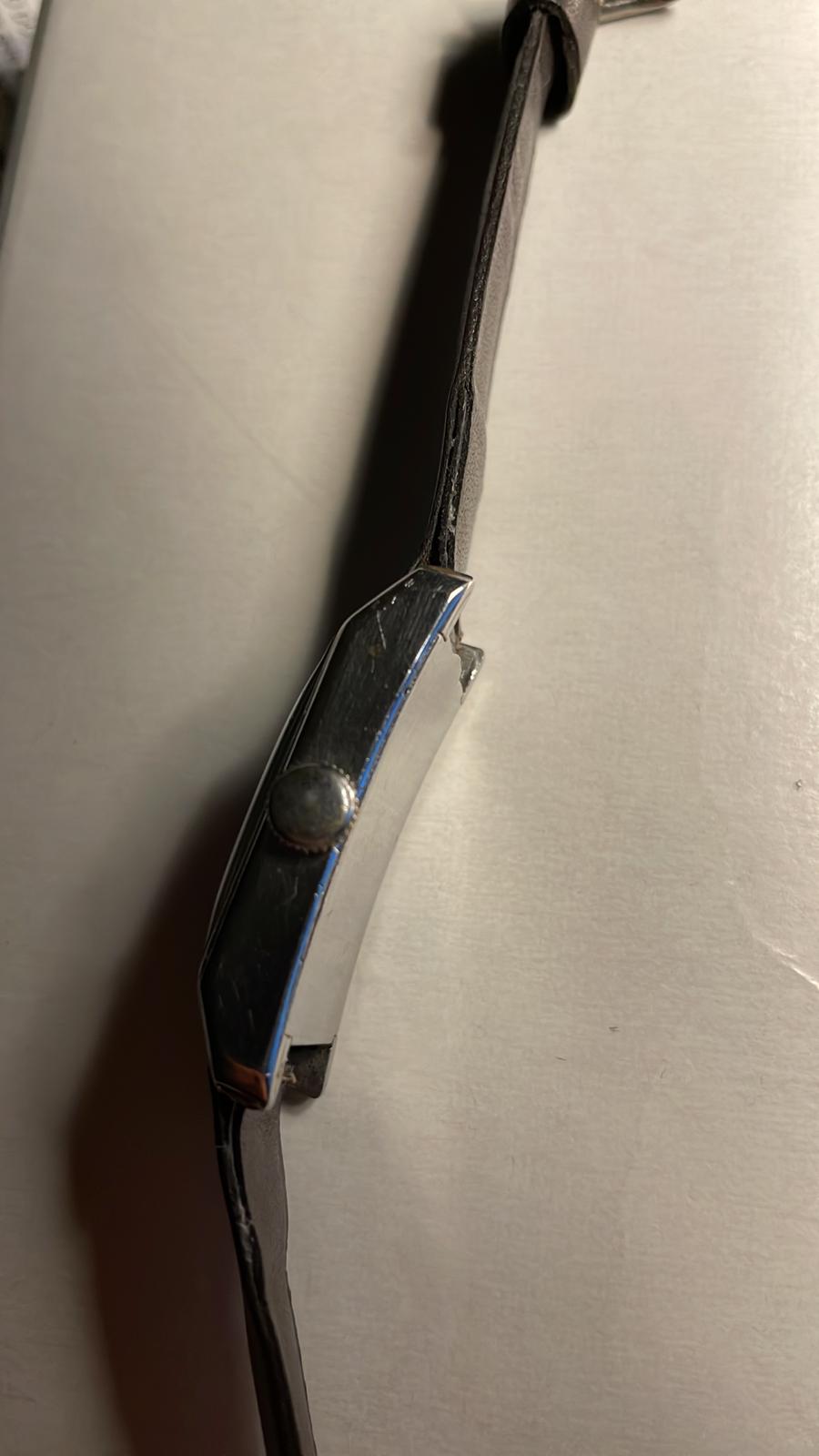 As for the watch, I'll give it a shot based on the limited photos. I believe this is known as a left-crown-tank, commonly referred to as an L 8 6 01, for obvious reasons, manufactured for the Southern Hemisphere market. These are rarely found in the wild and I would recommend having it serviced by a qualified watchmaker.