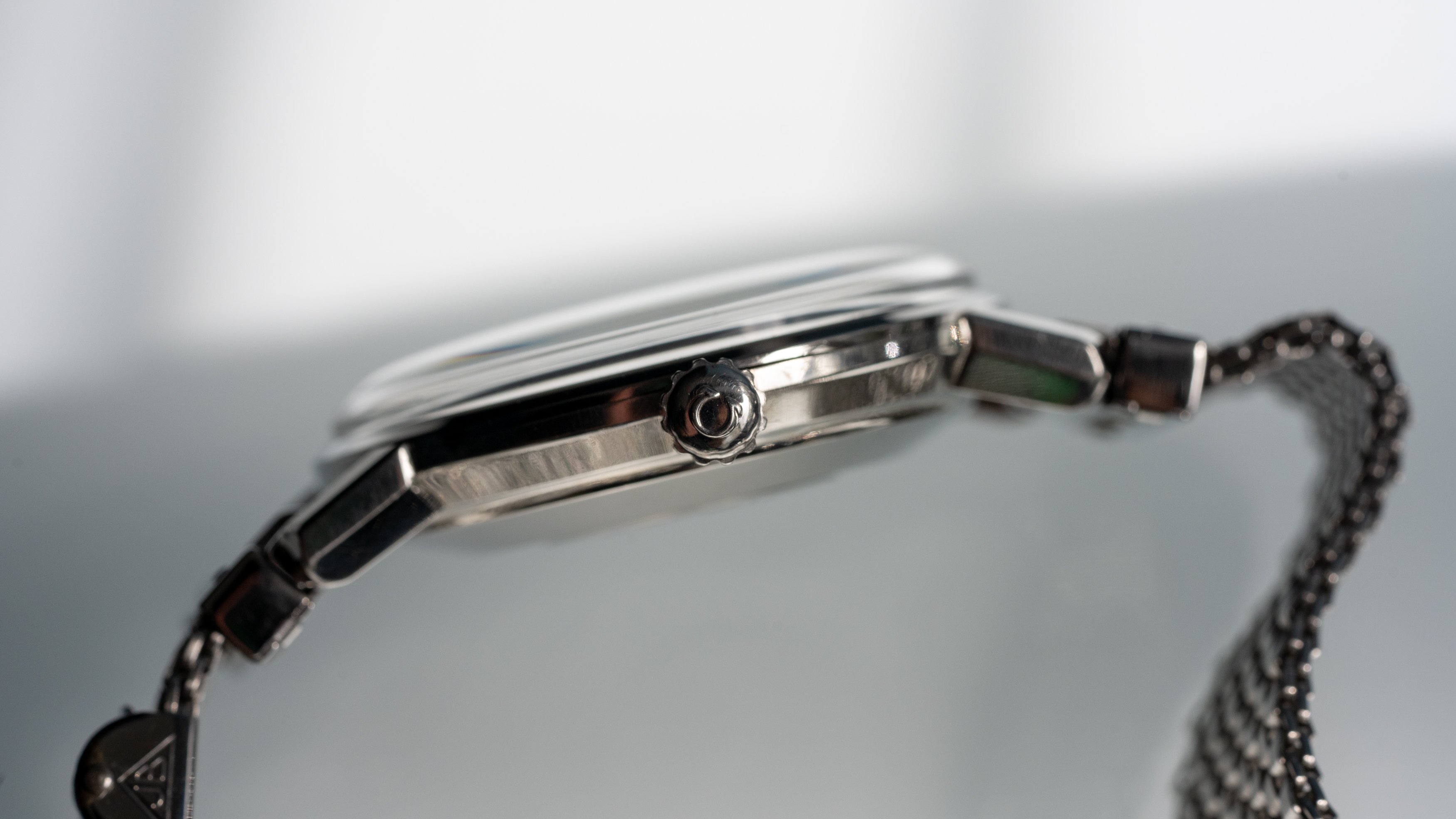 Case: The elegant monocoque case is in pretty good condition, with light scratches and tiny dings on the top left lug. All original contours and edges are present. Simple and subtle.