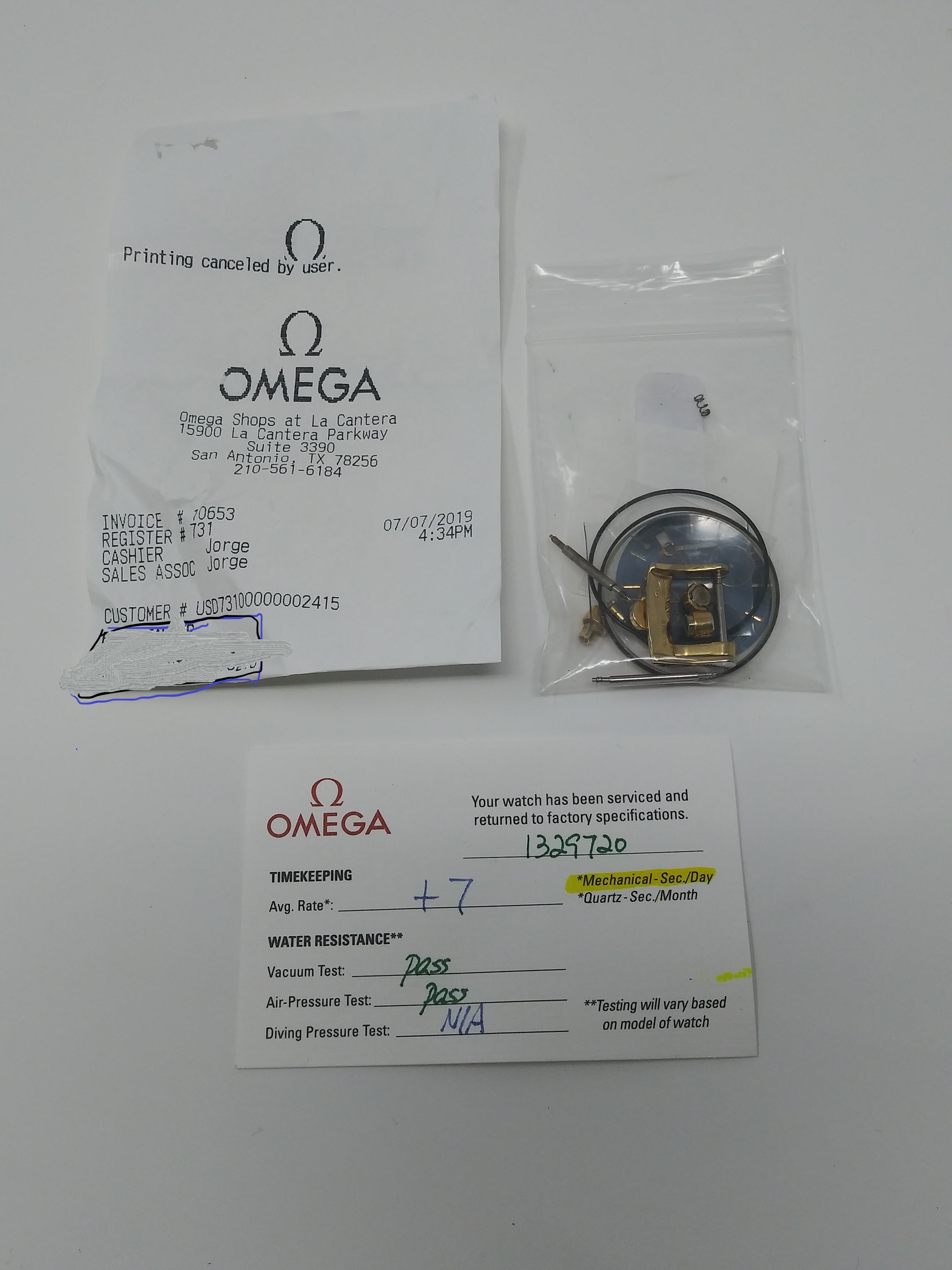 It was serviced by Omega in 2019 and has the remainder of the 2 year warranty. Dial and hands were replaced during service. Record of service and all replaced parts are included with the sale. Watch comes with, what I believe to be, the original inner and outer box.