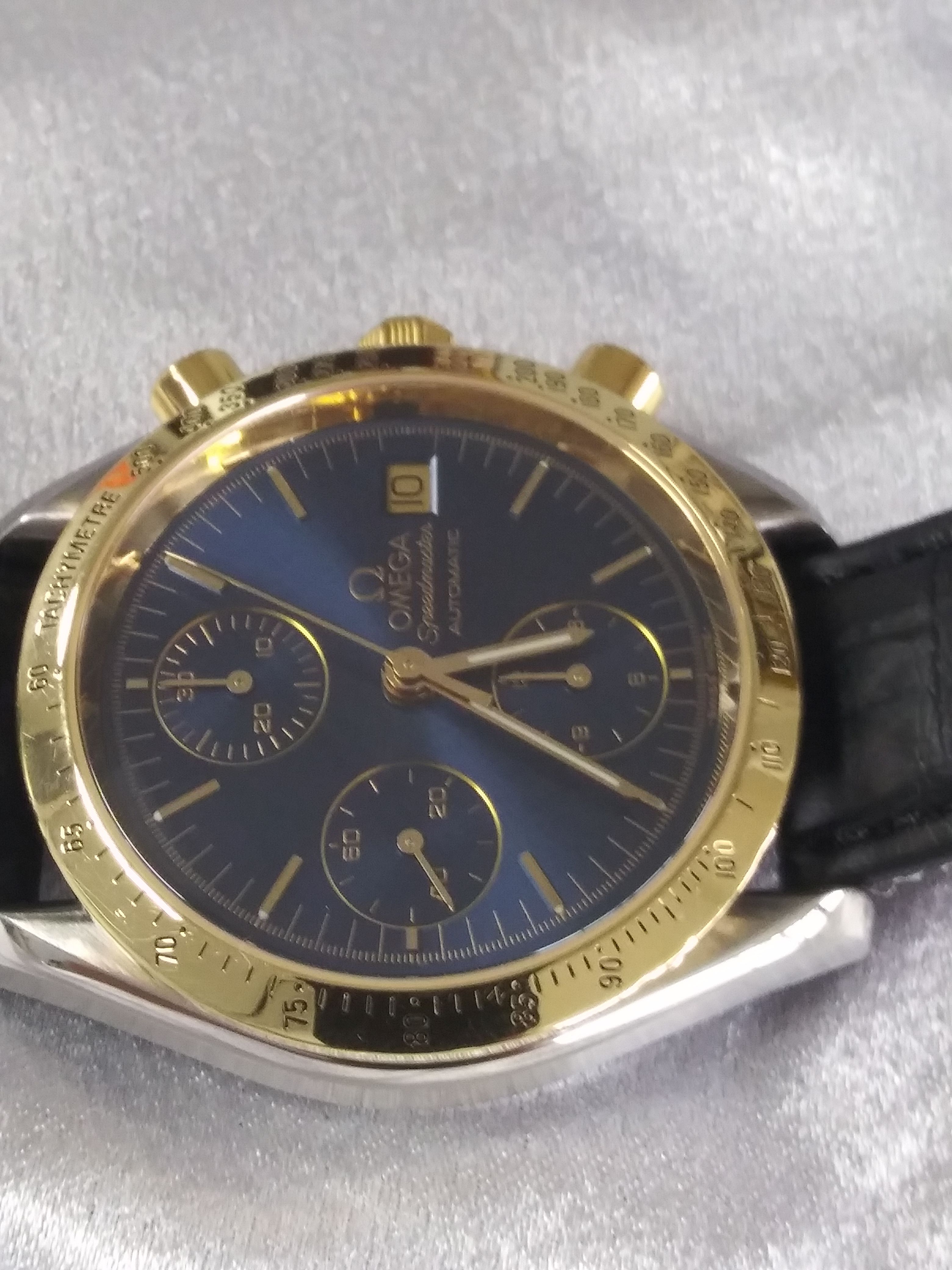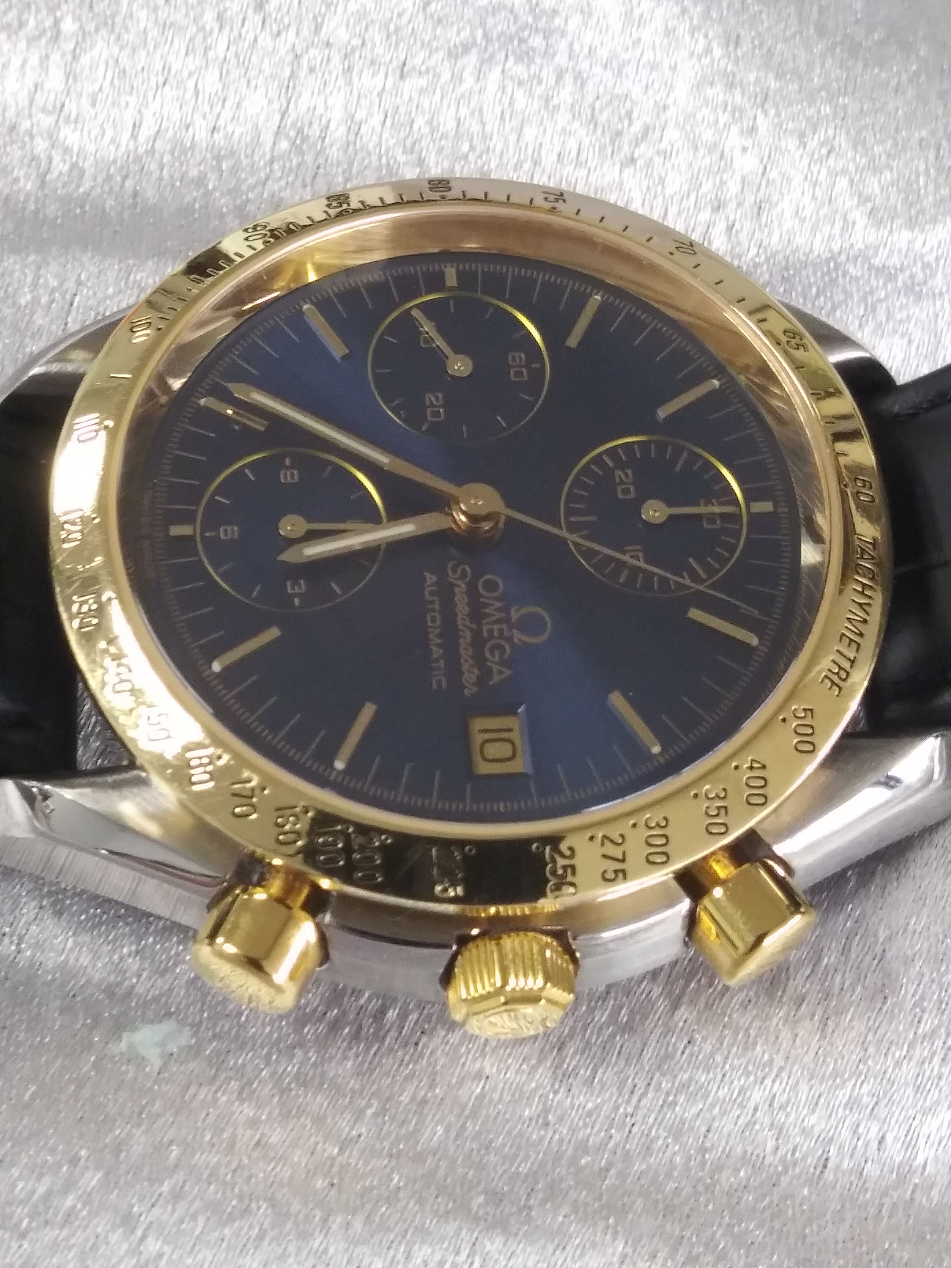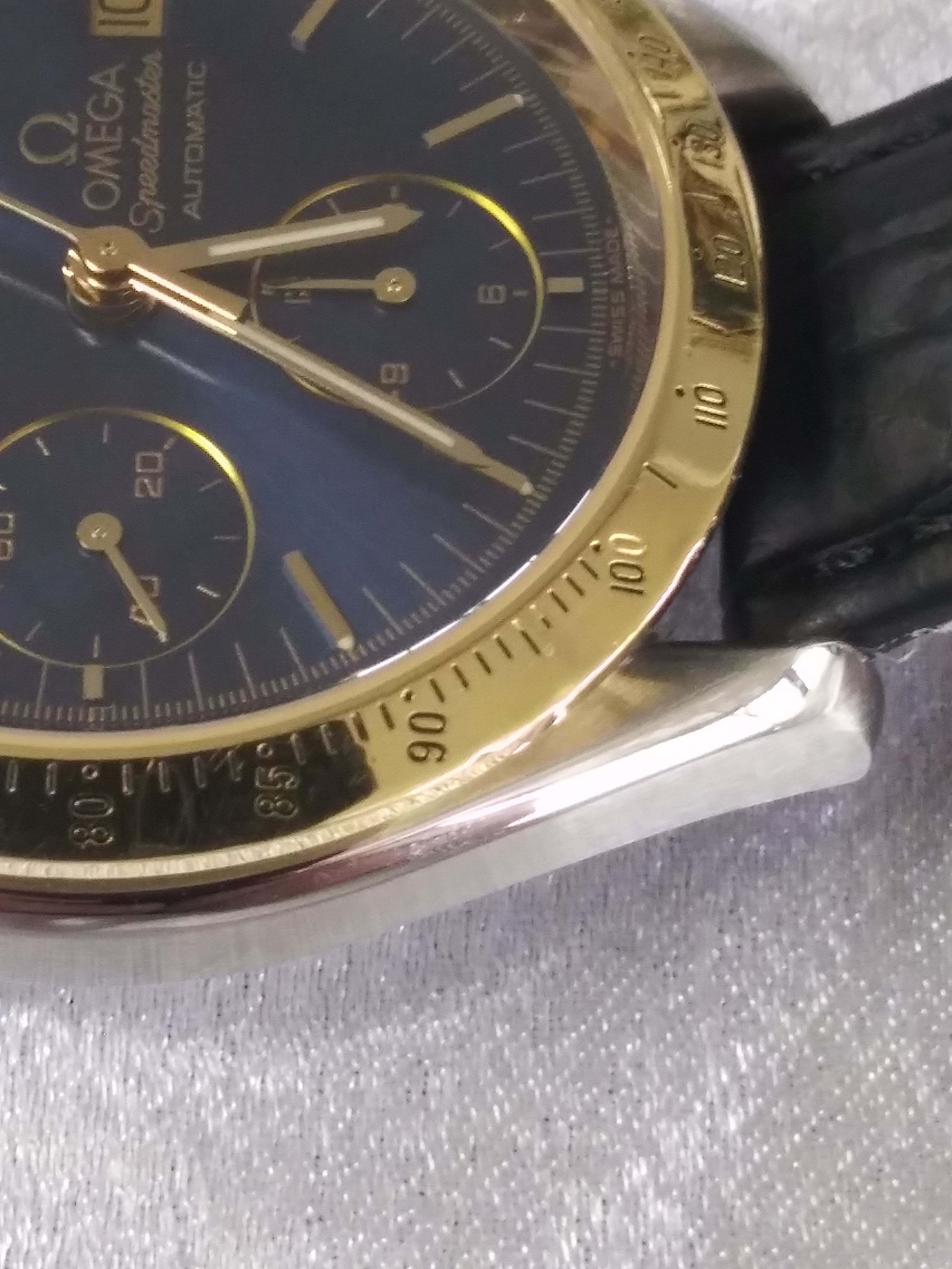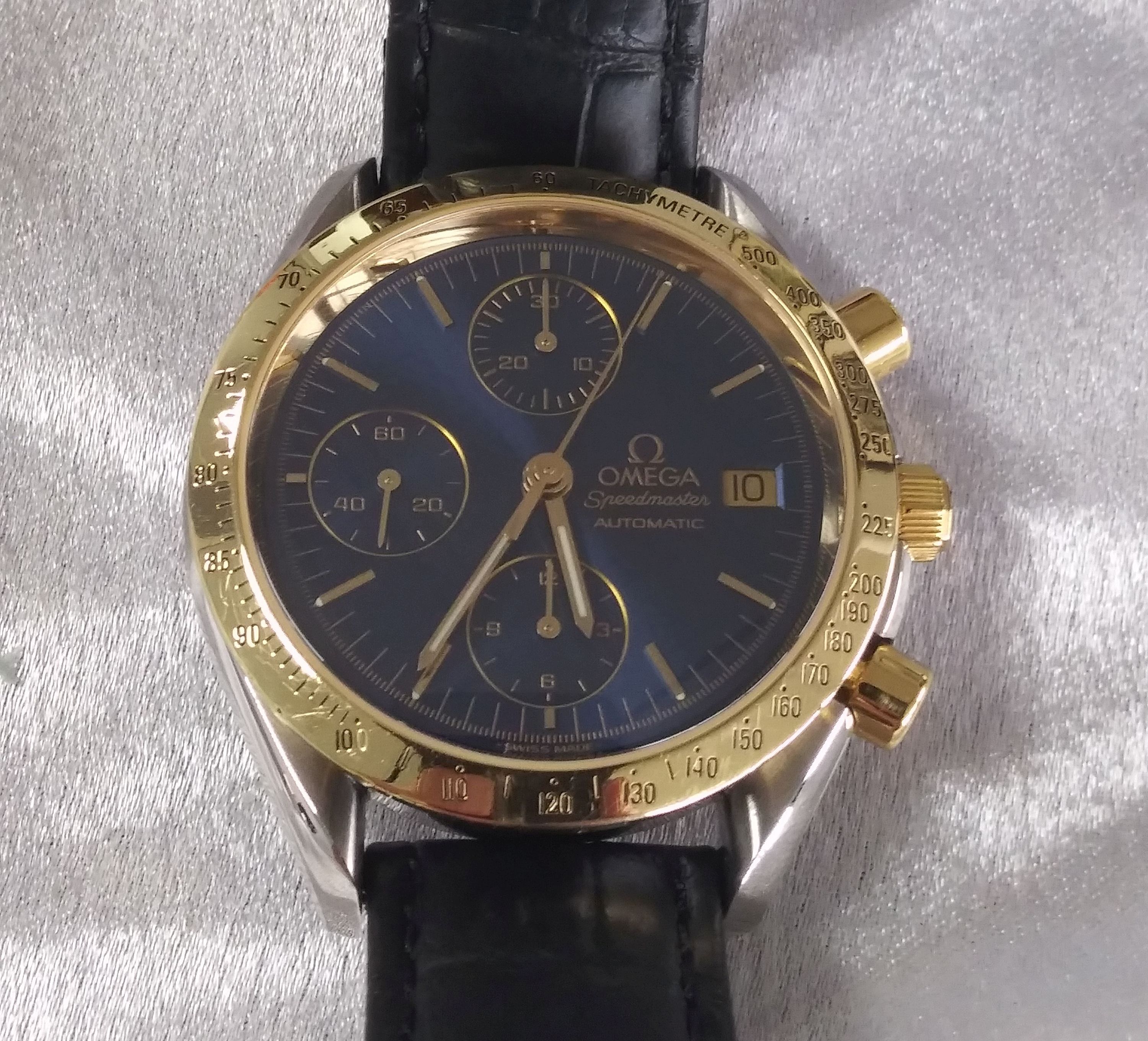 ·Up for sale is this beautiful Omega Speedmaster Date with automatic caliber 1155 movement. The watch comes on an 18mm black leather Omega strap with Omega gold buckle. The 39mm Stainless Steel case has an 18k yellow gold bezel. There are dings and scratched from nearly 20 years of wear.