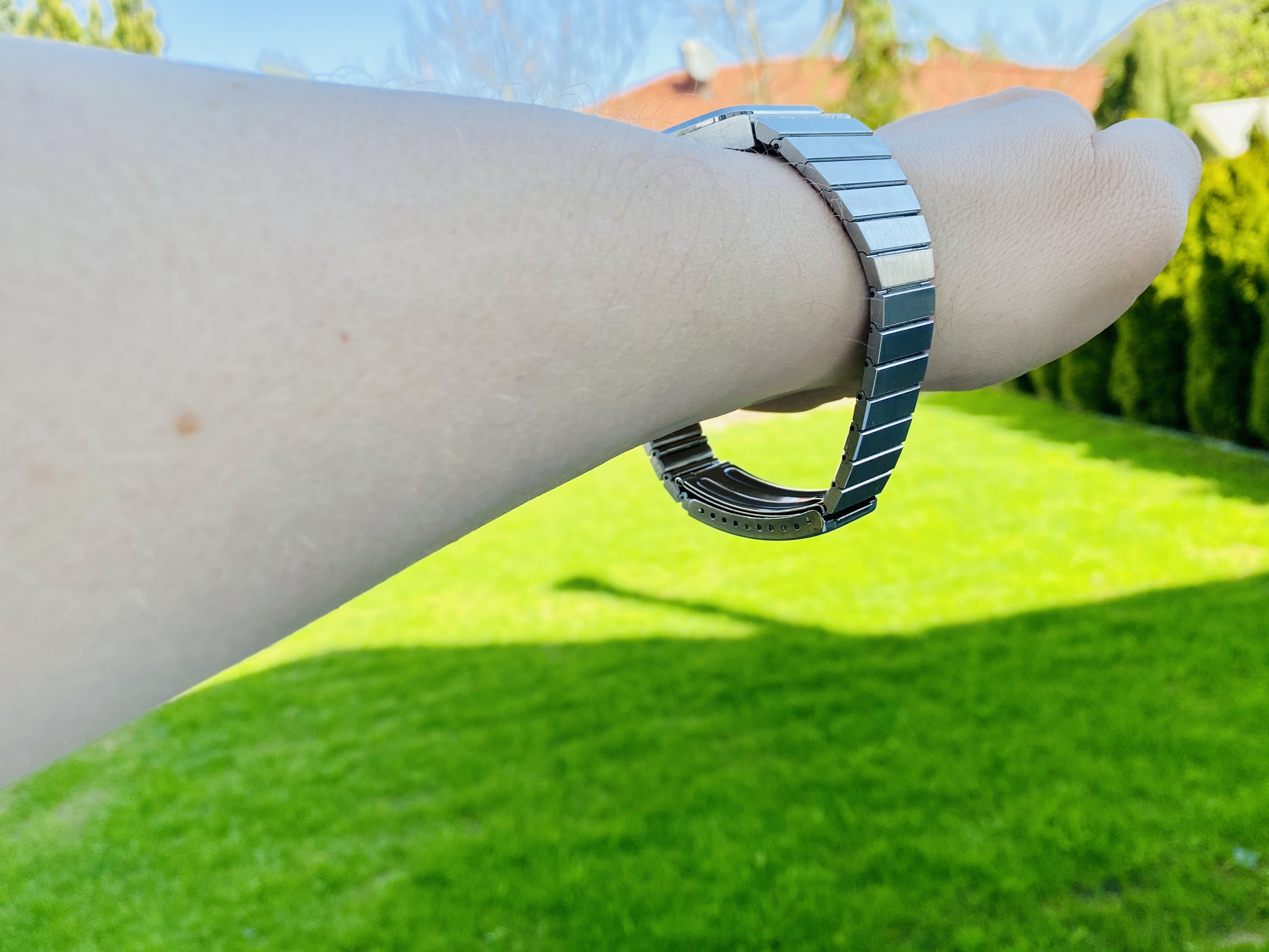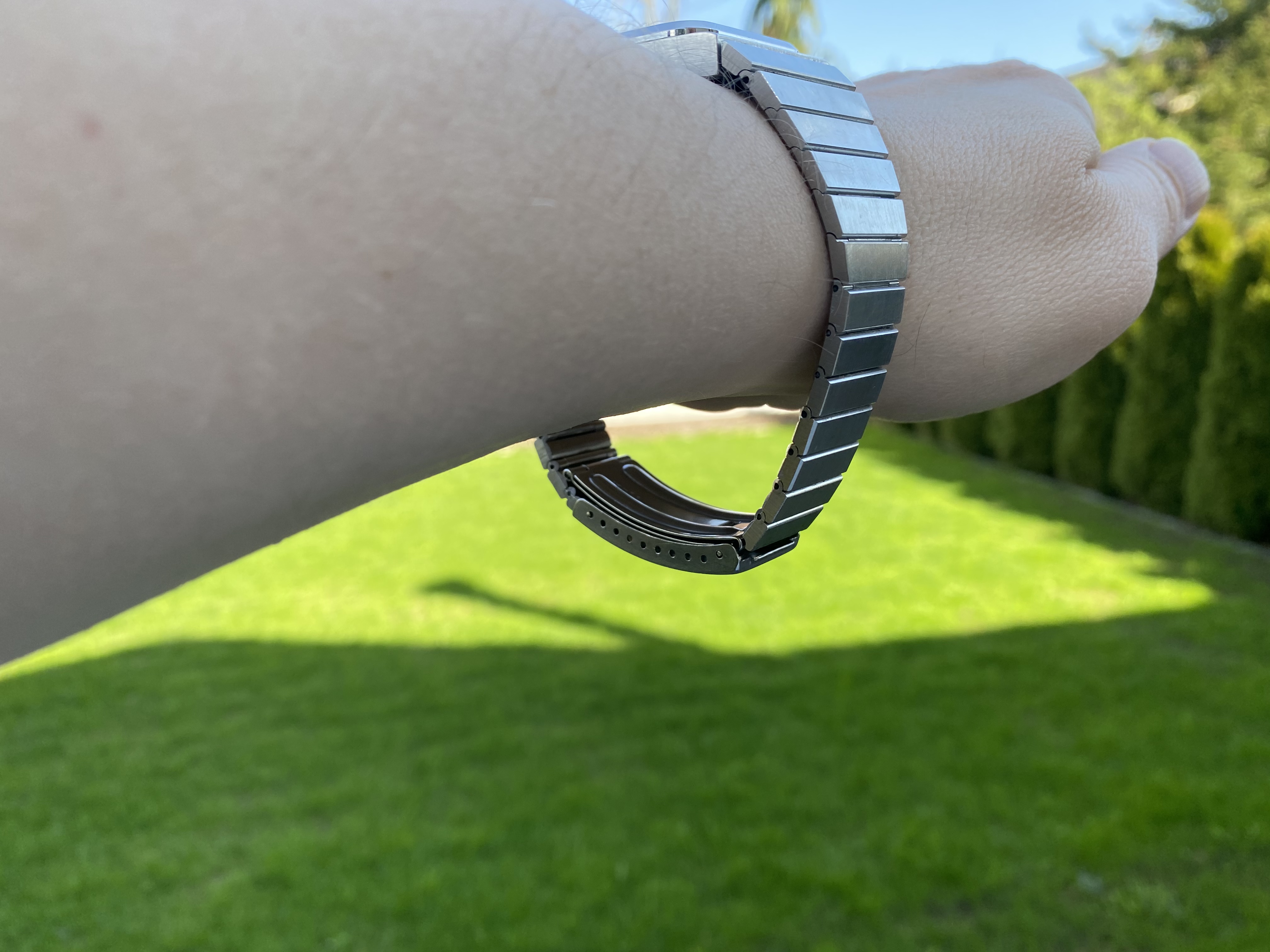Because of the square case, it looks much larger on the wrist, but it is perfectly sized at 32.5mm in diameter and only 8.5mm thick overall.