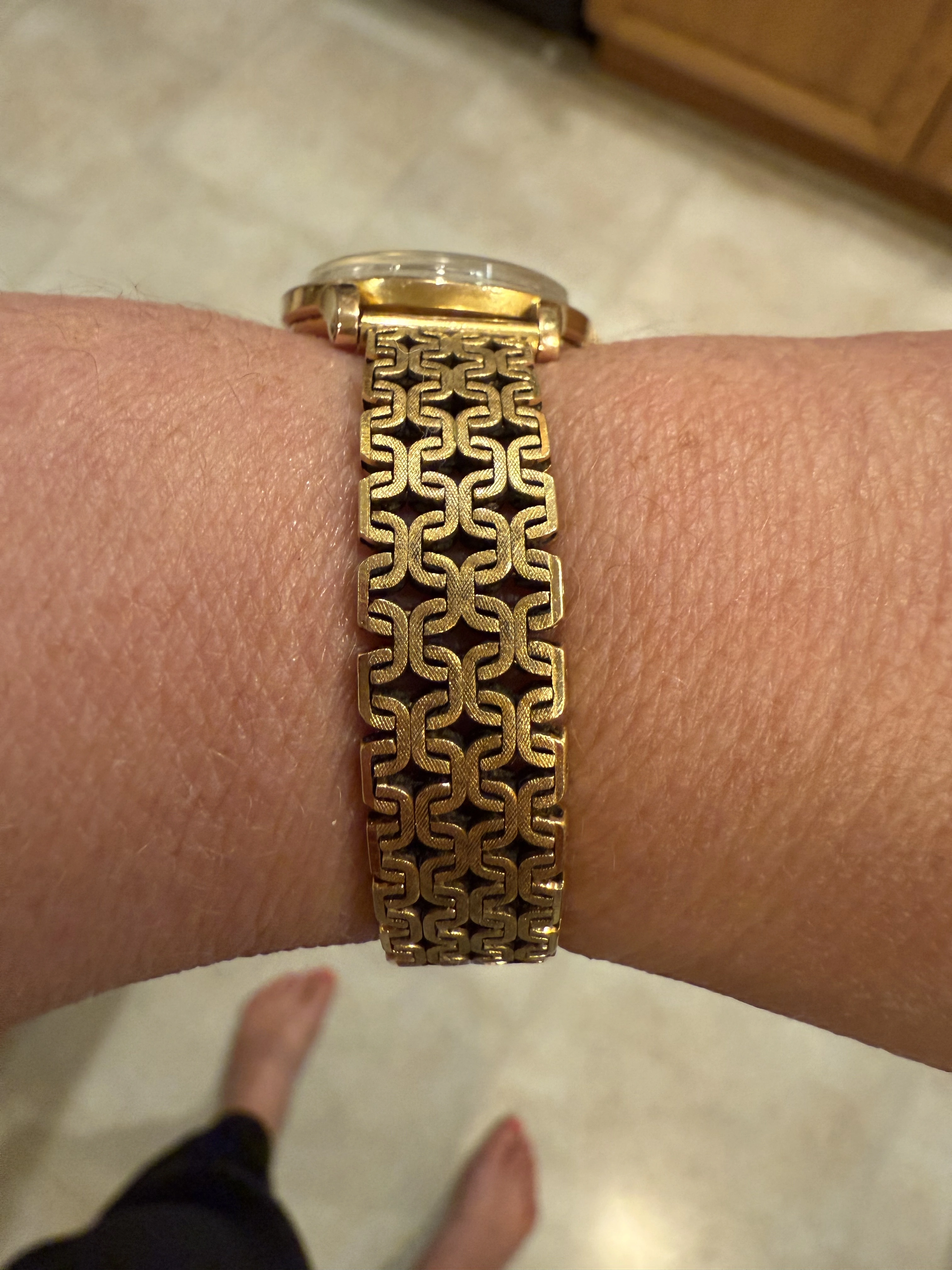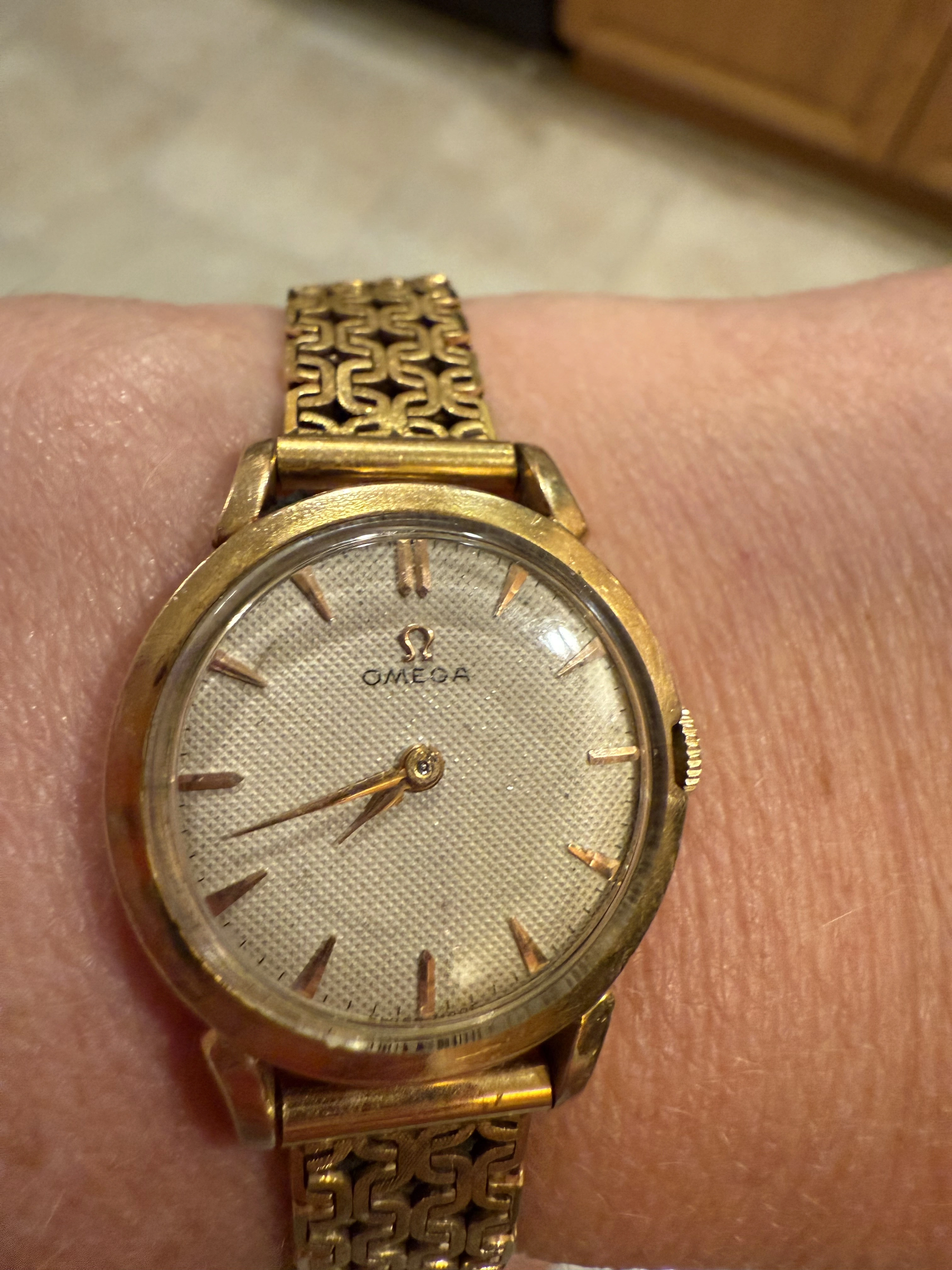 ·I’ve lurked on here for a few years and finally repaired my grandmother’s vintage omega. The bracelet is 18k gold and a gorgeous bracelet she selected while visiting Italy. My Dad thought my grandparents bought it in the 60s or early 70s but based on the serial number the watch itself is from 1954 (14027882). So not sure if they bought the watch in the 50s and added the band later on. My Dad is pretty sure it was in the late 60s as both he and my uncle where working and/or in college at that point and they start traveling. Thanks for all the advice I’ve read over the years.