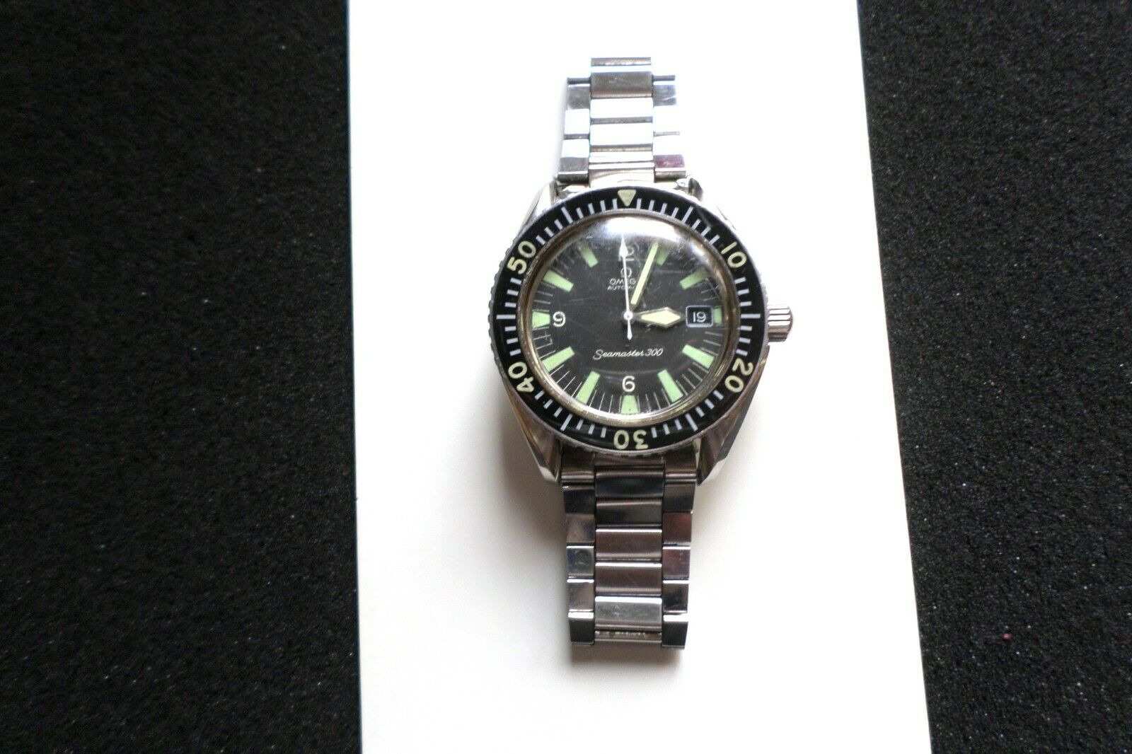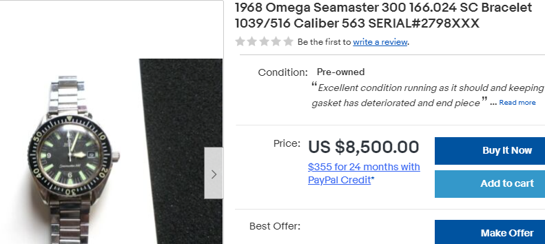 1968 Omega Seamaster 300 166.024 SC Bracelet 1039/516 Caliber 563 SERIAL#2798XXX. Excellent condition for it's age, running as it should and keeping time, gasket has deteriorated and end piece slipped down and must be brought up by the dent you can see in the bracelet. Has minor surface scratches on crystal. This has been a well taken care of watch. Look at all pictures and decide for yourself if it's for you. Any questions, please ask me. Selling as shown per description. This is a good watch and hasn't been messed with."