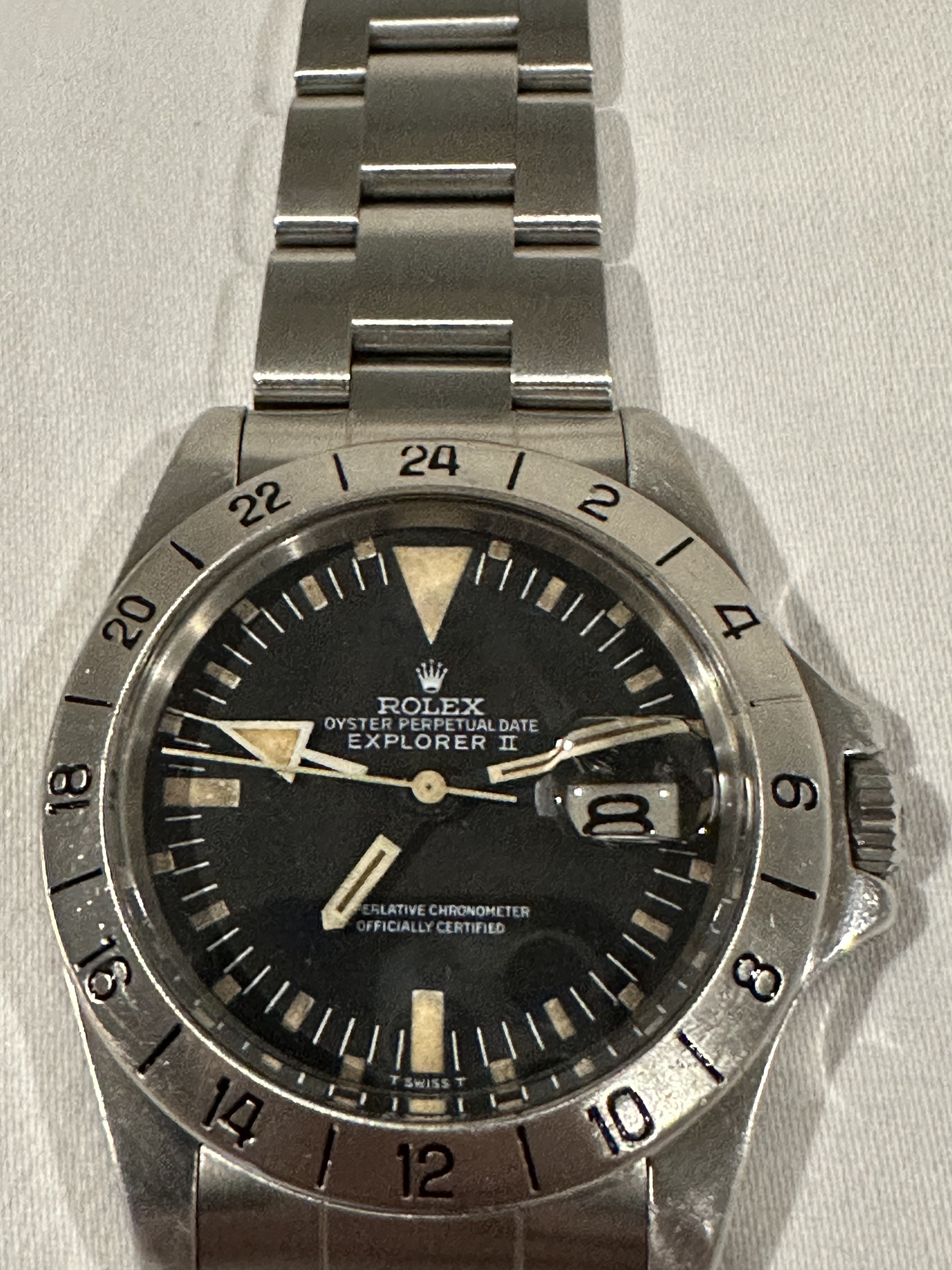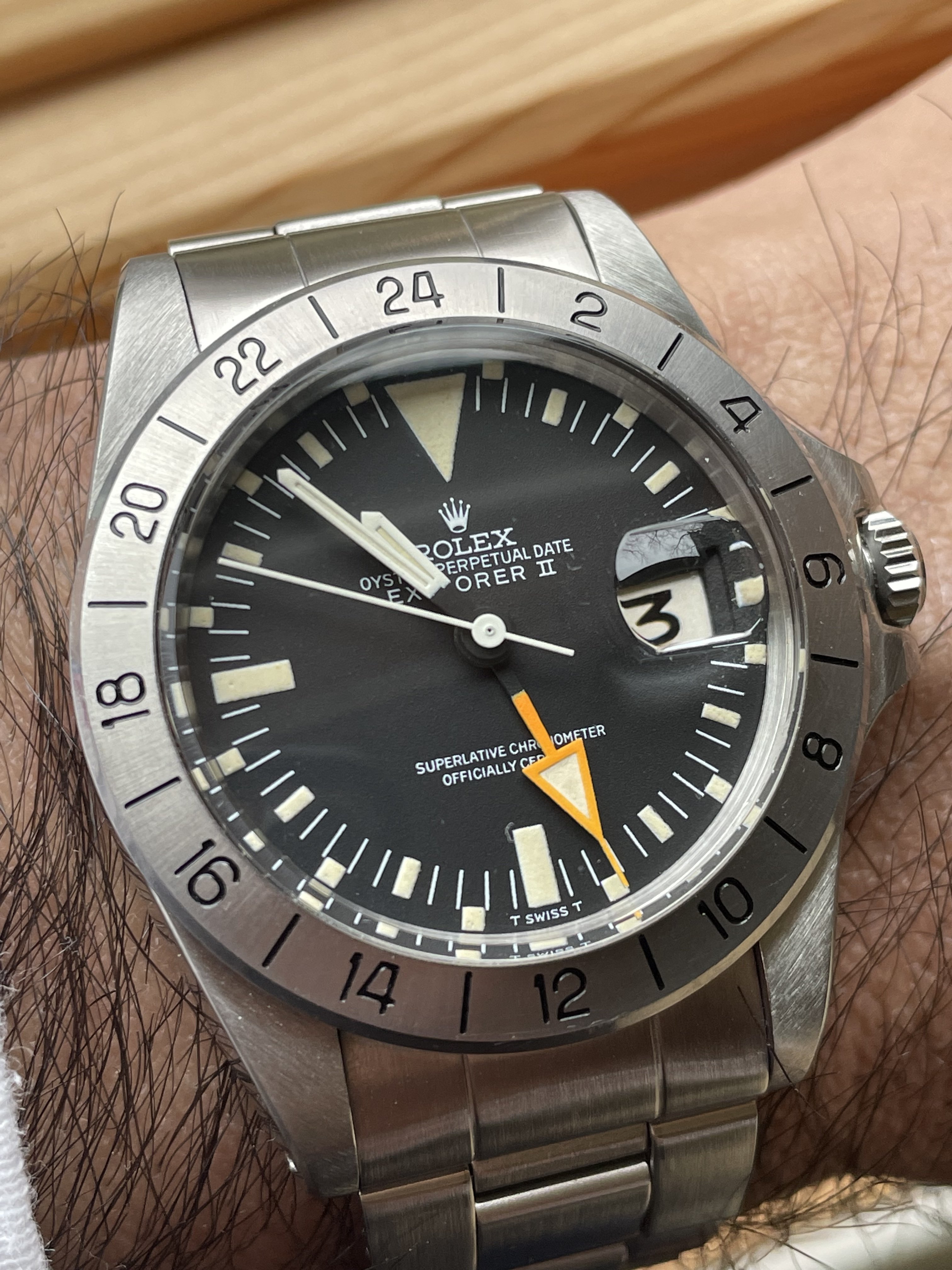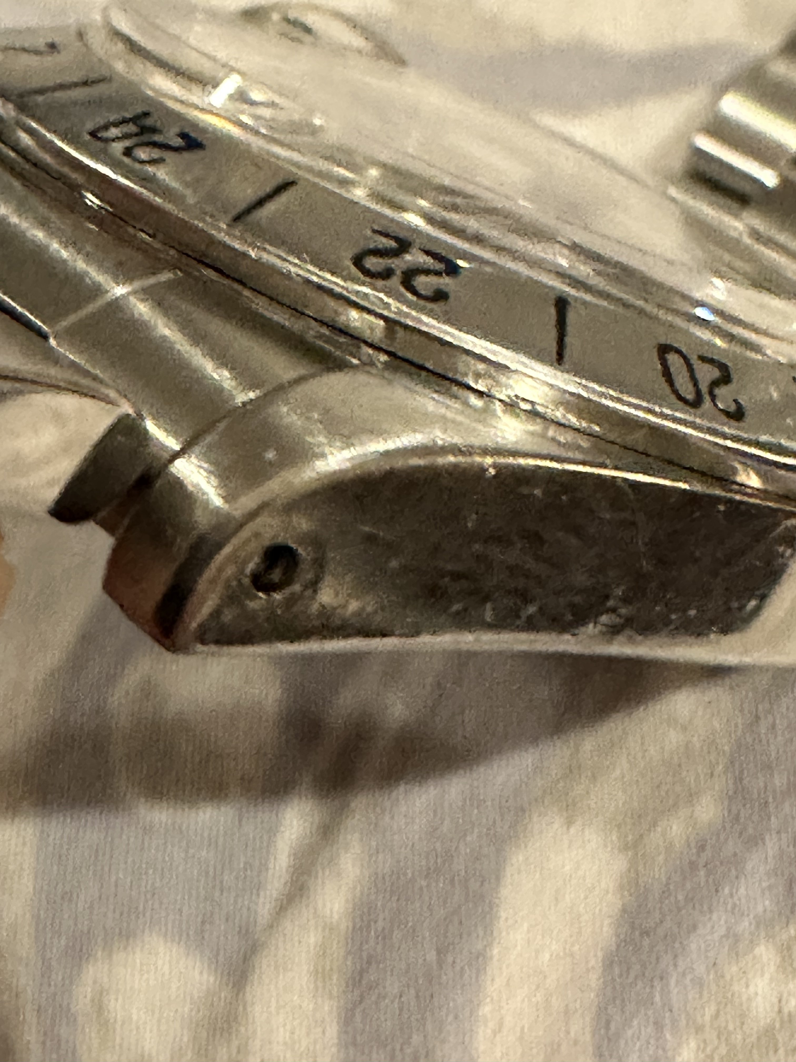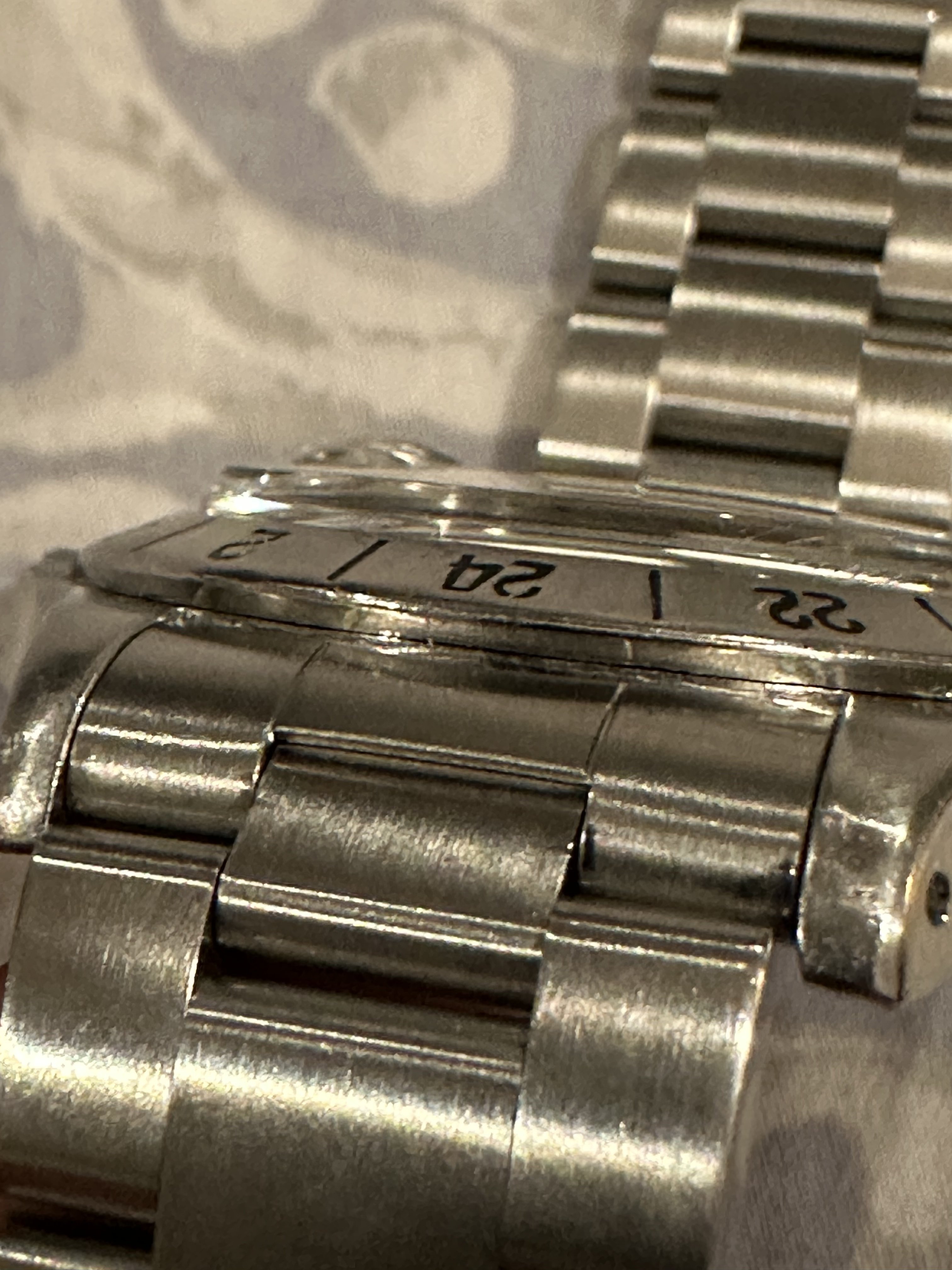 Details: This is a Mk1 dial with what I believe is a MKII bezel. Serial number is in the 3,2m range. Bracelet appears to be an almost new 78360 with 580 end links. The lugs and crown guards appear to be in fairly good shape and reasonably thick. The side case beveling is barely noticeable but also doesn't appear to be polished away necessarily. Case in decent vintage shape. The bezel numerals have been filled in at some point but looks to be a reasonably decent job. The 24 hour hand border is faded completely white while the hour and minute hands have a slightly yellowed. Very even patina throughout the dial and the dial itself seems to be in excellent condition. Under magnification it has a light texture to it.