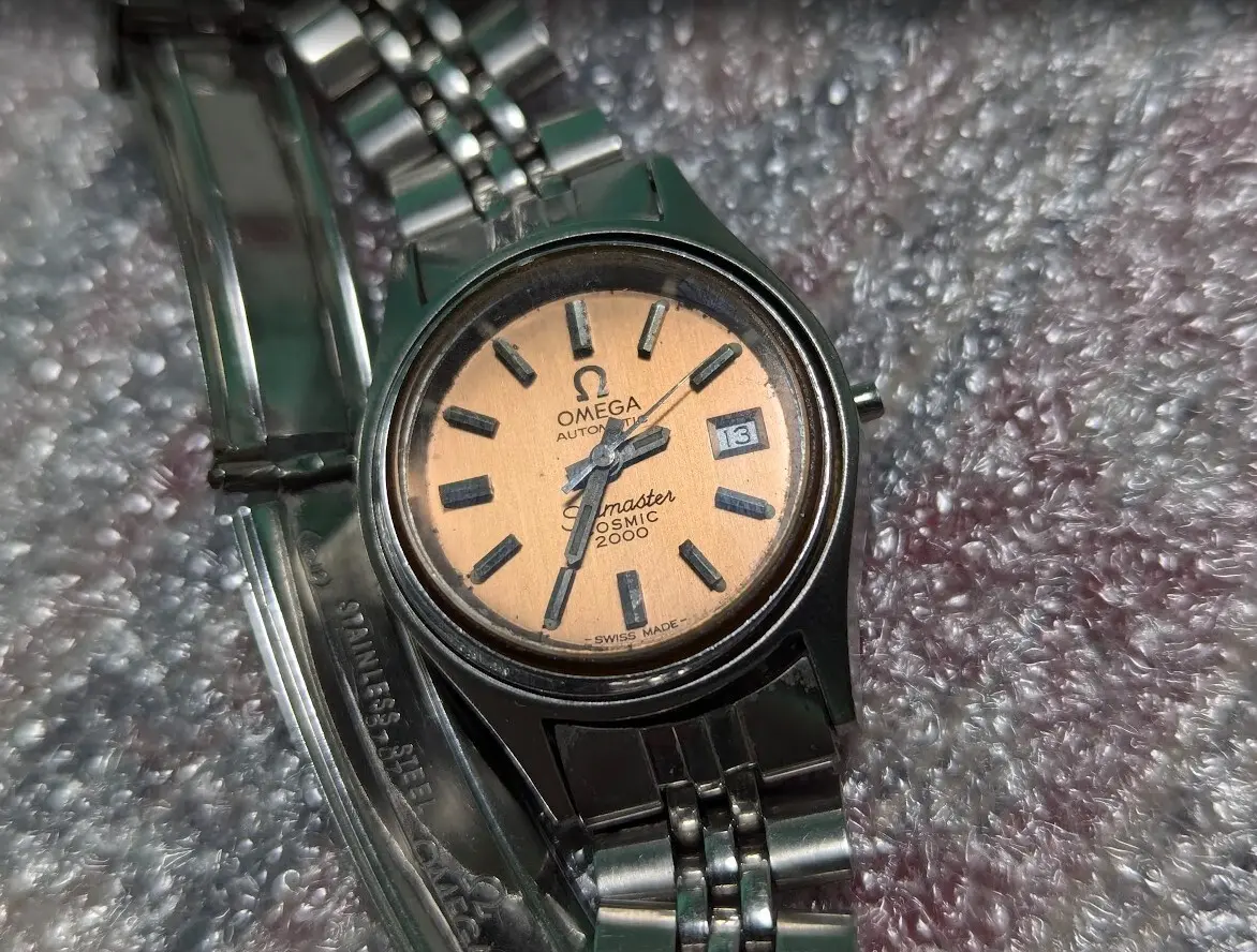 Next is a ~$150 566.053 with a dirty, but great looking salmon dial! Sold as 'for parts', and a dirty movement, but including what looks to be an original bracelet, this seems like it could be a catch!