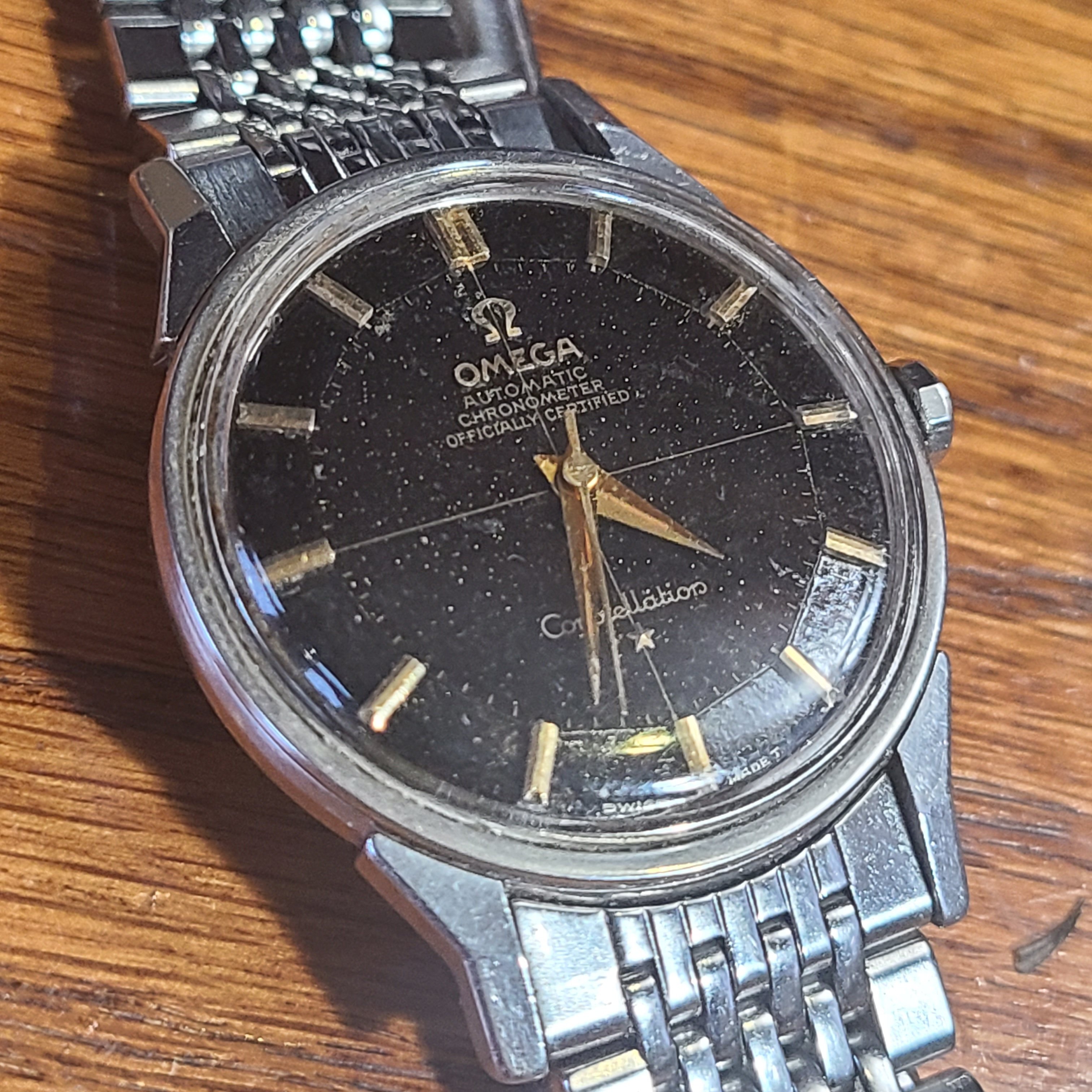 Posts 6,155 Likes 9,509 Peemacgee ·Feb 7, 2024·Purrrr-veyor of luxury cat box loungers hoipolloi Looks rough but original. I’m not one that usually likes patina on a dial but there is something about these ‘inadvertent sparkle’ black dials that is endearing.