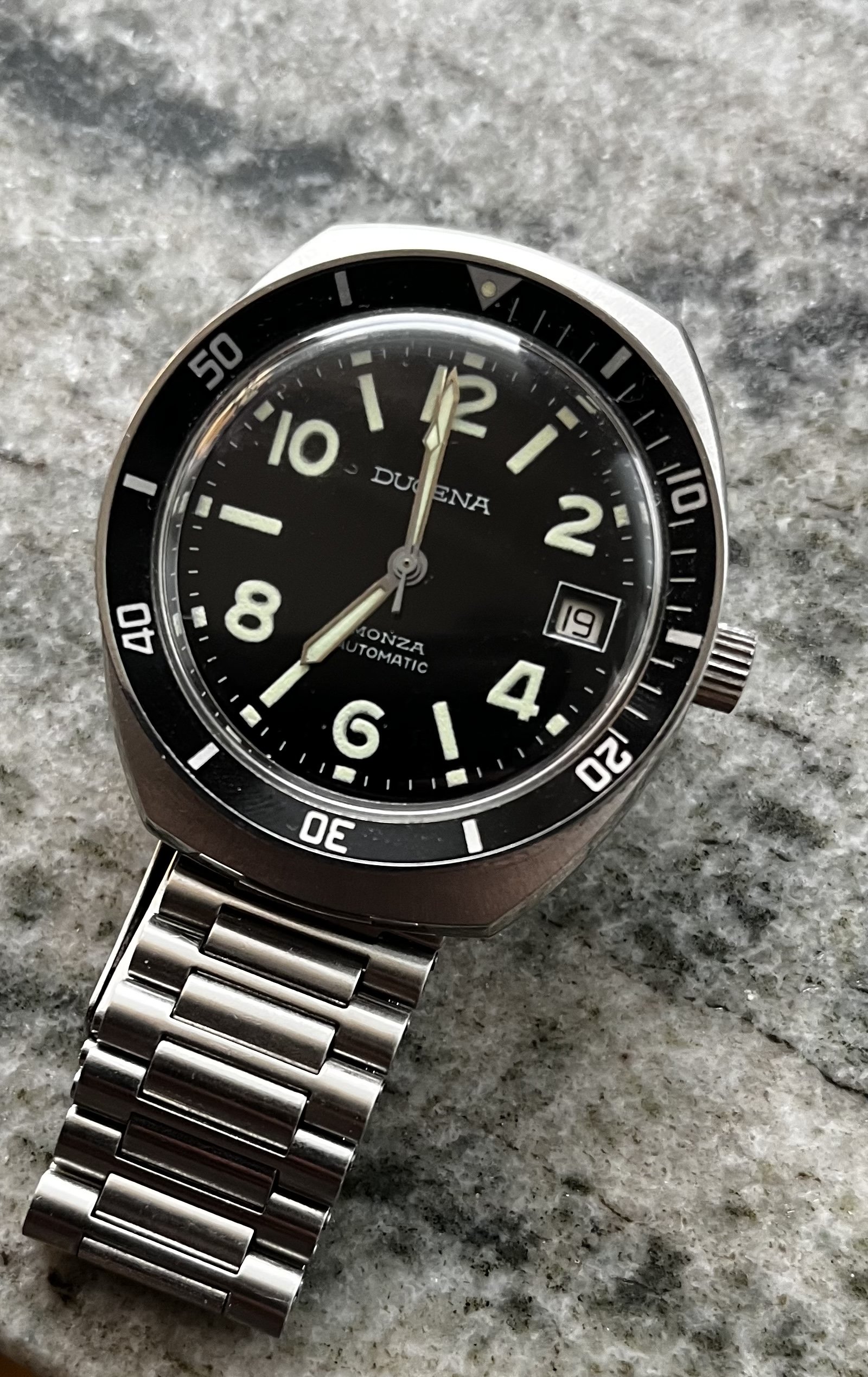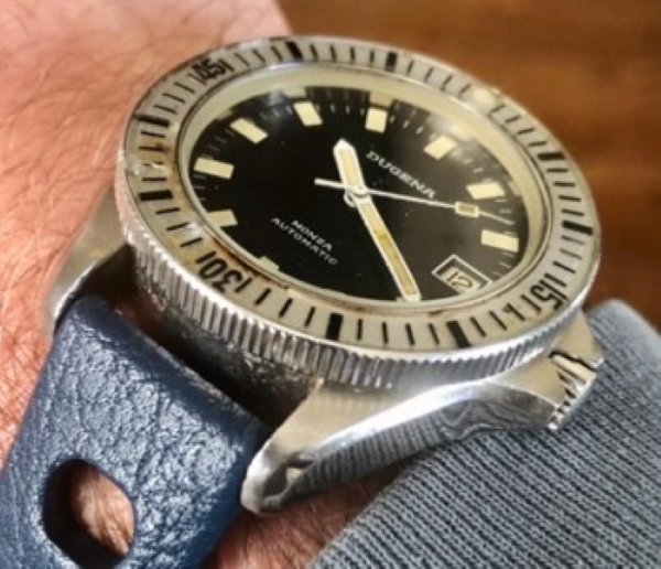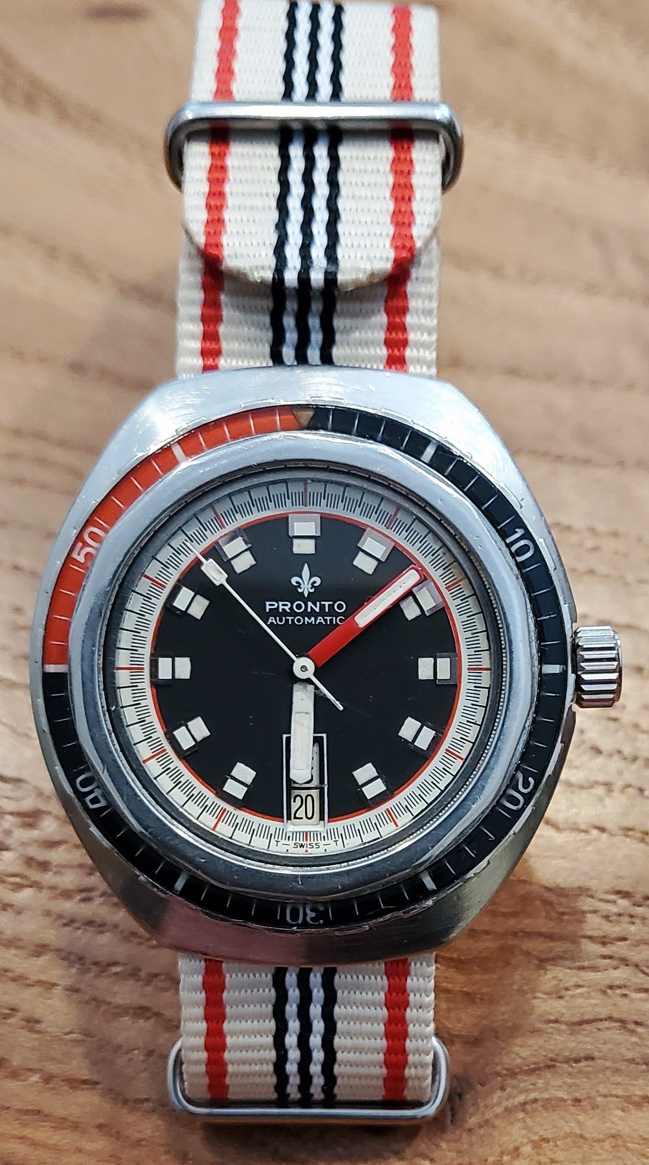 Though I have this Pronto, Dugena made the same watch using a Jean Vallon "Dixi" case with push-to-turn bezel and a WR of 1000'. Both cases were embossed as 6128-216. Very unique design (if you can say that about the same watch being made by 2 brands) with a vertical day/date layout, with the date being quick set. Plus the other obvious characteristics. One aspect I love is, while the vast majority of these barrel shaped lugless dive watches were 43-44 mm, these are only 40, with a lug to lug of 44 mm.