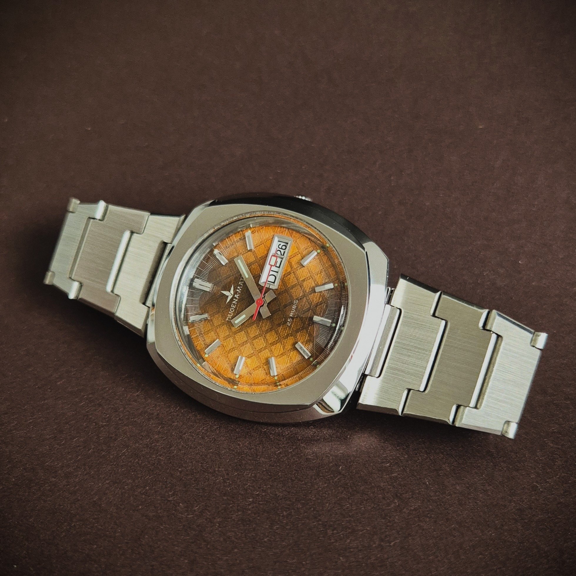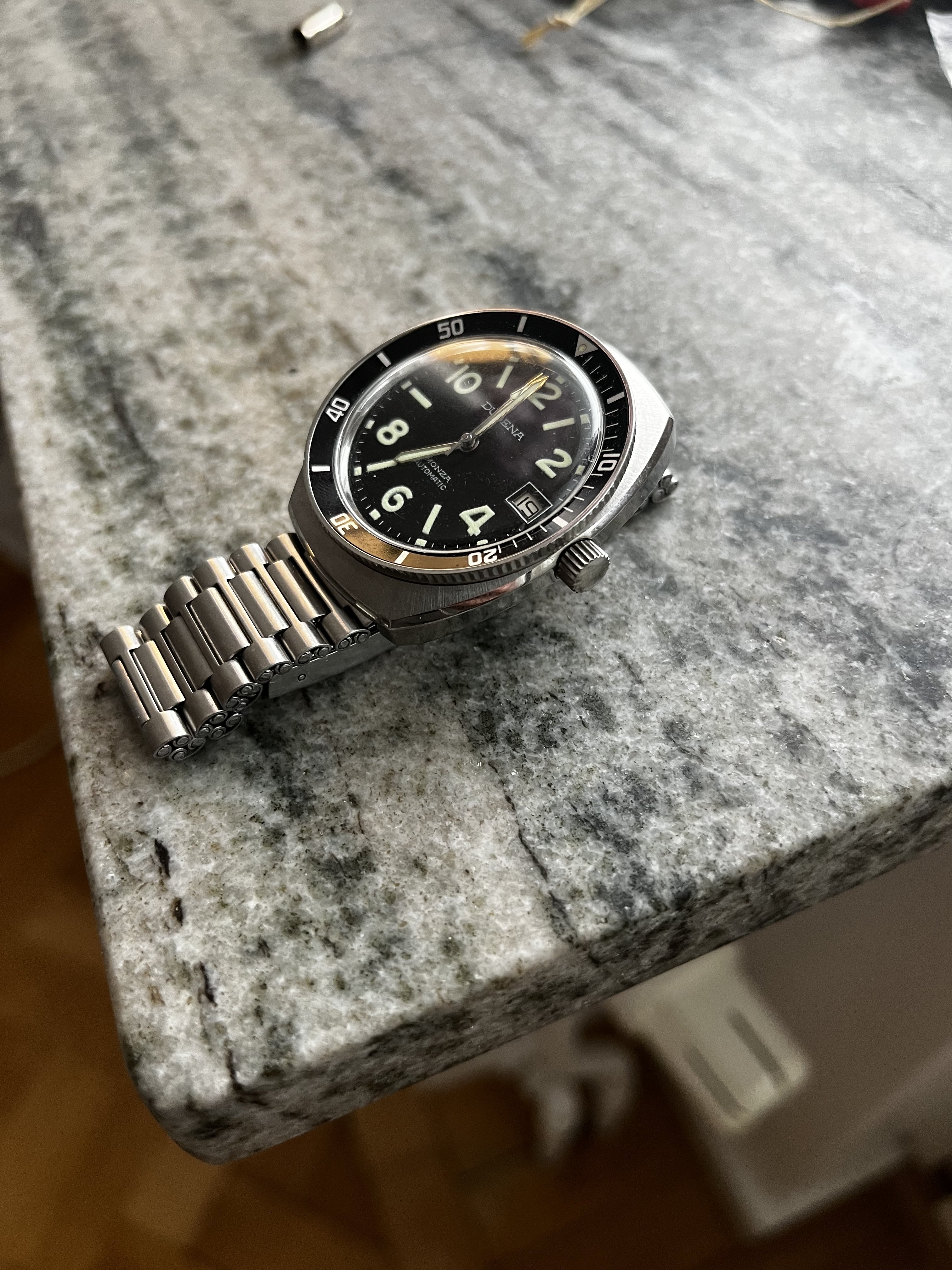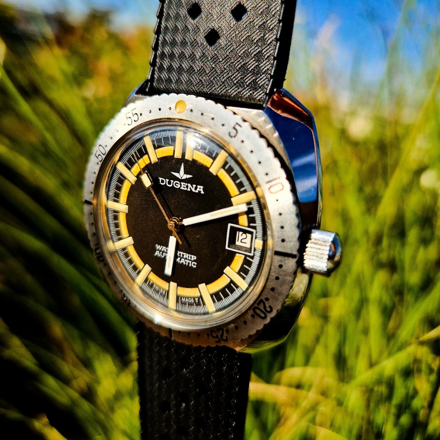 Though I have this Pronto, Dugena made the same watch using a Jean Vallon "Dixi" case with push-to-turn bezel and a WR of 1000'. Both cases were embossed as 6128-216. Very unique design (if you can say that about the same watch being made by 2 brands) with a vertical day/date layout, with the date being quick set. Plus the other obvious characteristics. One aspect I love is, while the vast majority of these barrel shaped lugless dive watches were 43-44 mm, these are only 40, with a lug to lug of 44 mm.