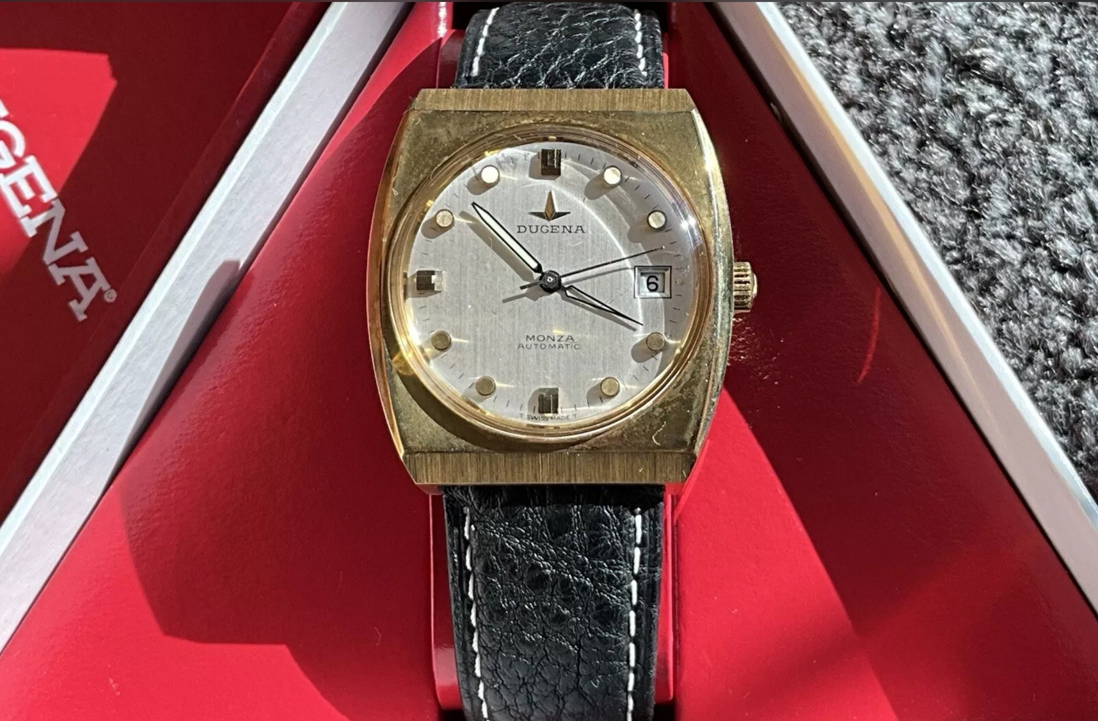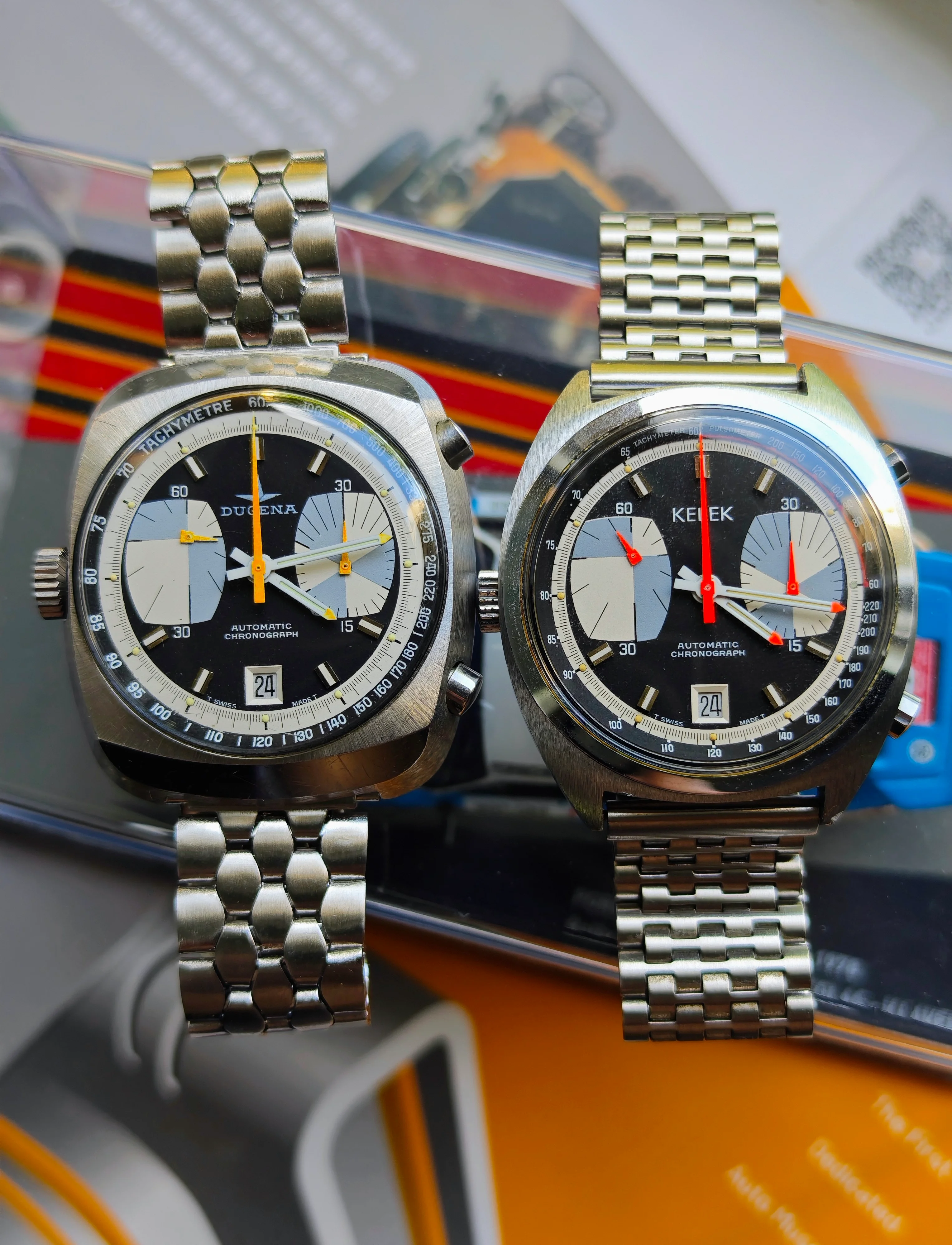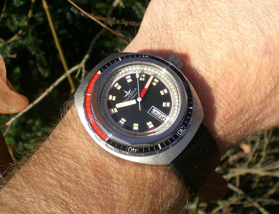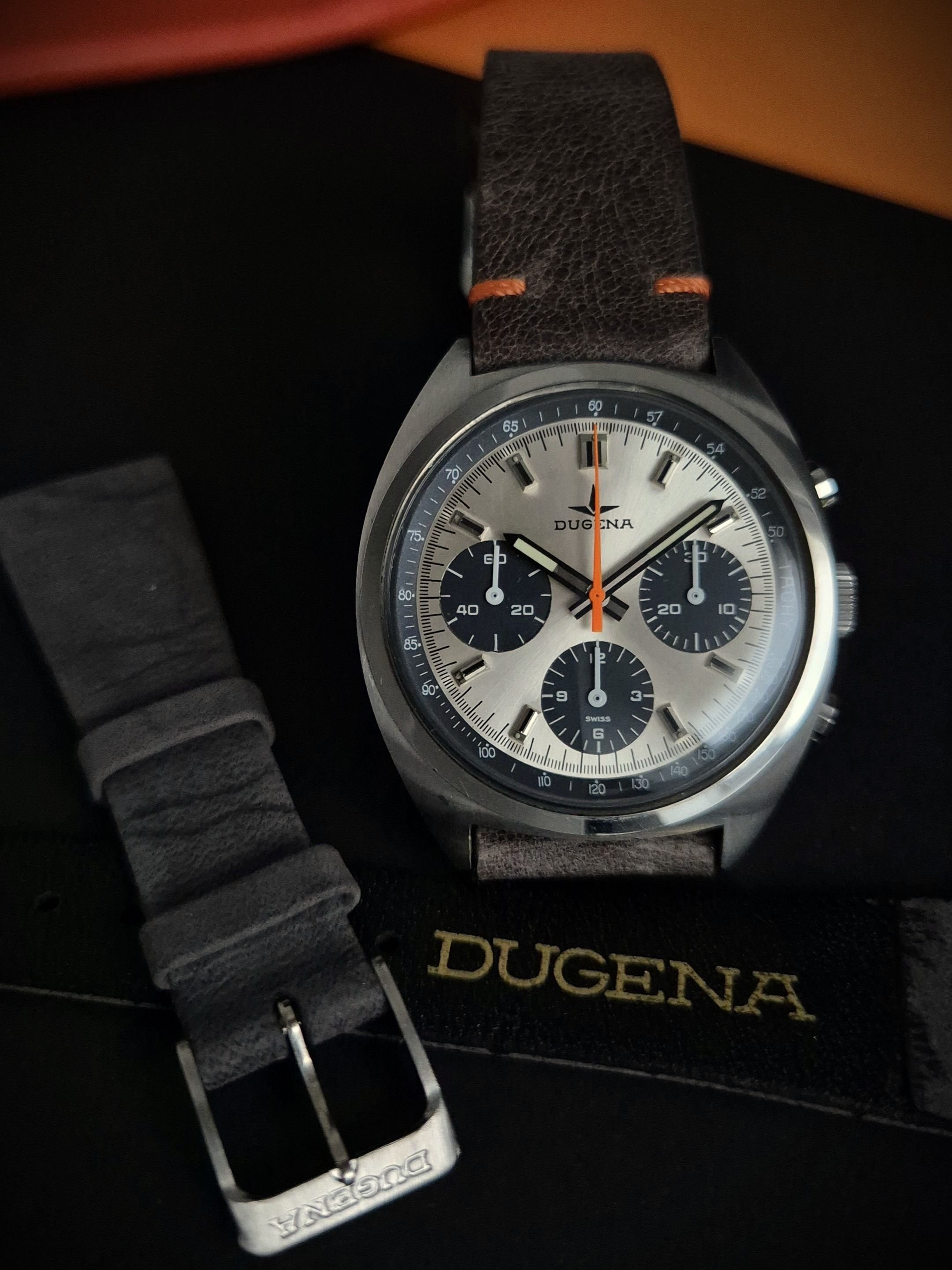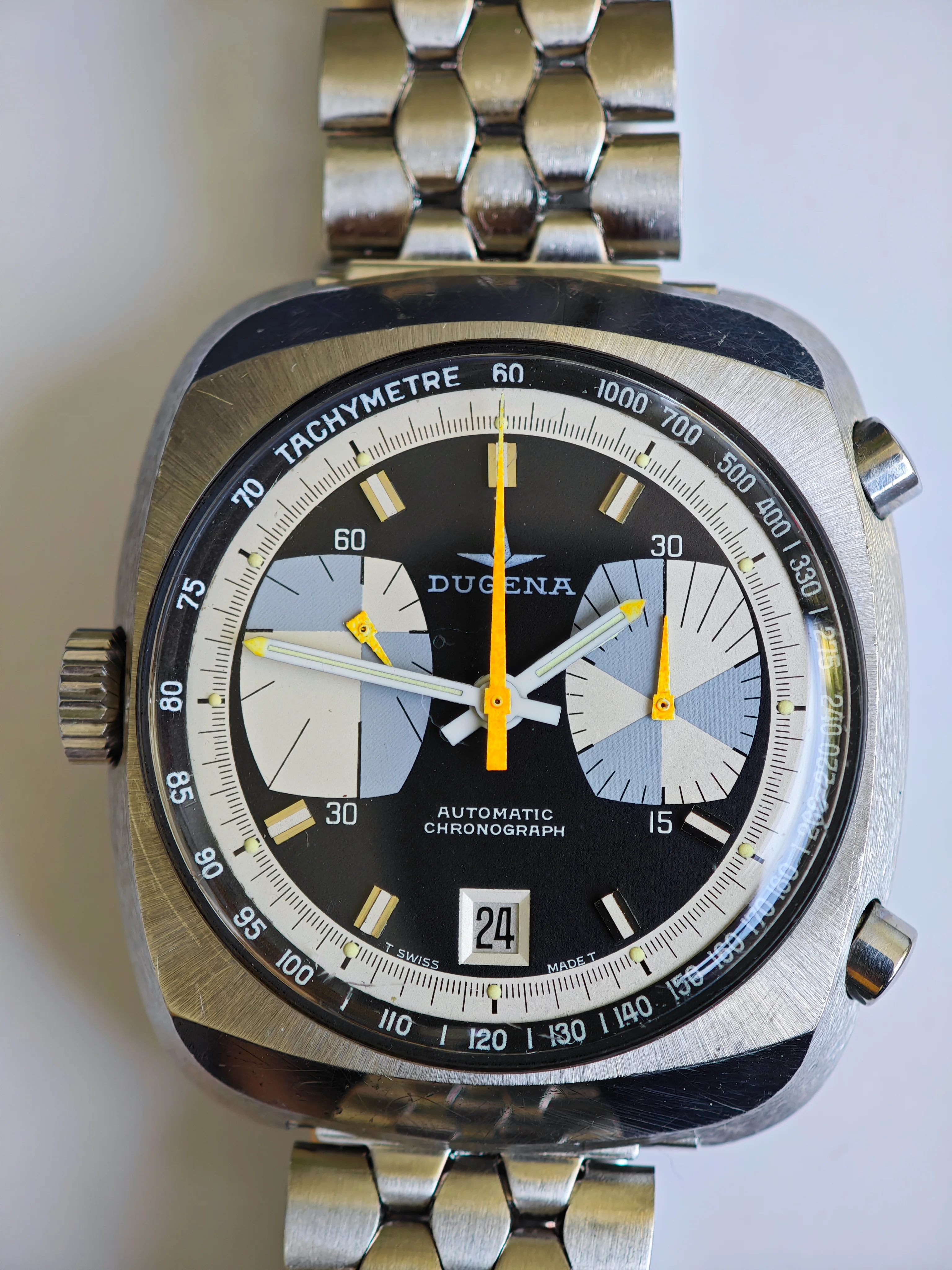 Another Dugena powered by the Valjoux 7733 workhorse, showing some resemblances to serious racing chronographs - poor man's Autavia anyone?