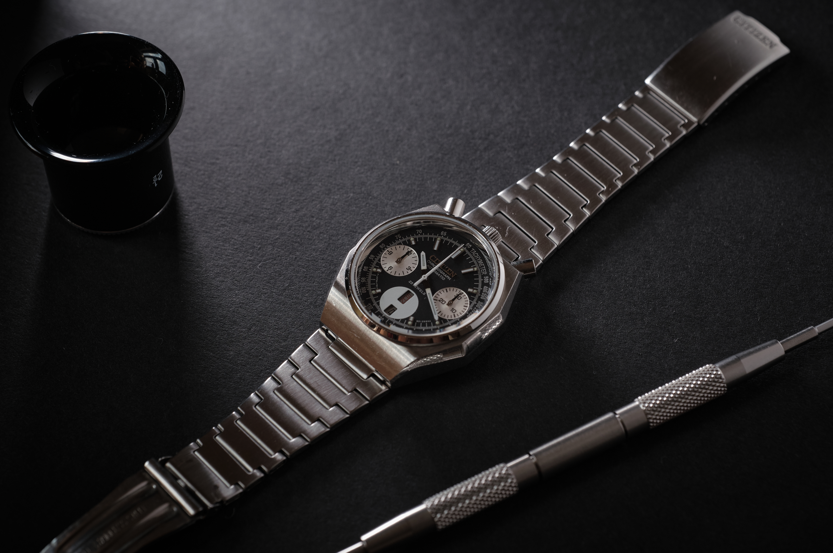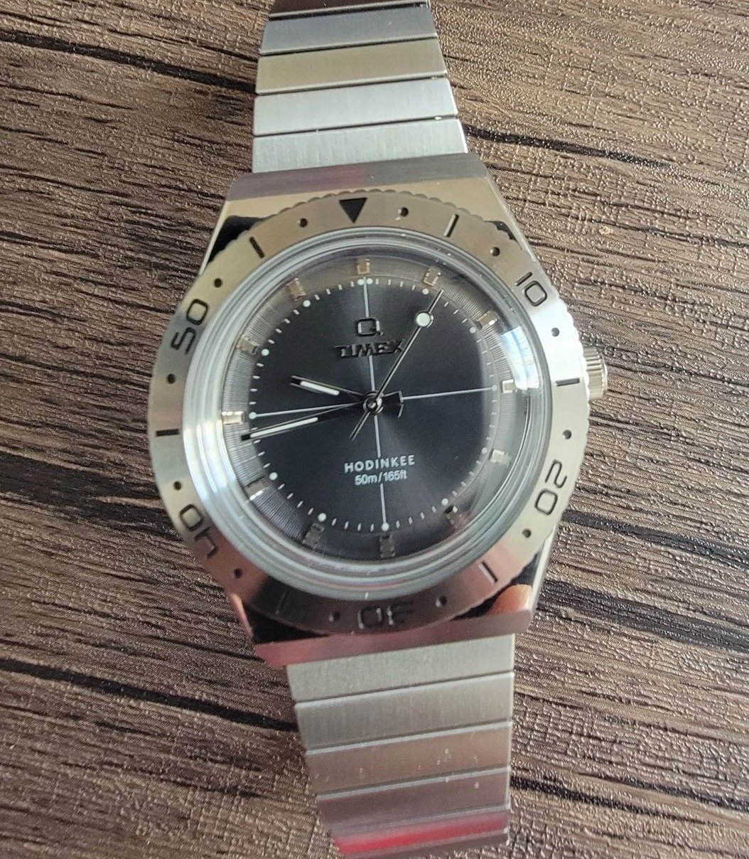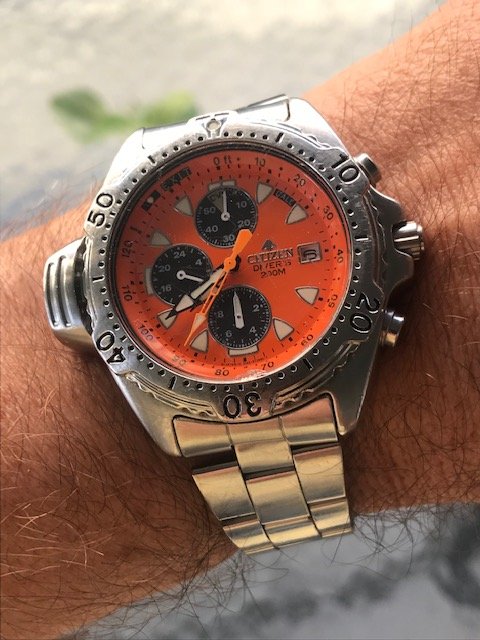 My taste in watches is so undefined that pretty much anything I find for cheap is my latest favorite. I guess this orange colored diver is my current favorite. Found at a yard sale for $5 a few weeks ago, got it running with a new battery and fashioned this generic bracelet to fit.