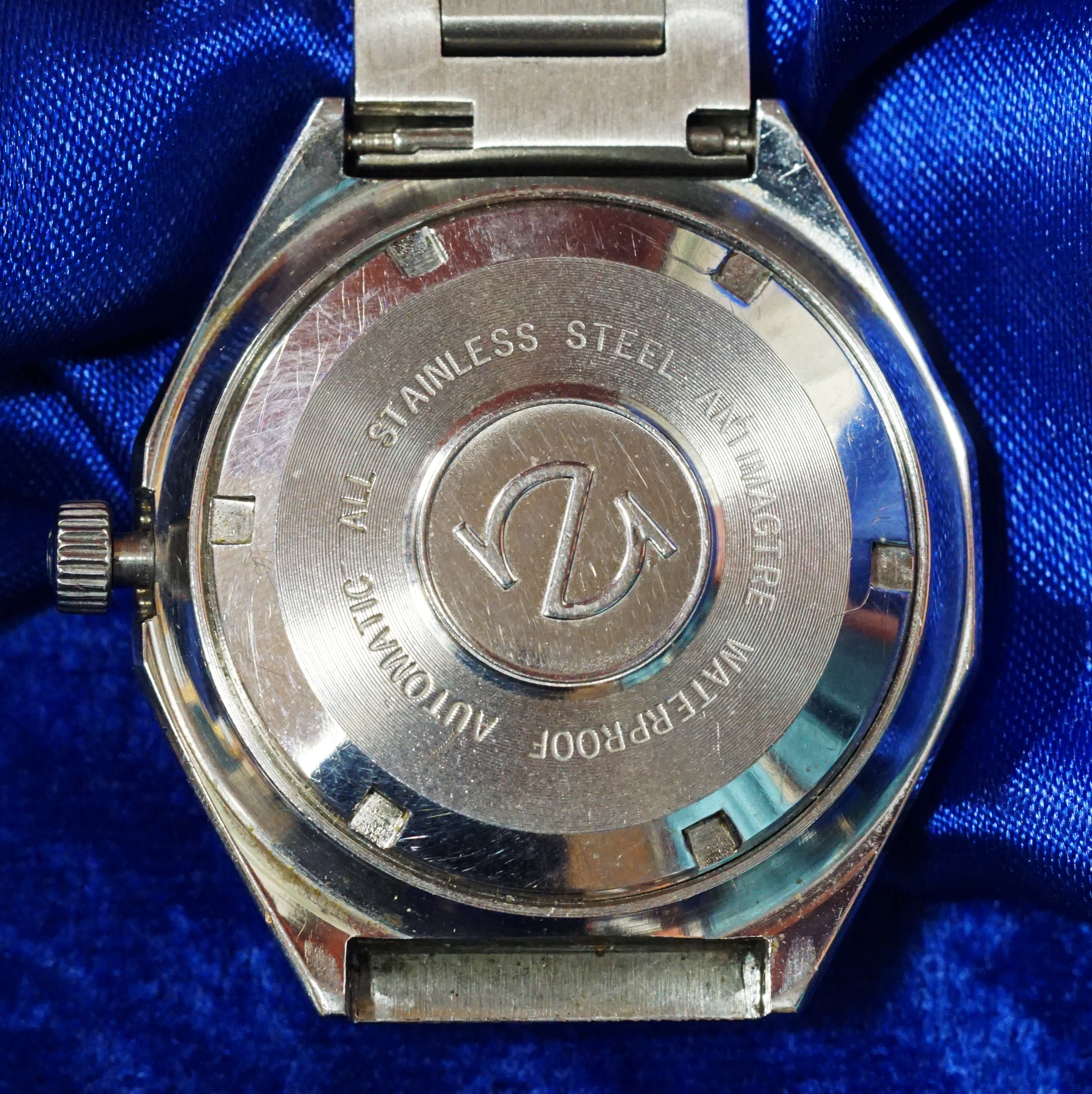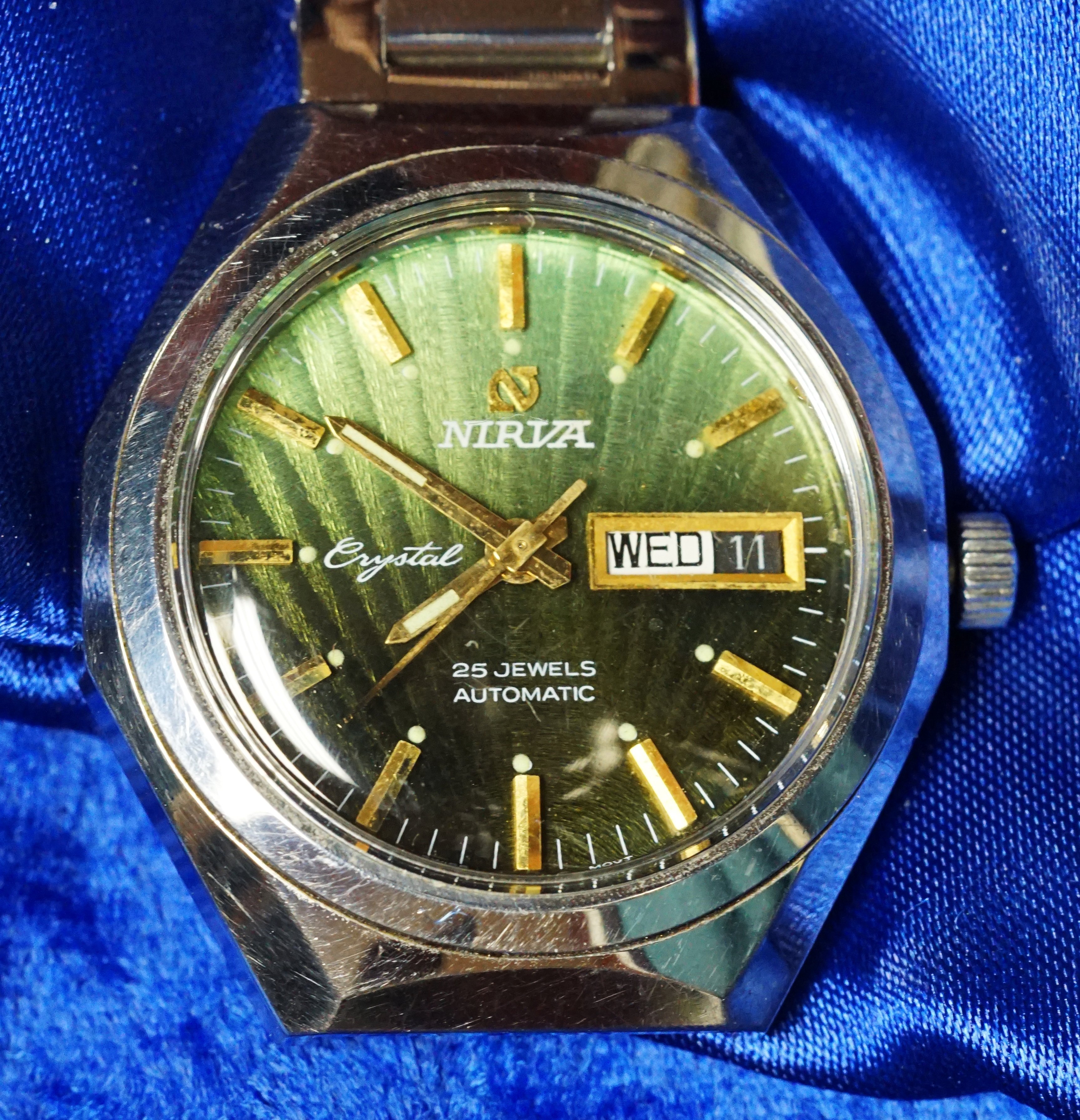 Engraving on outside case back: embossed Nirva “N” in center; Automatic; All Stainless Steel; Antimagnetic; Waterproof