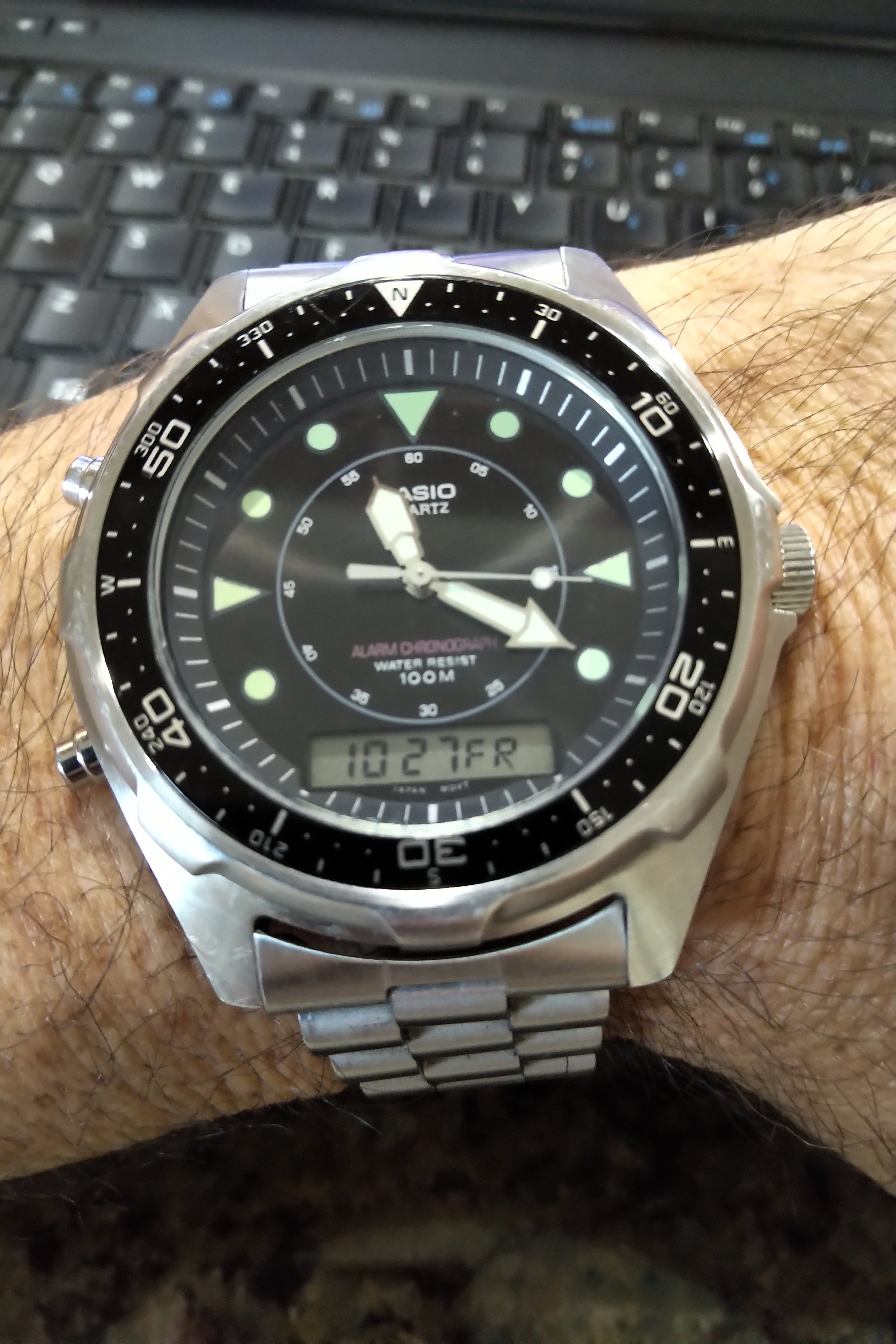 As far as watches that I have acquired inexpensively, yet still get appreciable wrist time, this fairly unknown item is a favorite. When they say “what are the three most important aspects to a watch….dial, dial, dial”, they are referring to this guy. Even my most reserved multi-Rolex aficionado pals grin when I break this one out. I wouldn’t exactly call it a sunburst, but maybe a term from my gemological studies is apropos---chatoyant. I have owned it for quite a few years, but generally only wore it when I felt a lively green vibe was on call. Then it finally came up in the service rotation, and now that it has been sassed-up I buckle it on a couple of times a month. I think I will always own this one.