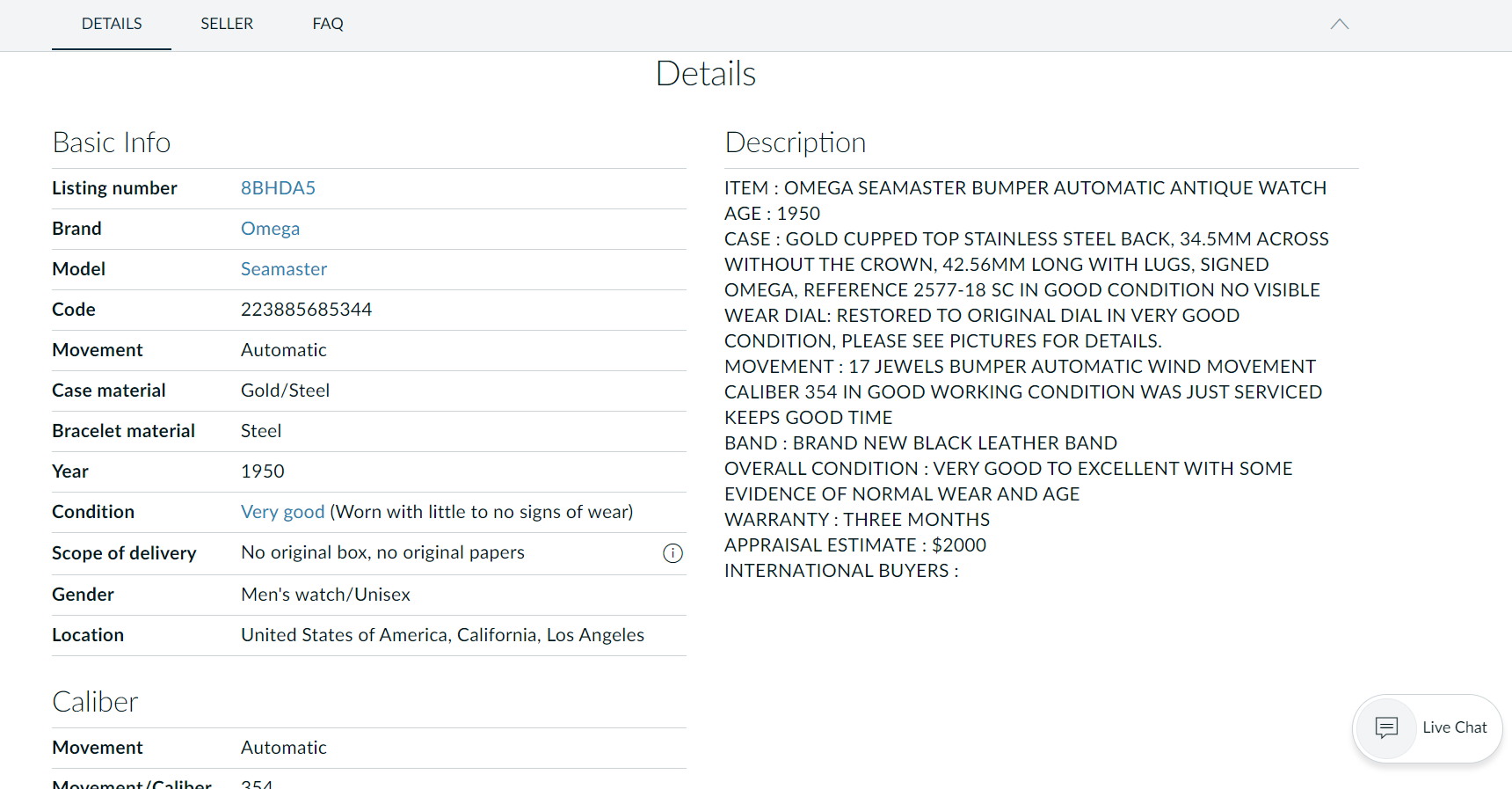 Anyway, recently had it serviced by my watchmaker who showed me the reference/caliber/serial number, and got me thinking I should try and find out more about it. I did not take pictures with the case back off unfortunately, but the movement did look "correct". Here is the info, along with pictures and a screenshot of the original listing.