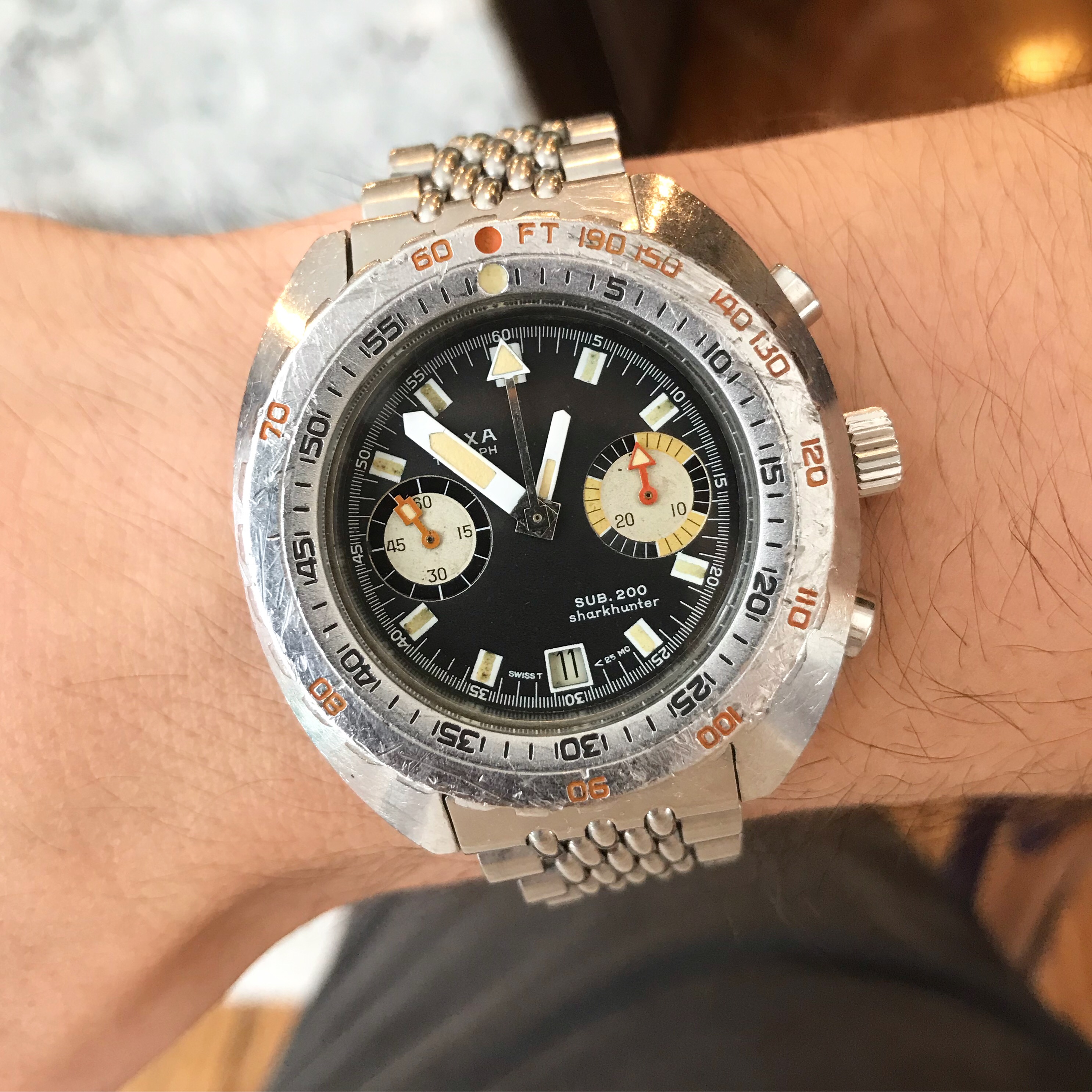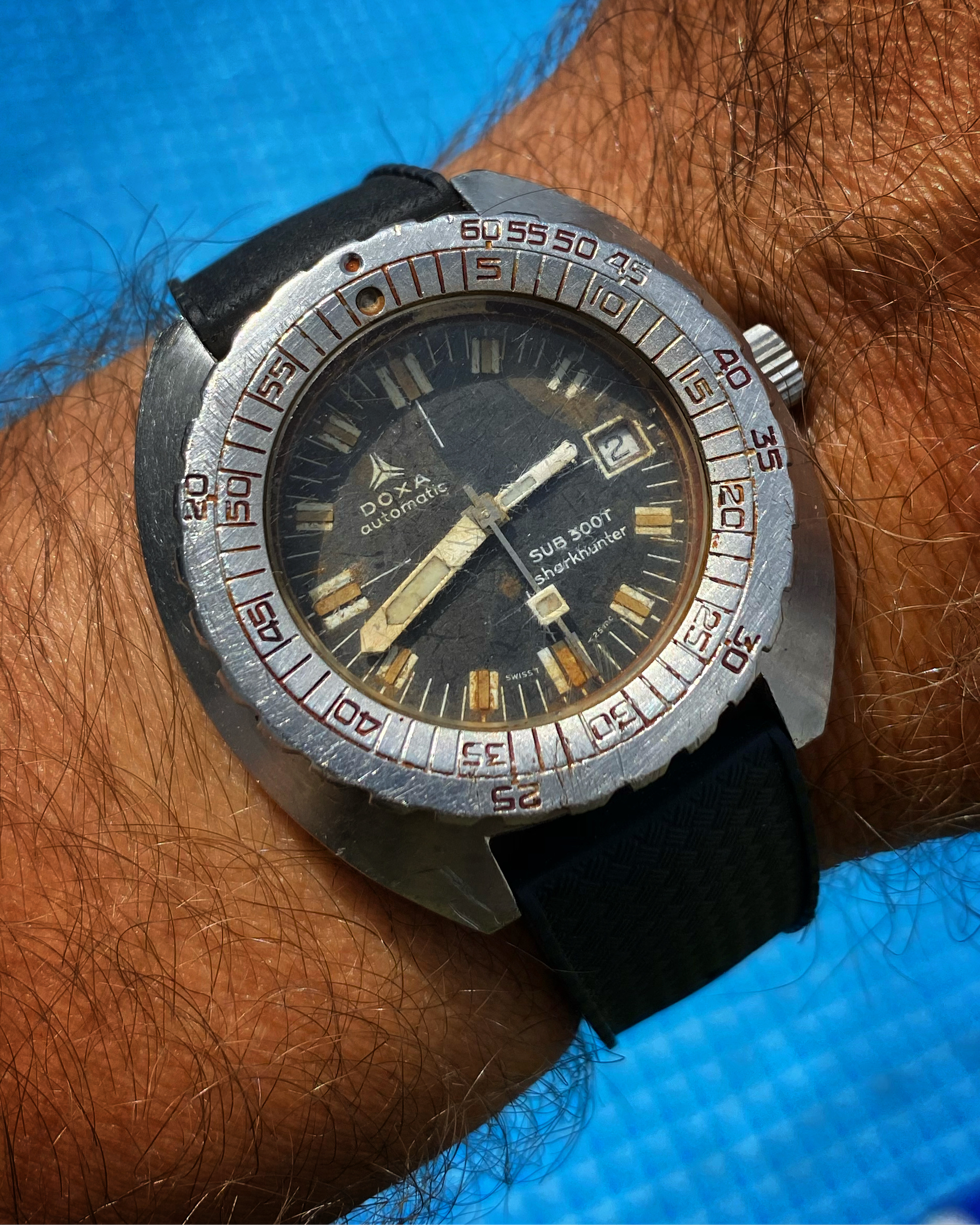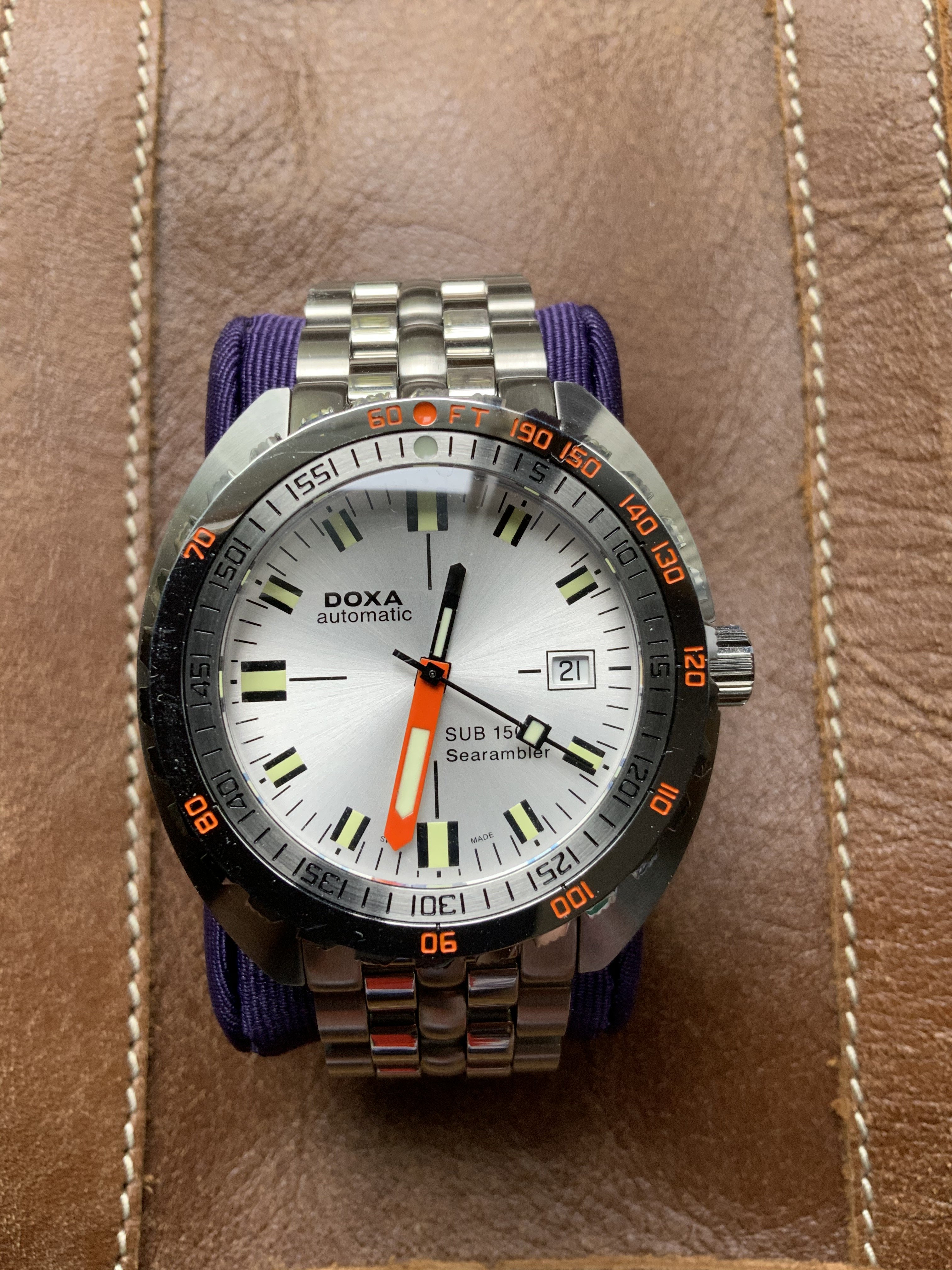 Here is mine got it when they were a hell of a lot cheaper paid 800 with bracelet off Ebay. Had to replace the crystal there hard to come by because there a step crystal another heavy Doxa collector told be a trick that my watchmaker was willing ti try you get to different size crystals glue them together now you have a step crystal now the glue was a problem ultraviolet crystal glue was the trick no bubbles clear bond between the two and a perfect fit. Some one said bracelets are hard to come by I bet if I was stupid enough to sell my Bracelet I would get more than I paid for this when I got it years ago. And the missing bezel been there for a friend who use to dive in the 1970-1980's who had a Doxa 300T and some how lost his off his watch he knew I was into watches so I tried to find one a lost cause. So he ask me to sell it for him sold it for 400 bucks at a NAWCC mart to another collector and gave all the money to my friend. And another thing I learned there are different variations of bezel for these so make sure it fits before you pay a high price for a bezel replacement.