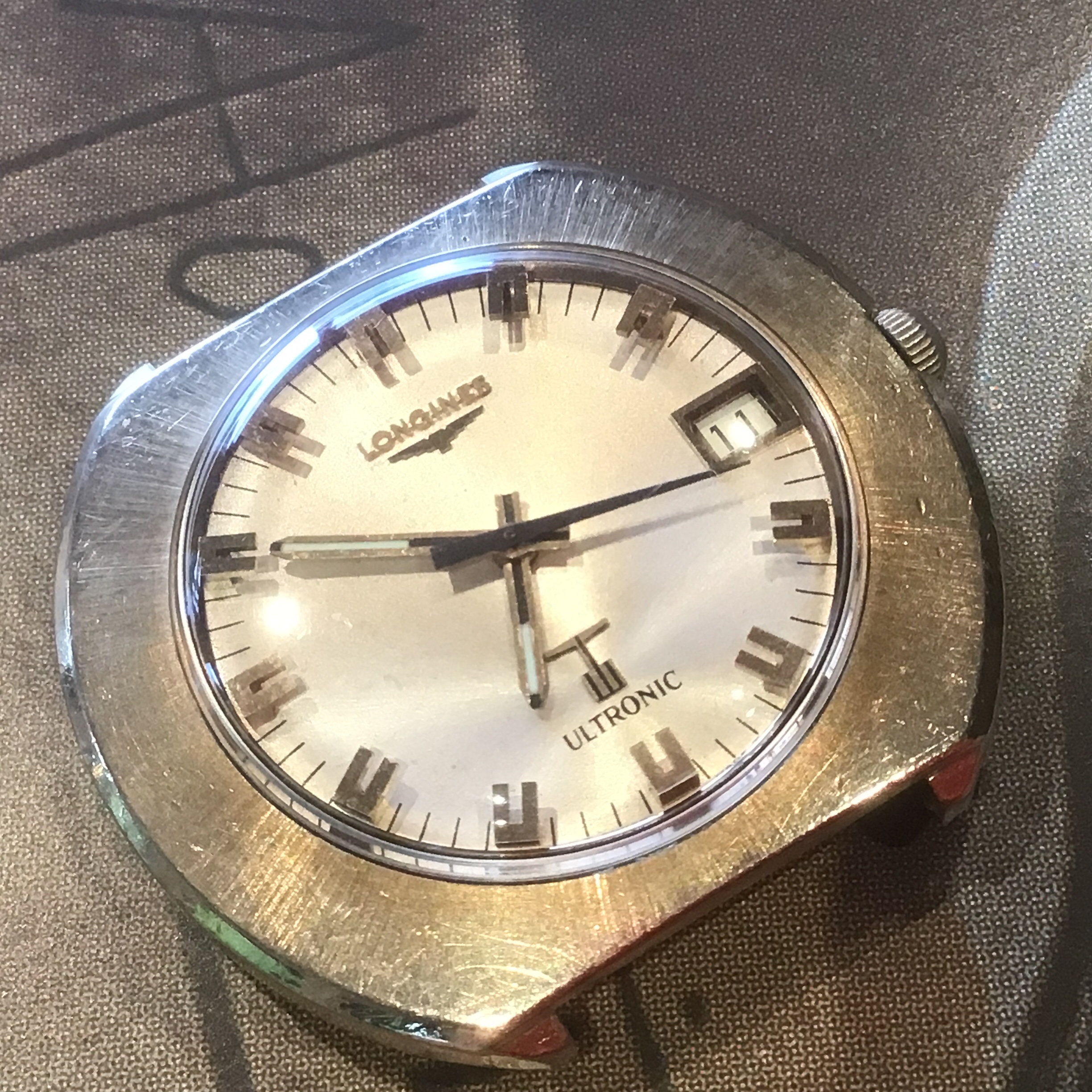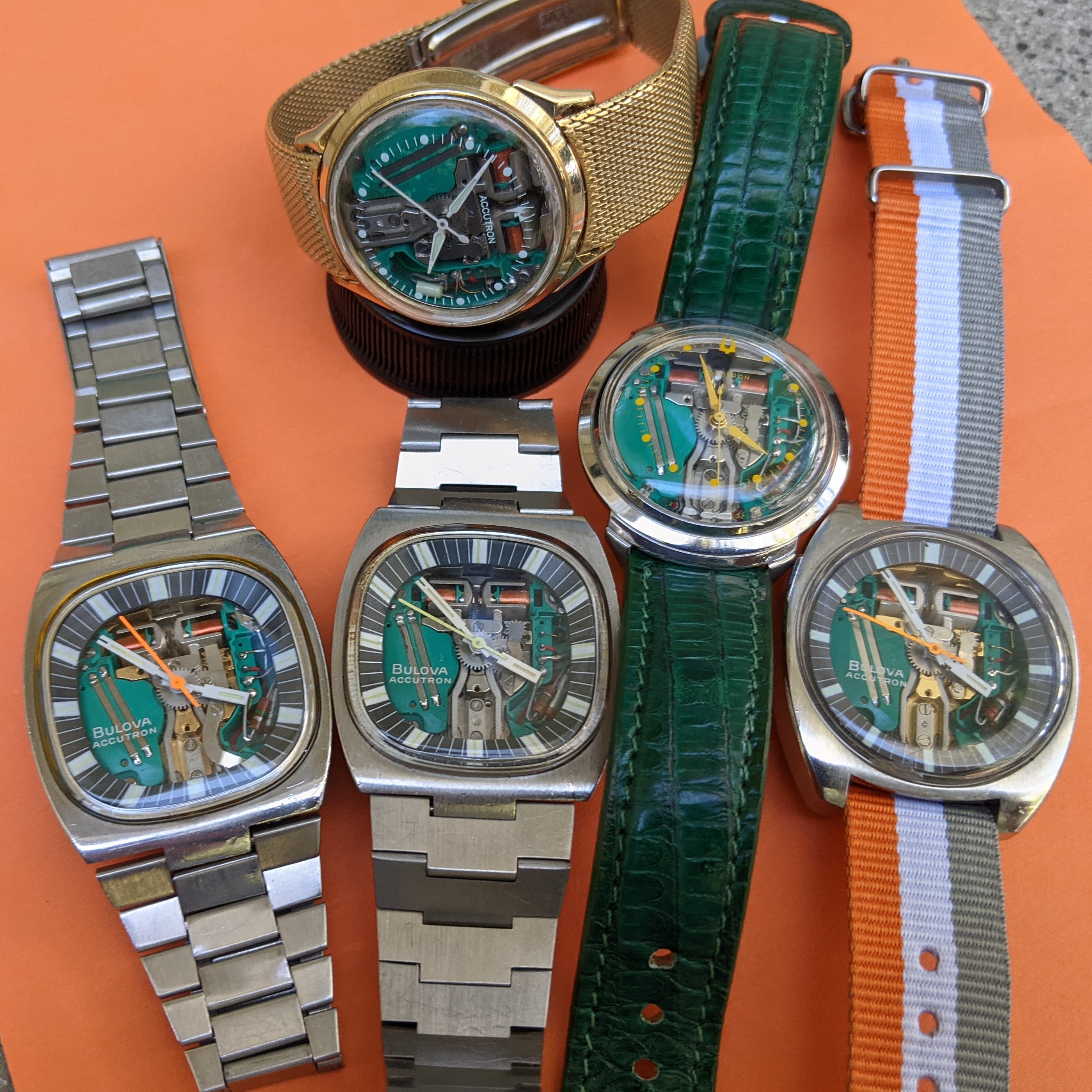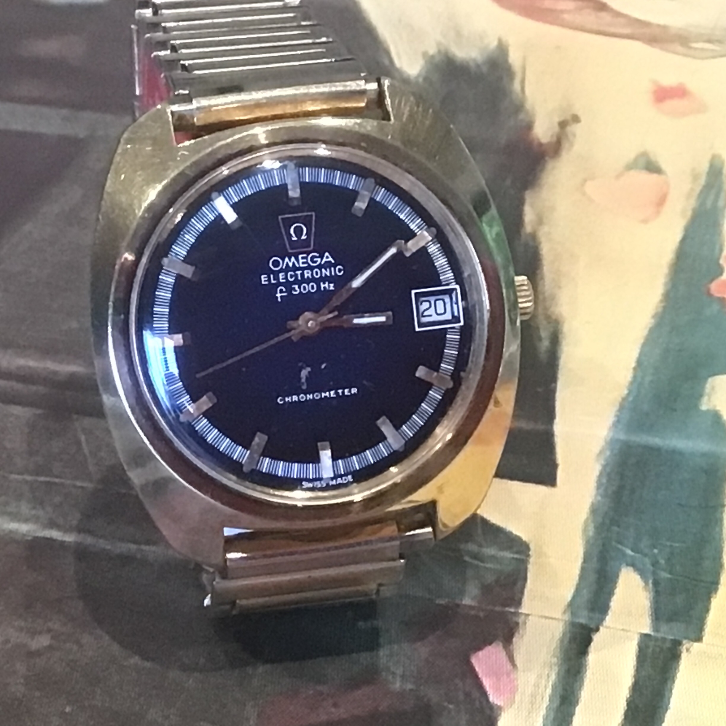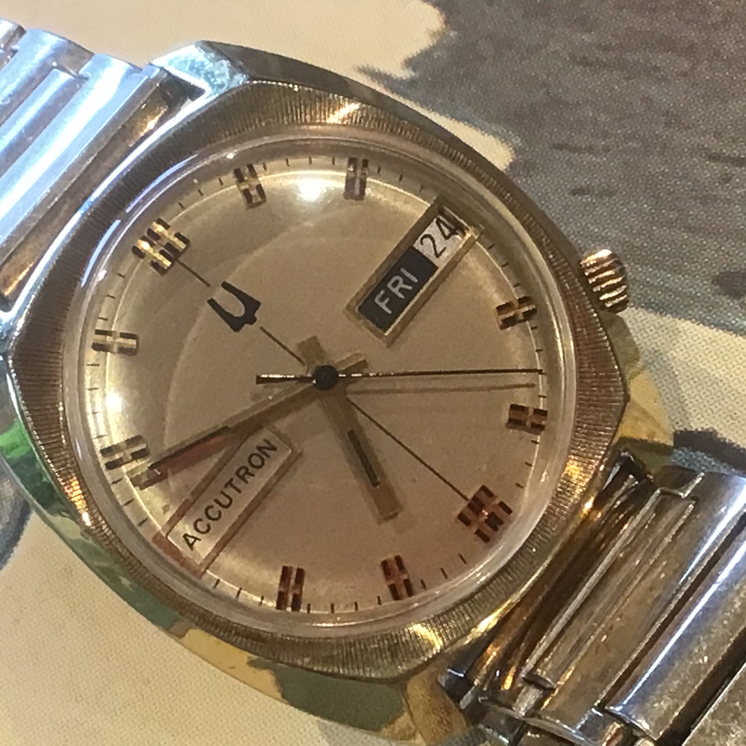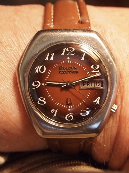 Definitely not yer typical “Ho-hum” hummer, this one! This one doesn’t have the original caseback on it, so I have to speculate on the vintage. The colour of the dial, and the ”fumed” motif tells me it is likely late 1960s or early 1970s. When the first owner saw this one in a showcase showing many contemporary Accutrons back in the day (50 years ago), what did he have in mind choosing such an off the wall style? The only one of this model I have ever seen. I wear it periodically, because it is “different”. Perhaps that is what appealed to the original owner. Accutron 218, day-date.