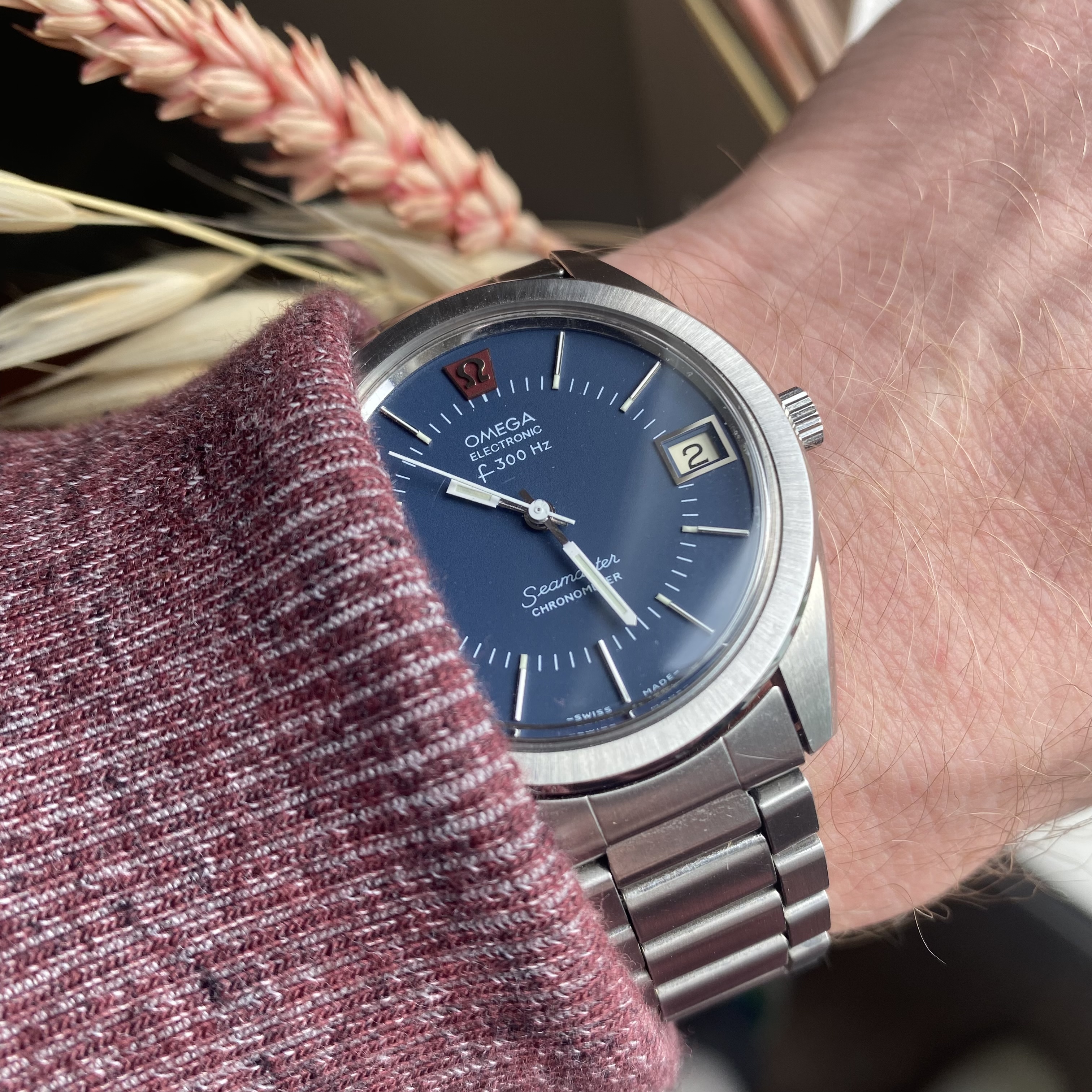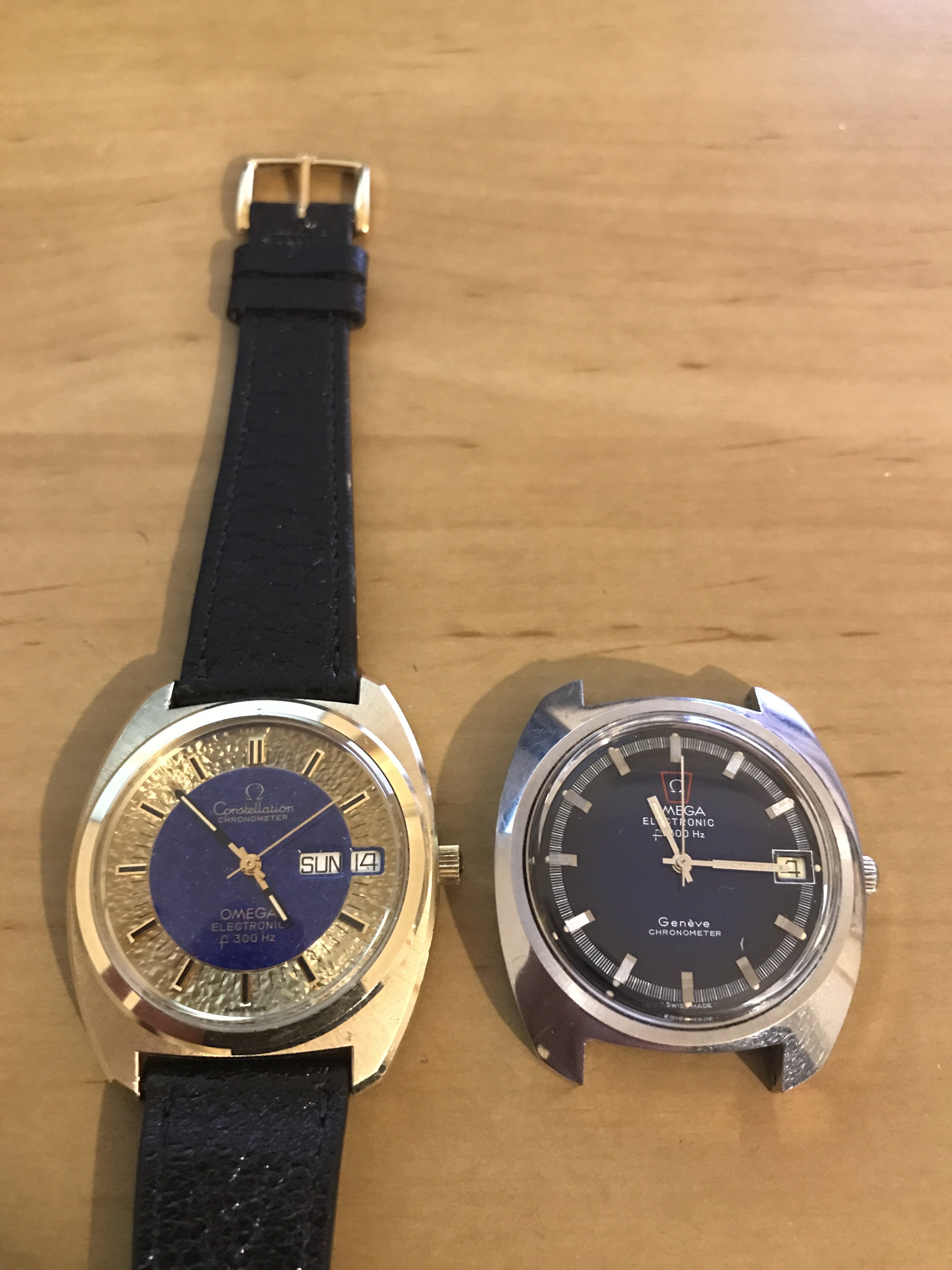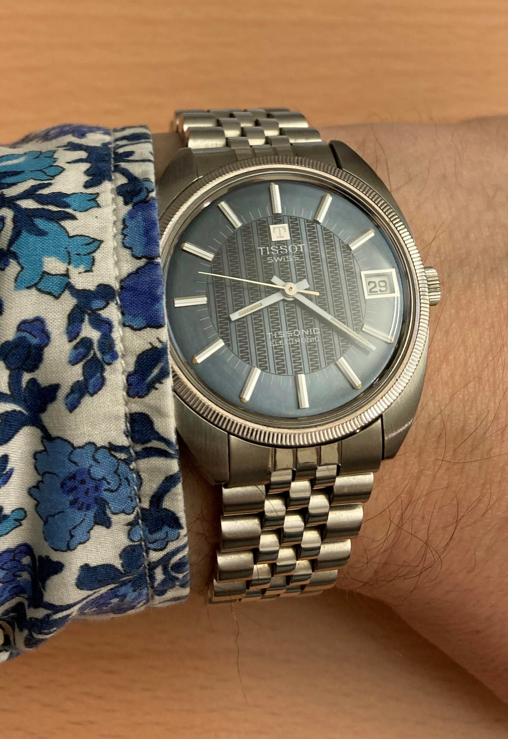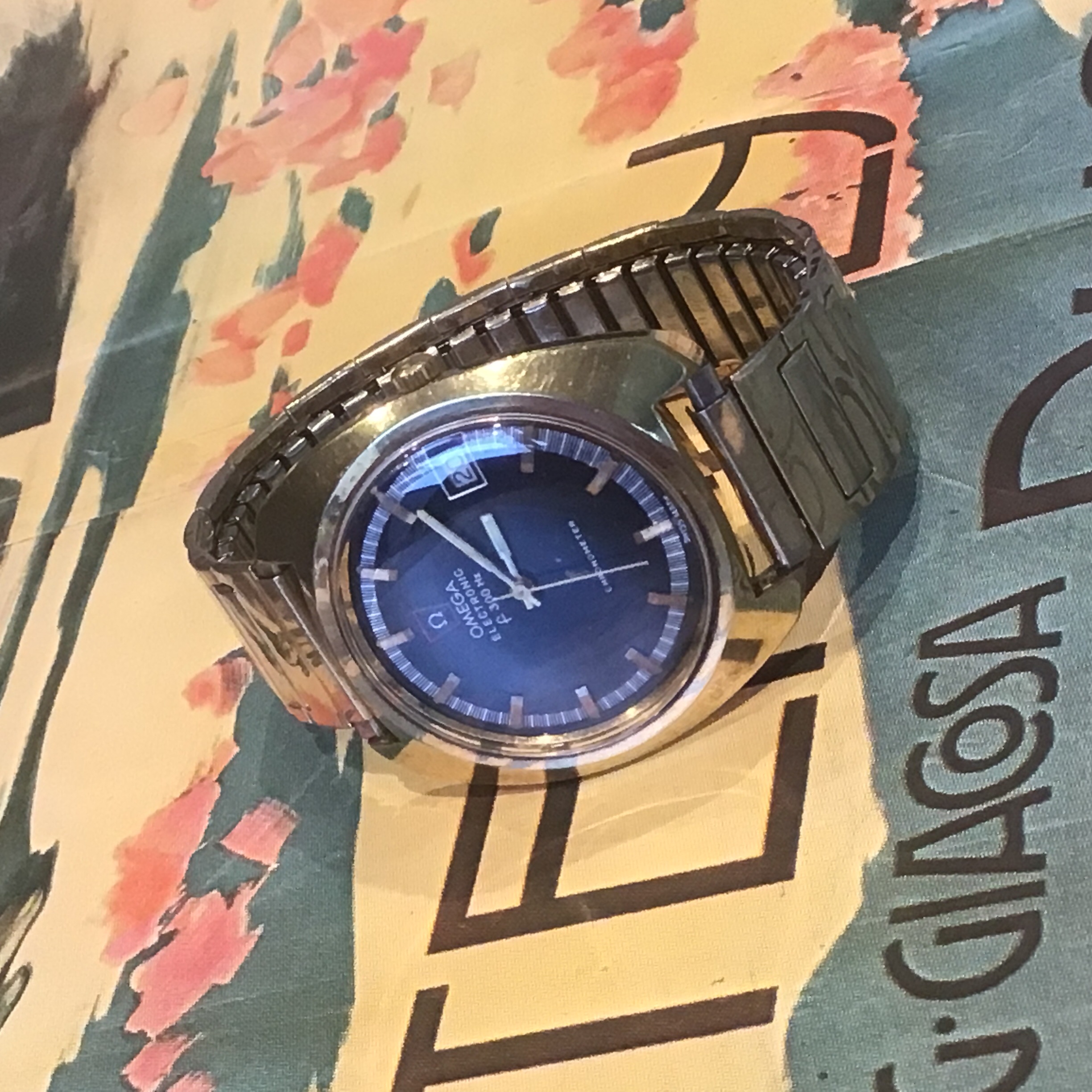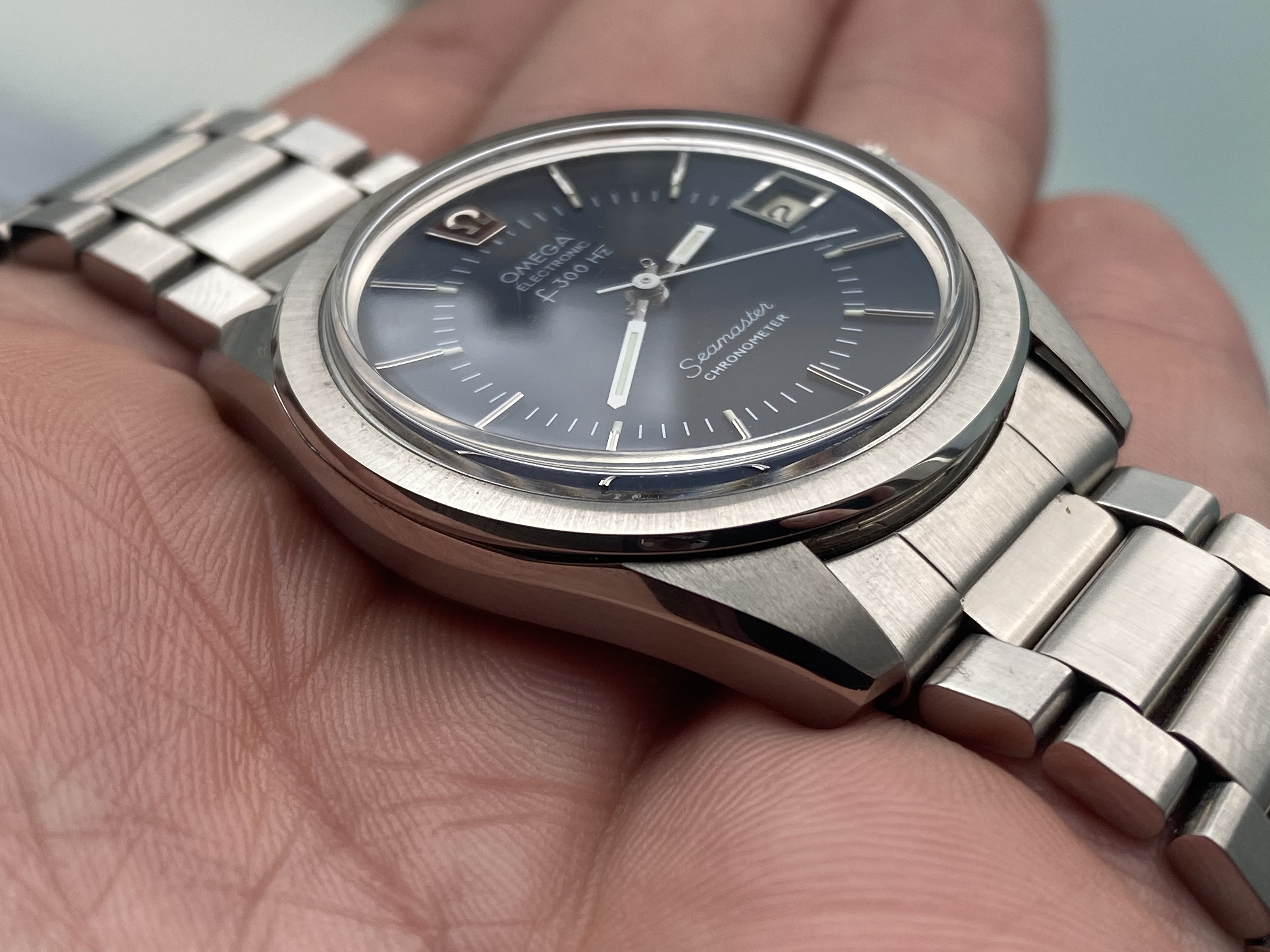 Definitely not yer typical “Ho-hum” hummer, this one! This one doesn’t have the original caseback on it, so I have to speculate on the vintage. The colour of the dial, and the ”fumed” motif tells me it is likely late 1960s or early 1970s. When the first owner saw this one in a showcase showing many contemporary Accutrons back in the day (50 years ago), what did he have in mind choosing such an off the wall style? The only one of this model I have ever seen. I wear it periodically, because it is “different”. Perhaps that is what appealed to the original owner. Accutron 218, day-date.