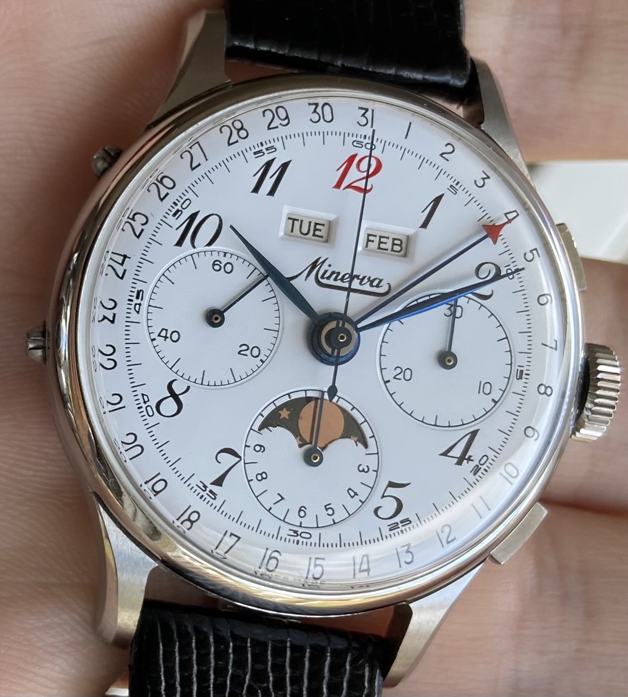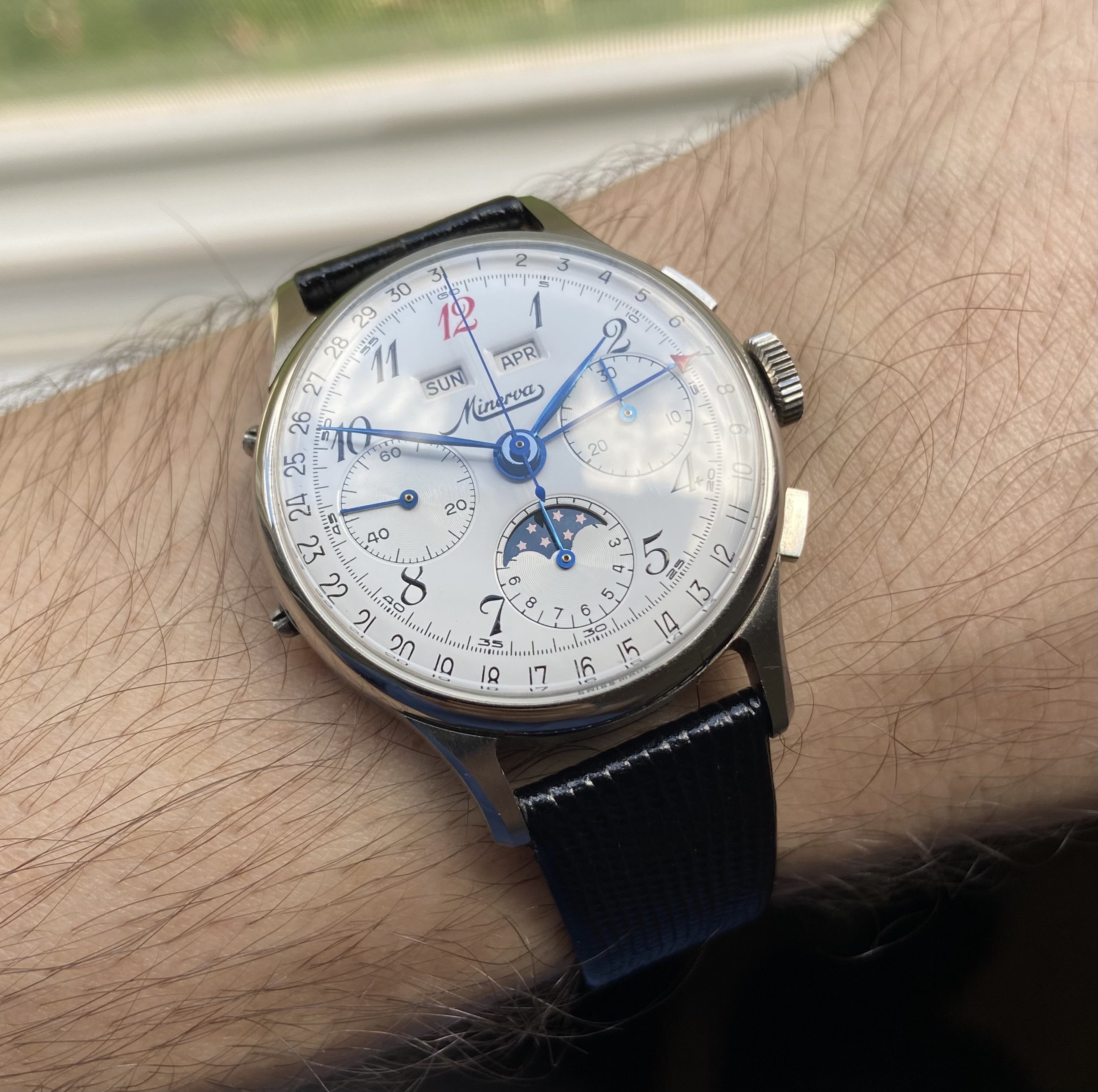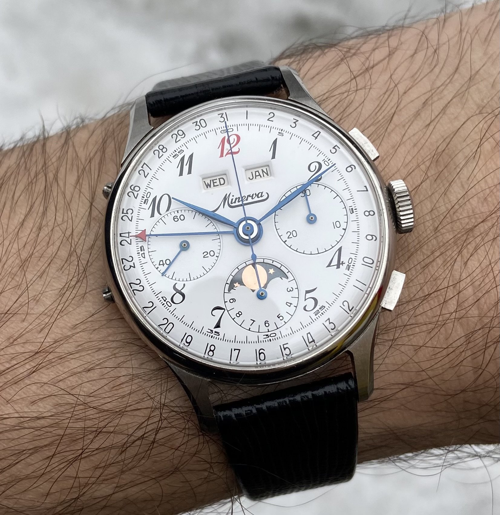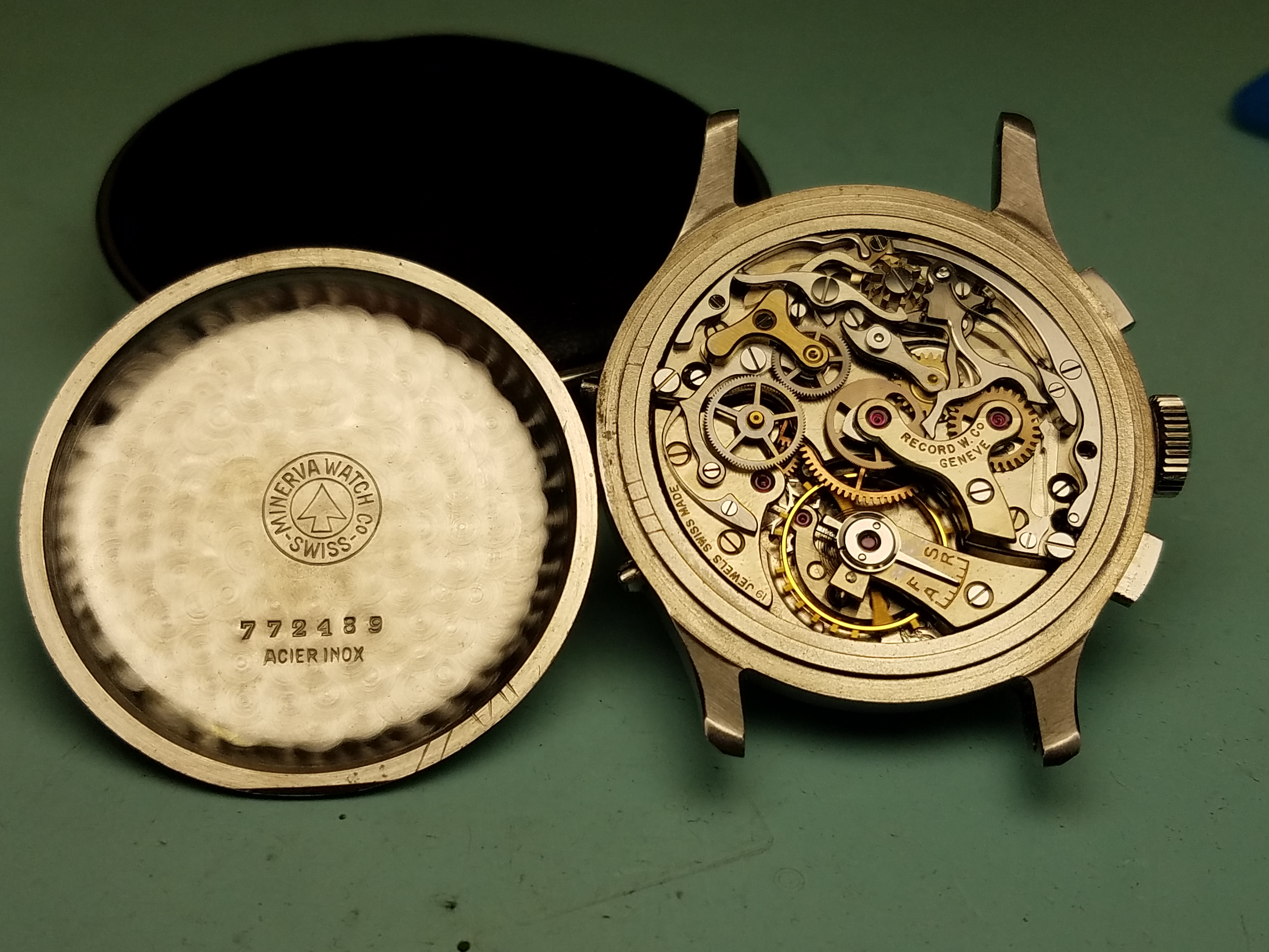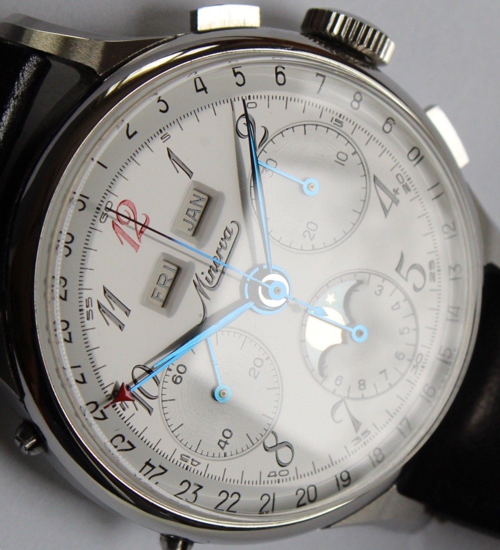 Mine is a Valjoux 88 (72C with the moonphase added). Rumor has it they found some NOS movements and made these in the 80s-90s. Not much other info around on mine I'm afraid. My movement is signed by Record which is strange and unfortunate. Oh well. I may start another thread at some point because in doing research I’ve found other Minervas with unsigned or cross signed movements.