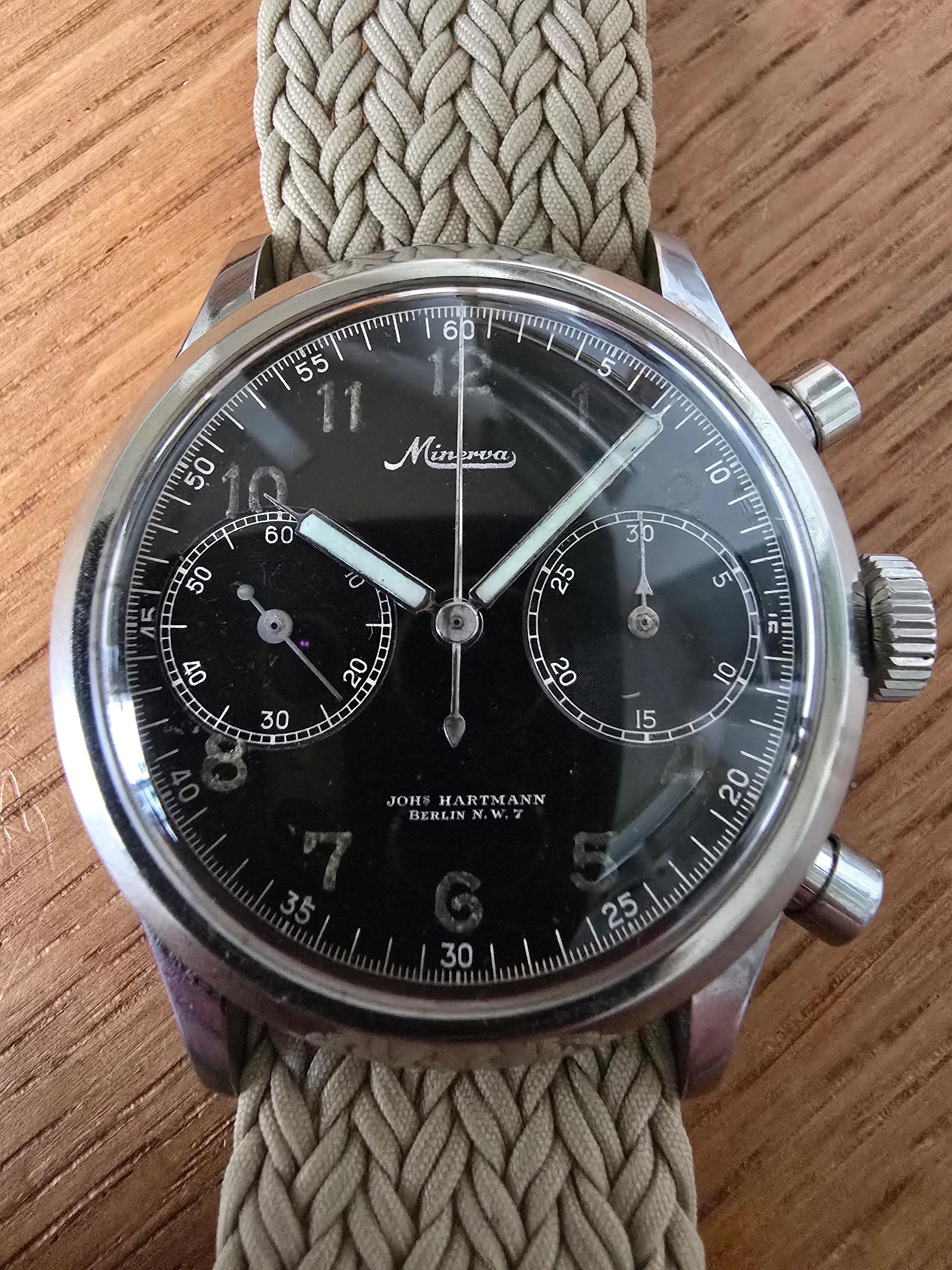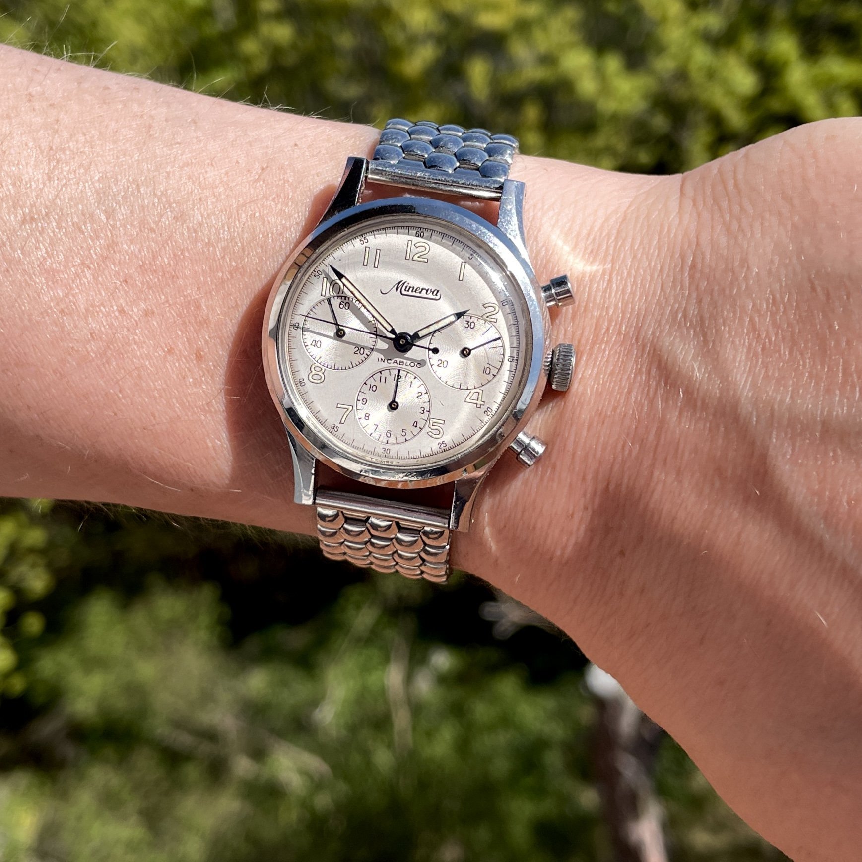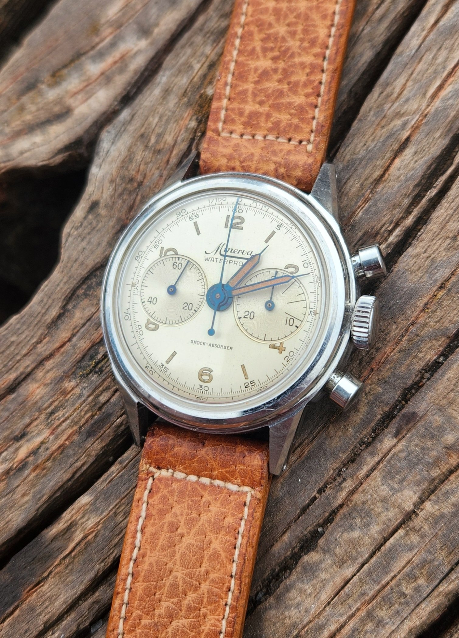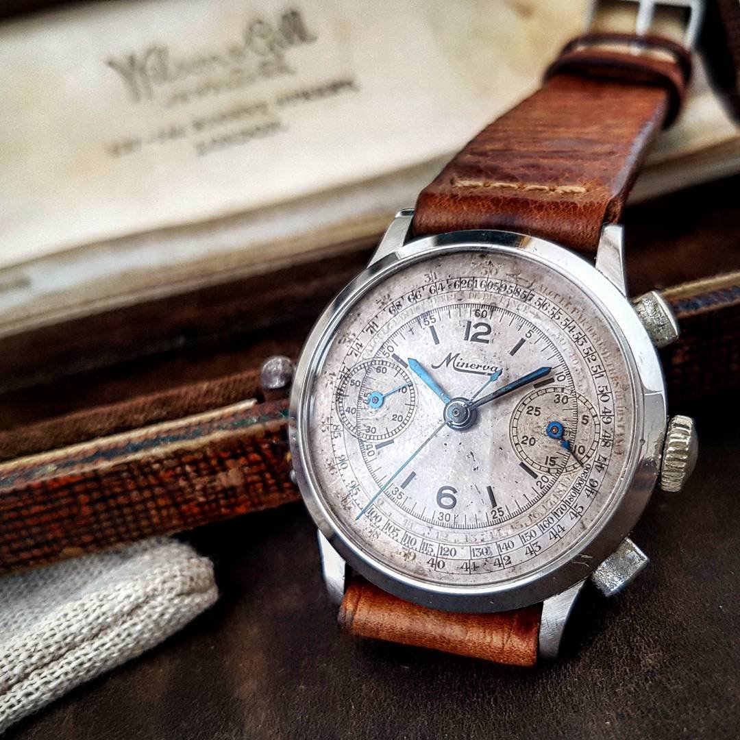 Here’s mine, an officer’s chronograph with the 13-20CH movement from the early 1940s in a mid-size 33mm stainless steel case. The heavily patinaed silver dial complemented by those blued hands definitely goes a long way.