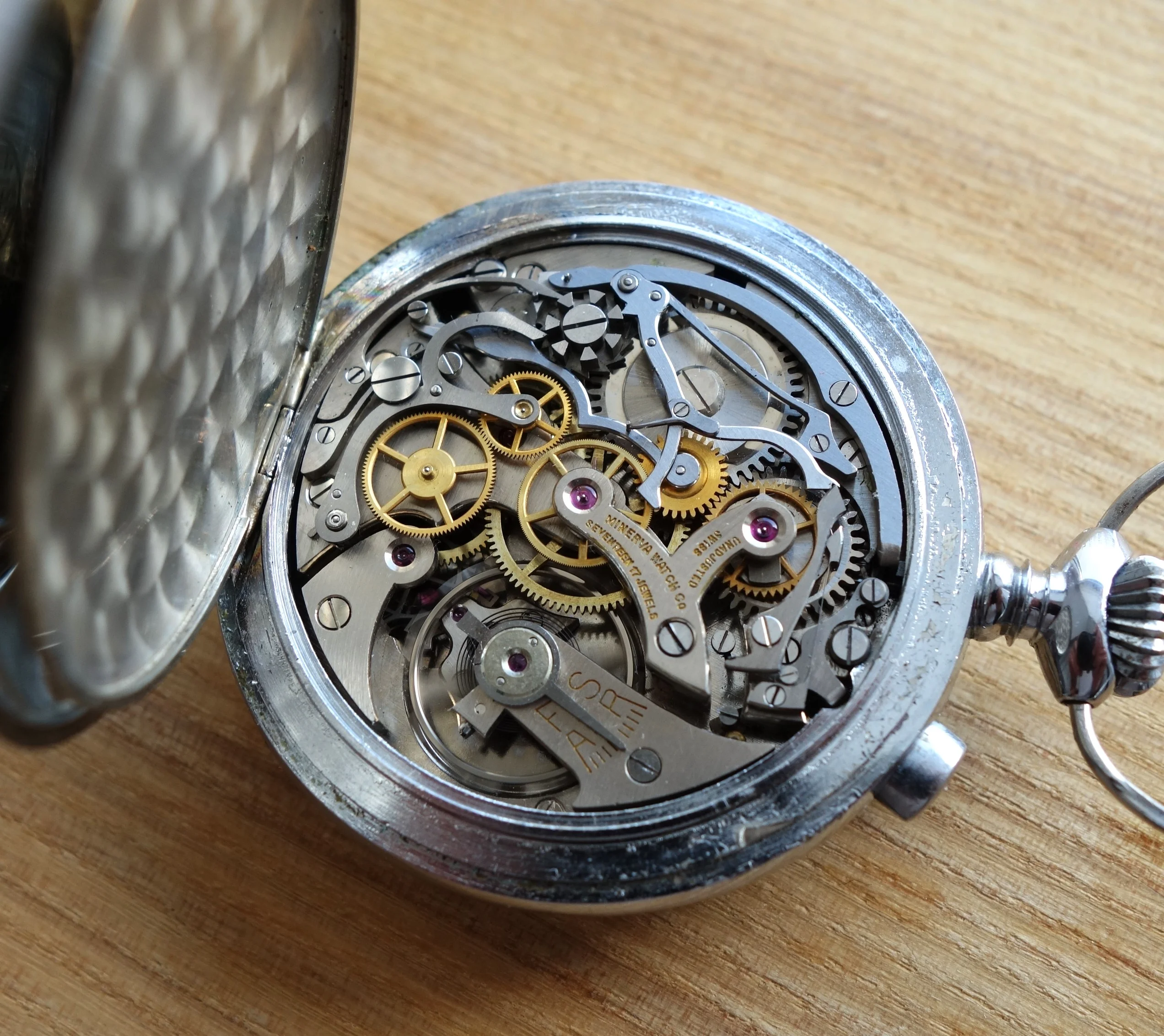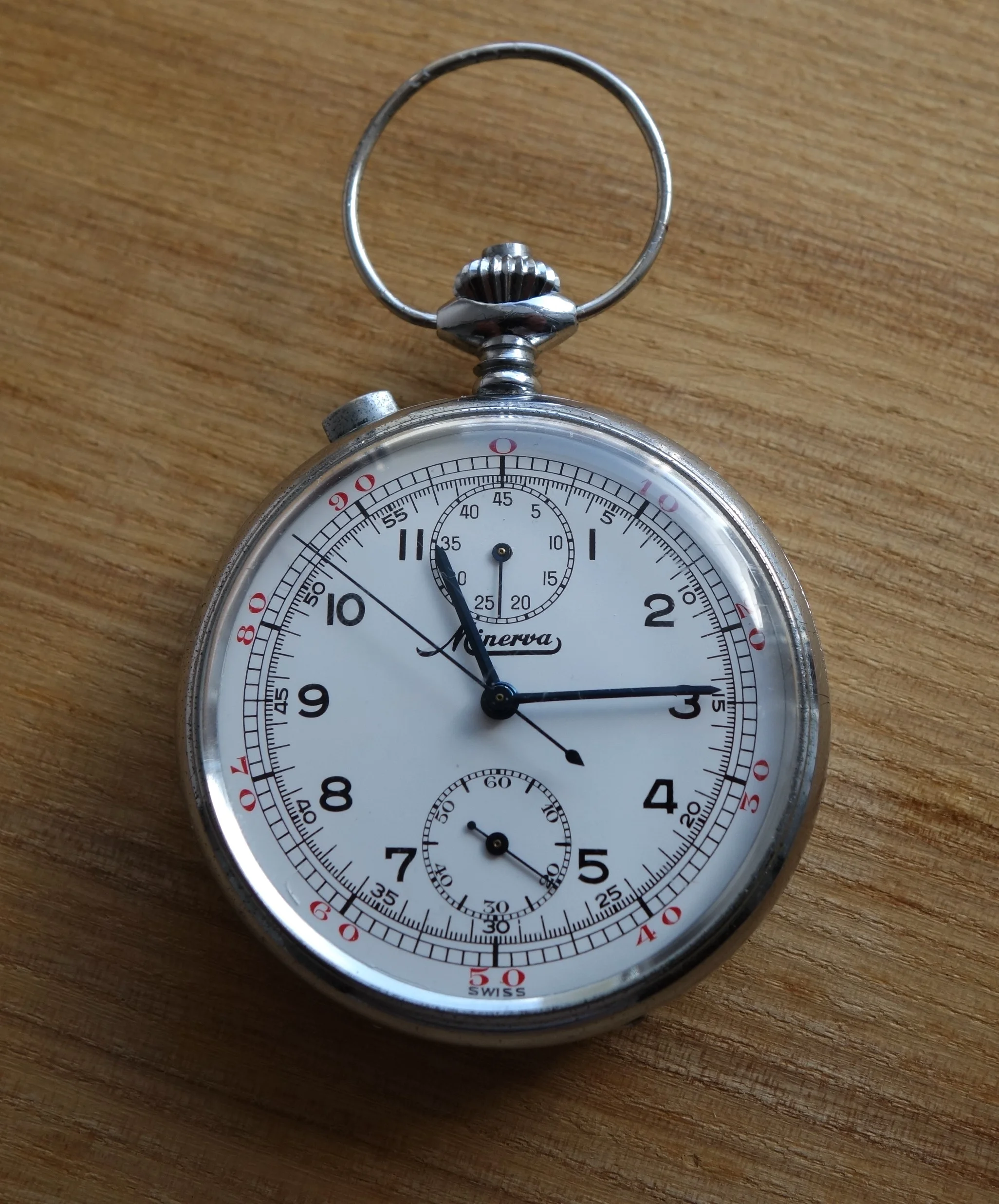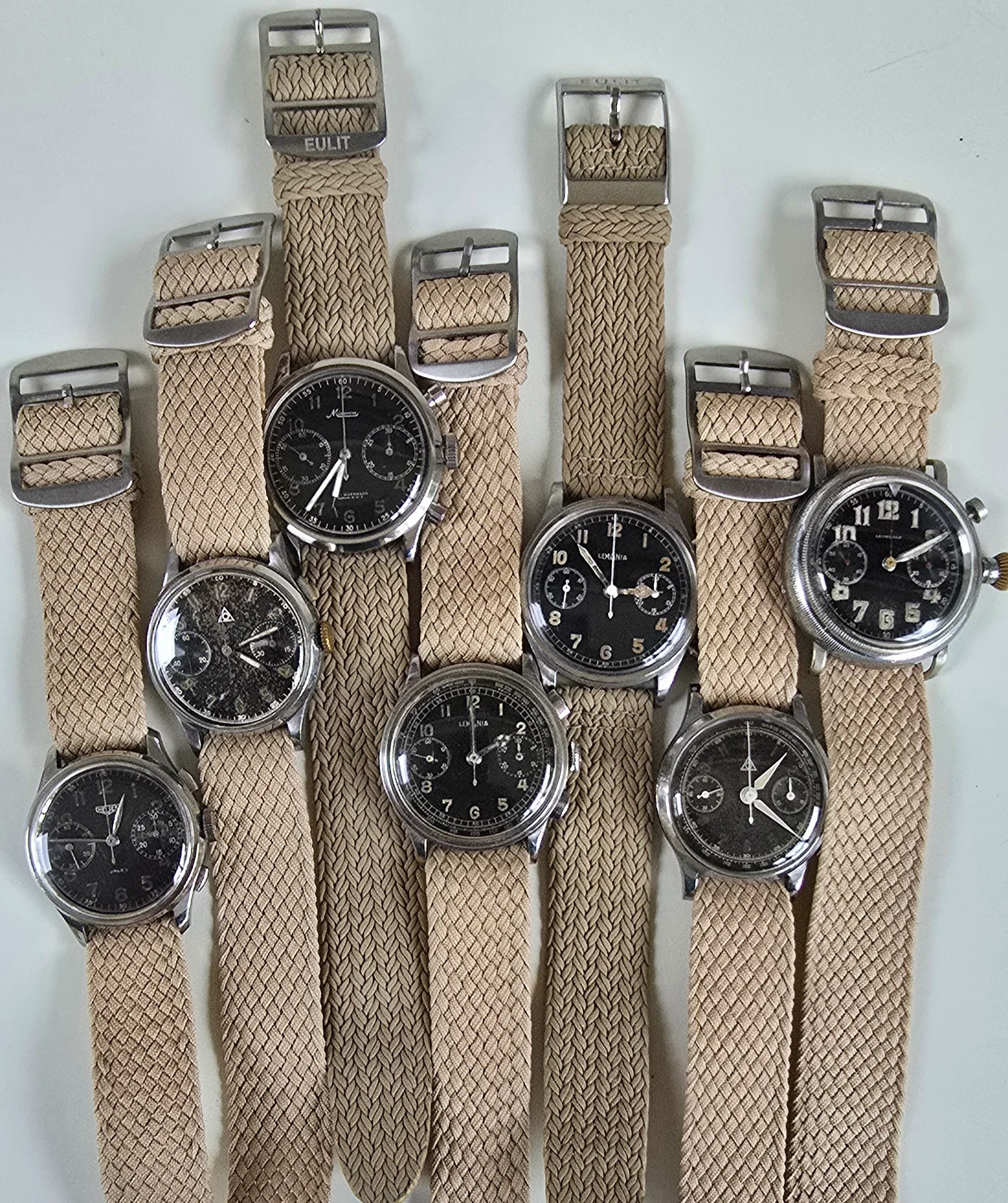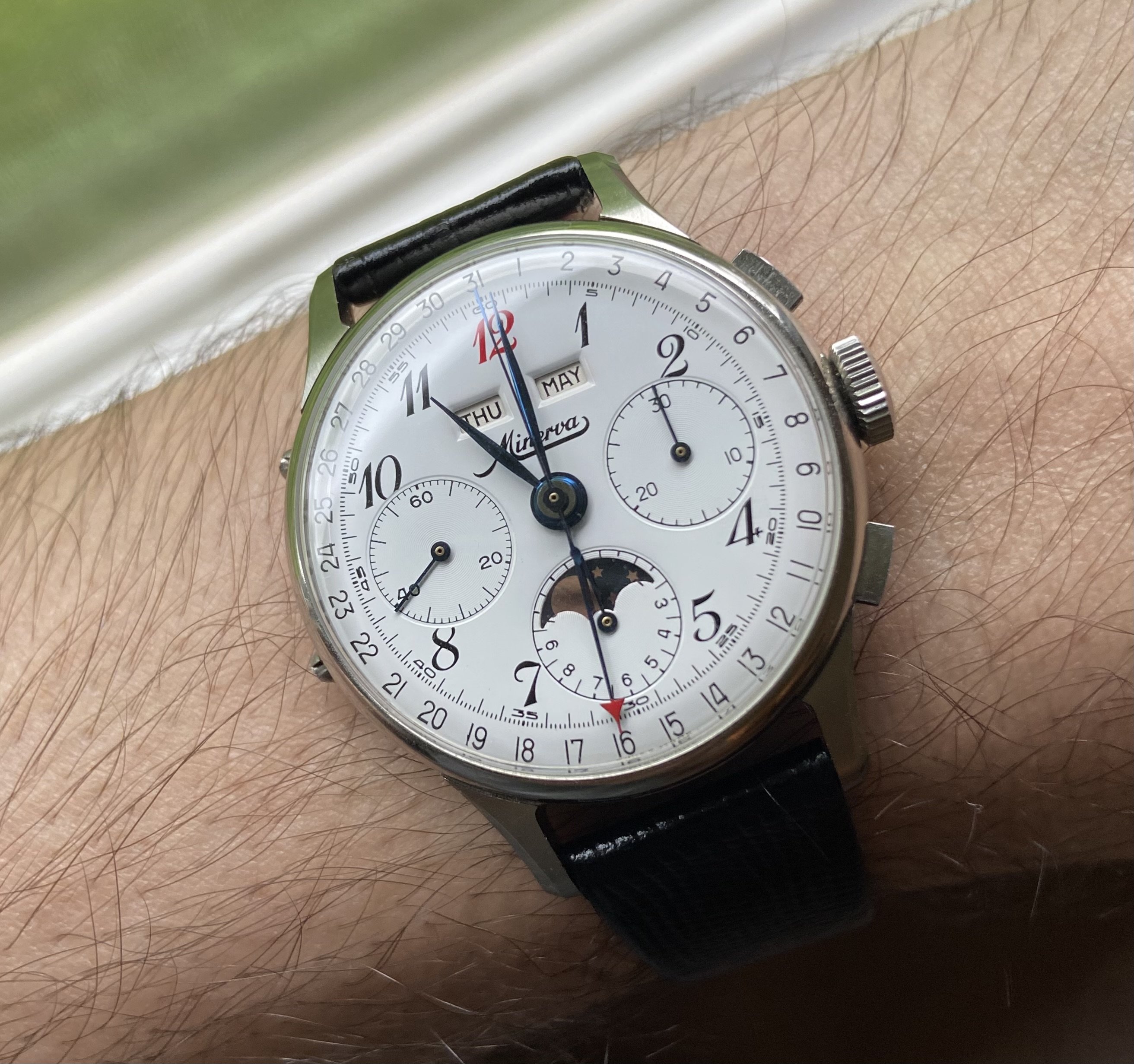 Here’s mine, an officer’s chronograph with the 13-20CH movement from the early 1940s in a mid-size 33mm stainless steel case. The heavily patinaed silver dial complemented by those blued hands definitely goes a long way.