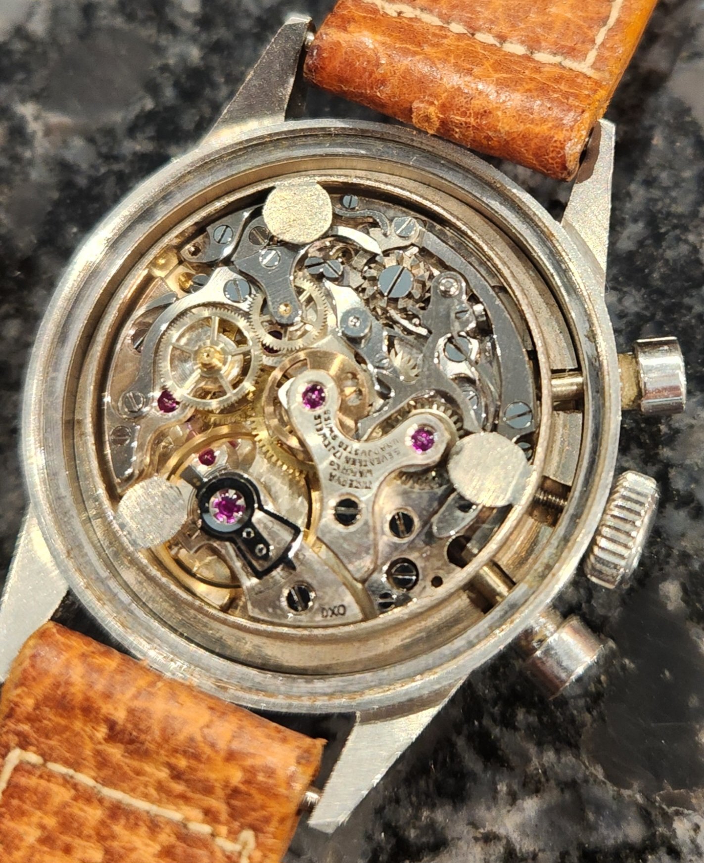 It's one of the larger V69 cases at 31.5mm, 16mm lugs. Also uncommon for this already uncommon movement are the finishing of the movement, shock protection, and round pushers.