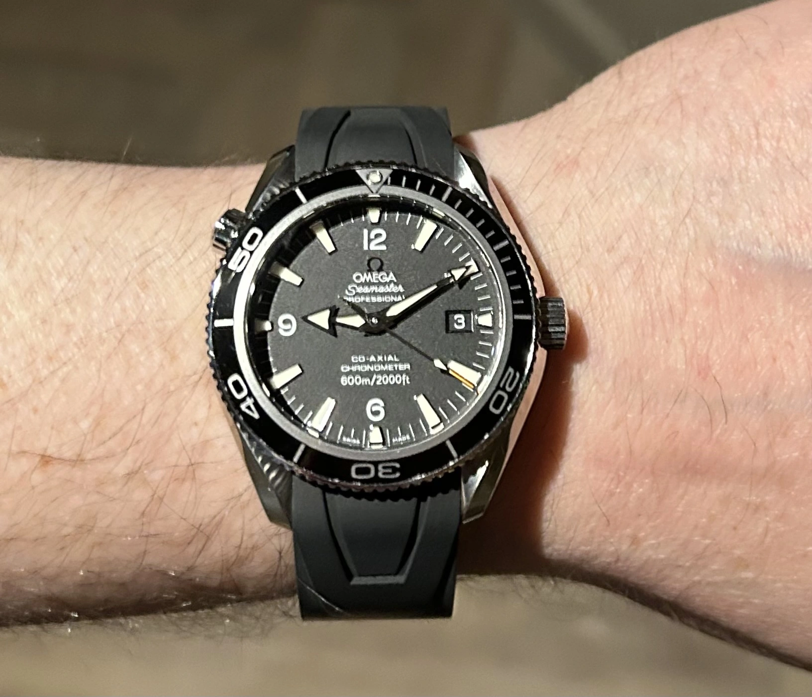 Beautiful. I believe that is the Planet Ocean that Daniel Greg wore during his 1st outing as Bond in Casino Royale. 46mm diameter I believe, looks great on your wrist.