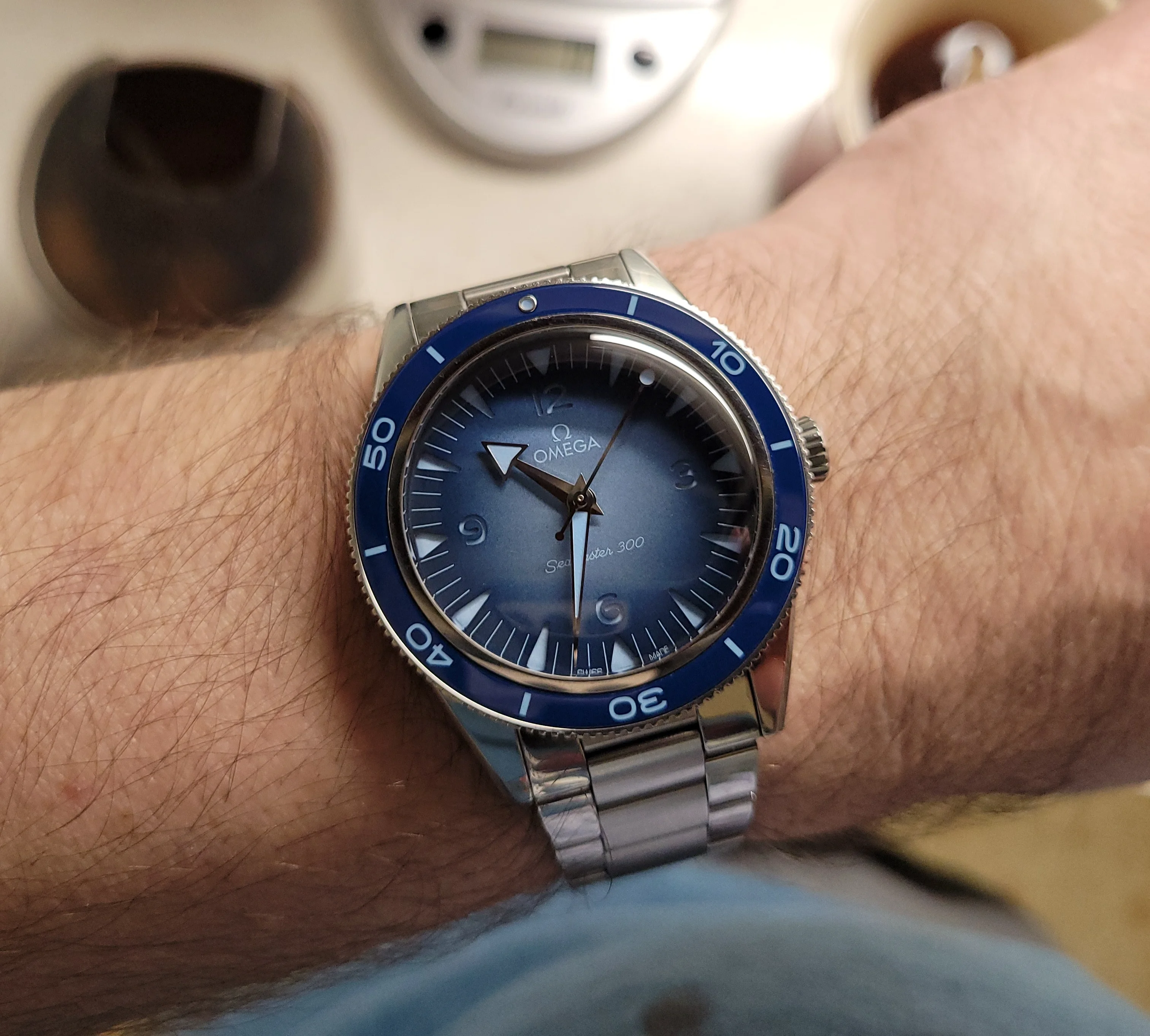 I still absolutely love the depth and subtlety of this dial, so here's a shadowed shot highlighting the tones and sandwich while I pour myself a second cup of coffee. But-- what I really want to see is a whole bunch of pictures of the new no date seamaster! Can anyone oblige?
