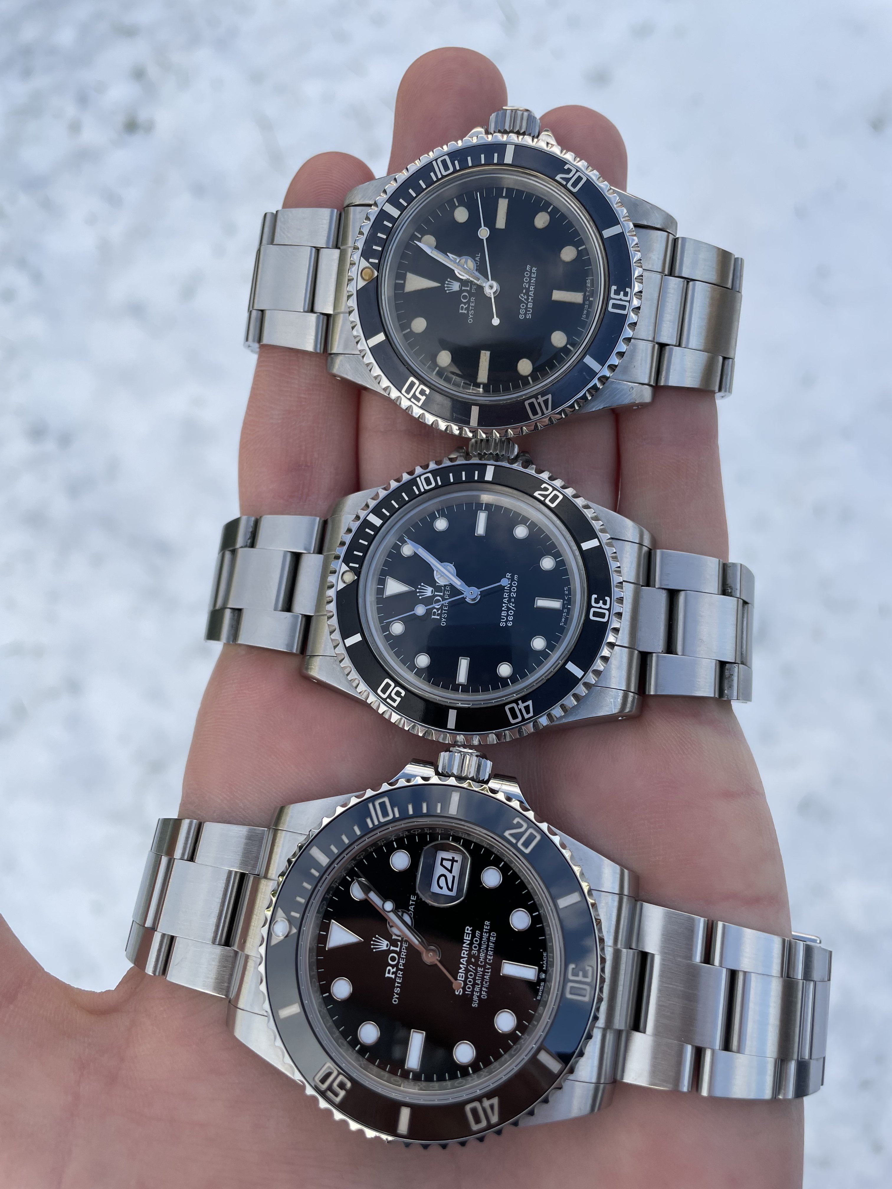 My 3 generations of Submariners: 126610LN, 2021, 5513 L-series,1989, and 5513 non-serif, 1970. Love them all