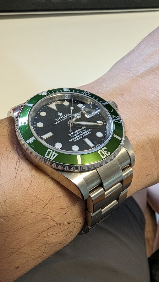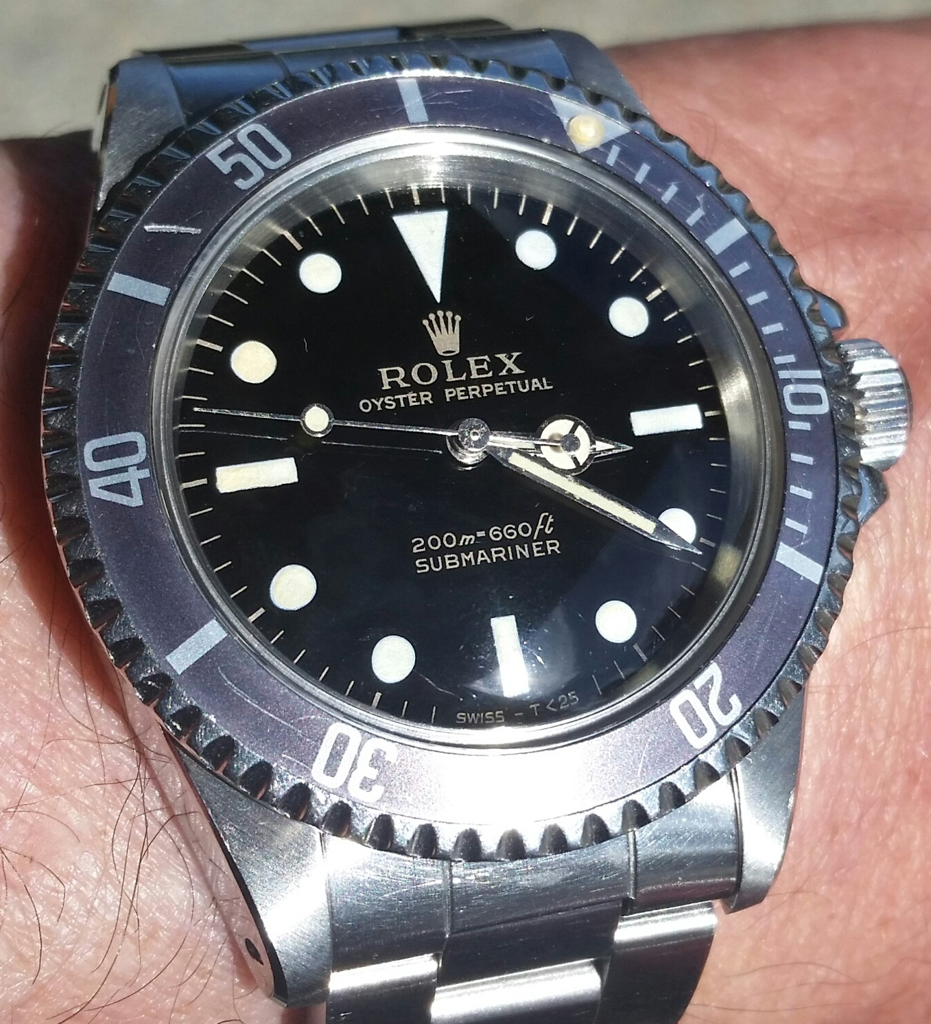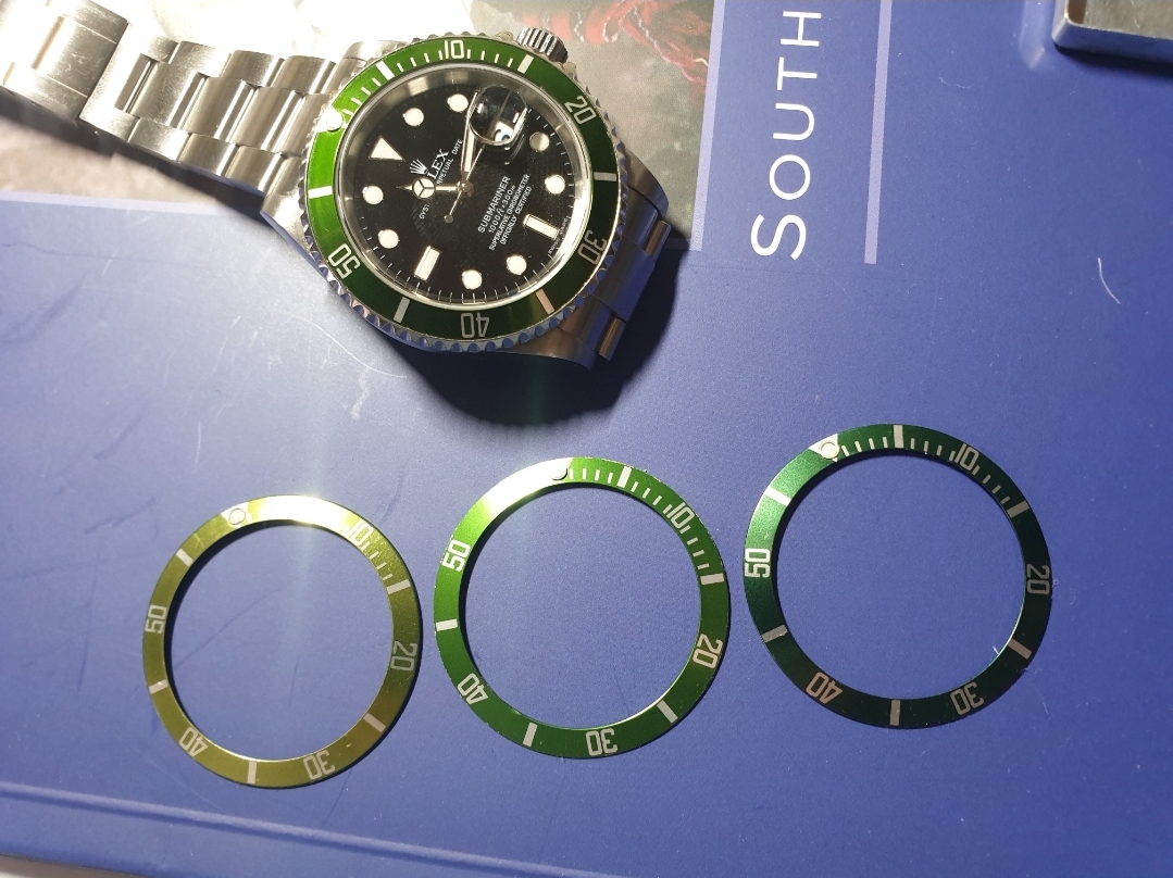 Service is a darker shade. Earlier bezels were a variety of different shades, depending on the specific time within the 7yr run. The lime shade (on the left) was 2005. There was a good write-up somewhere but i can't find it now..will have a dig around tomorrow.