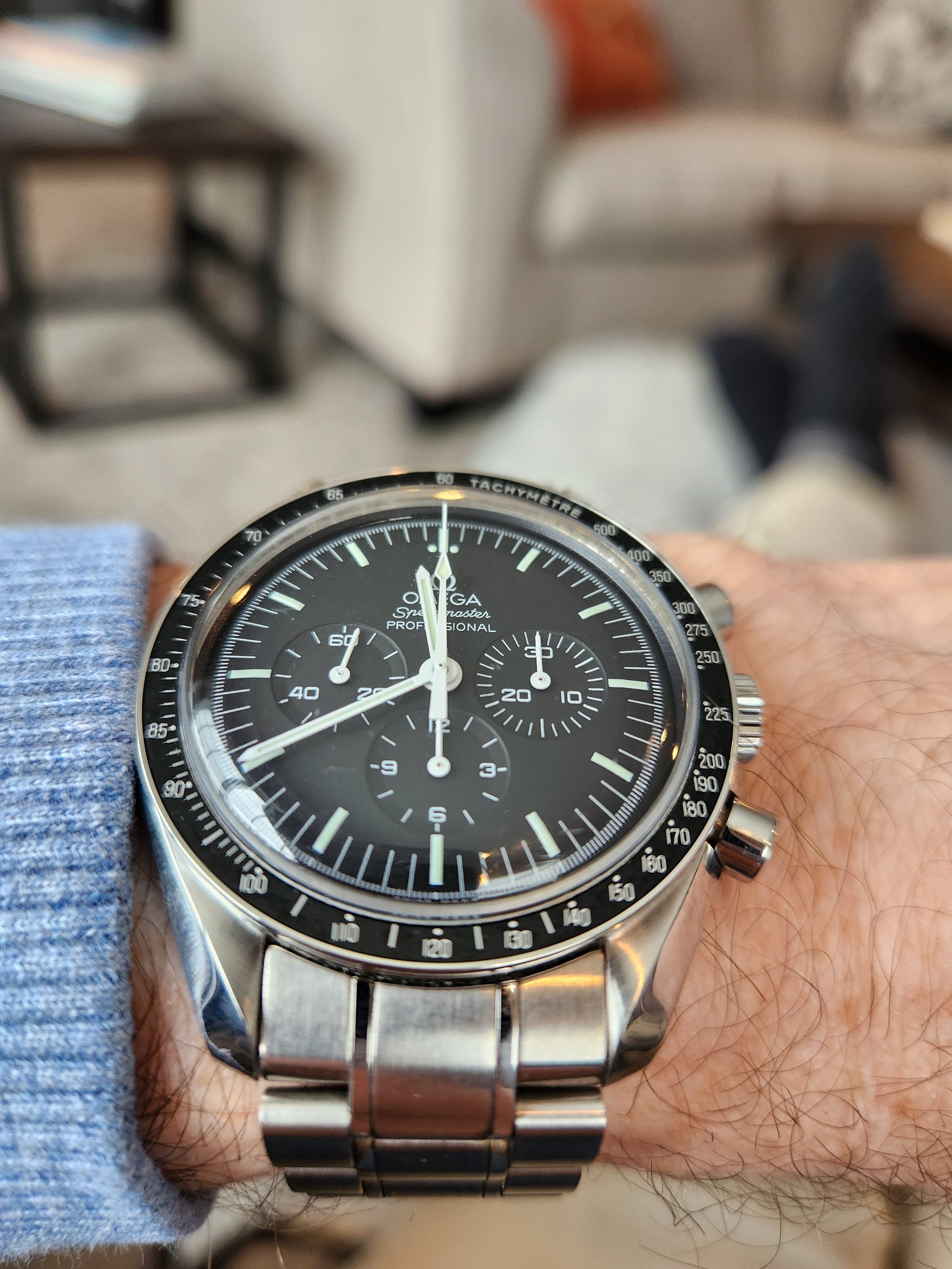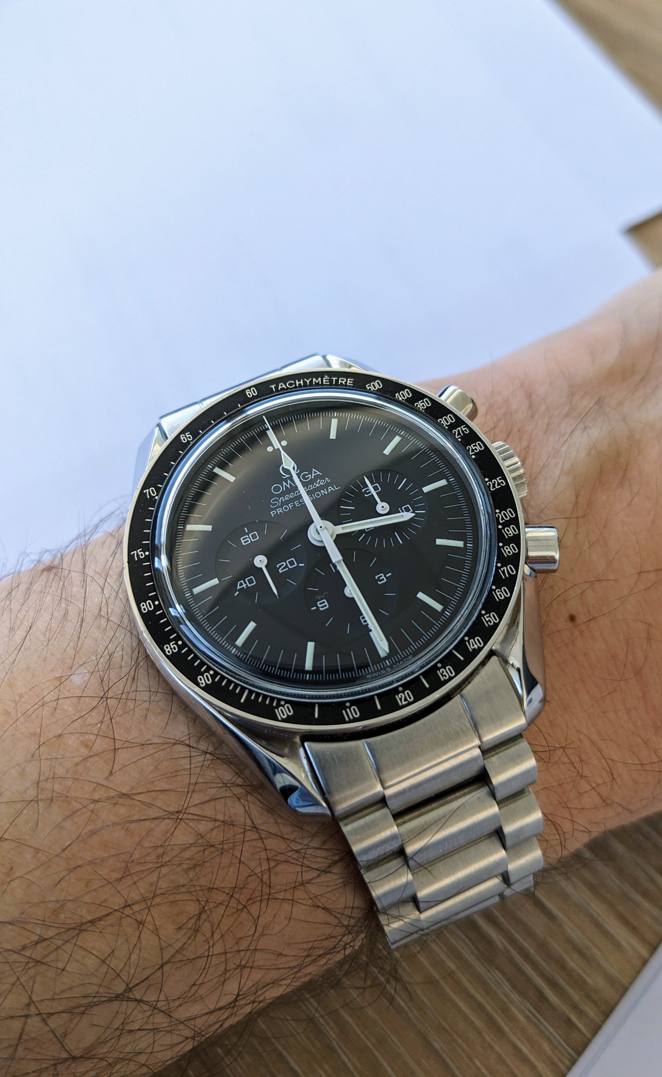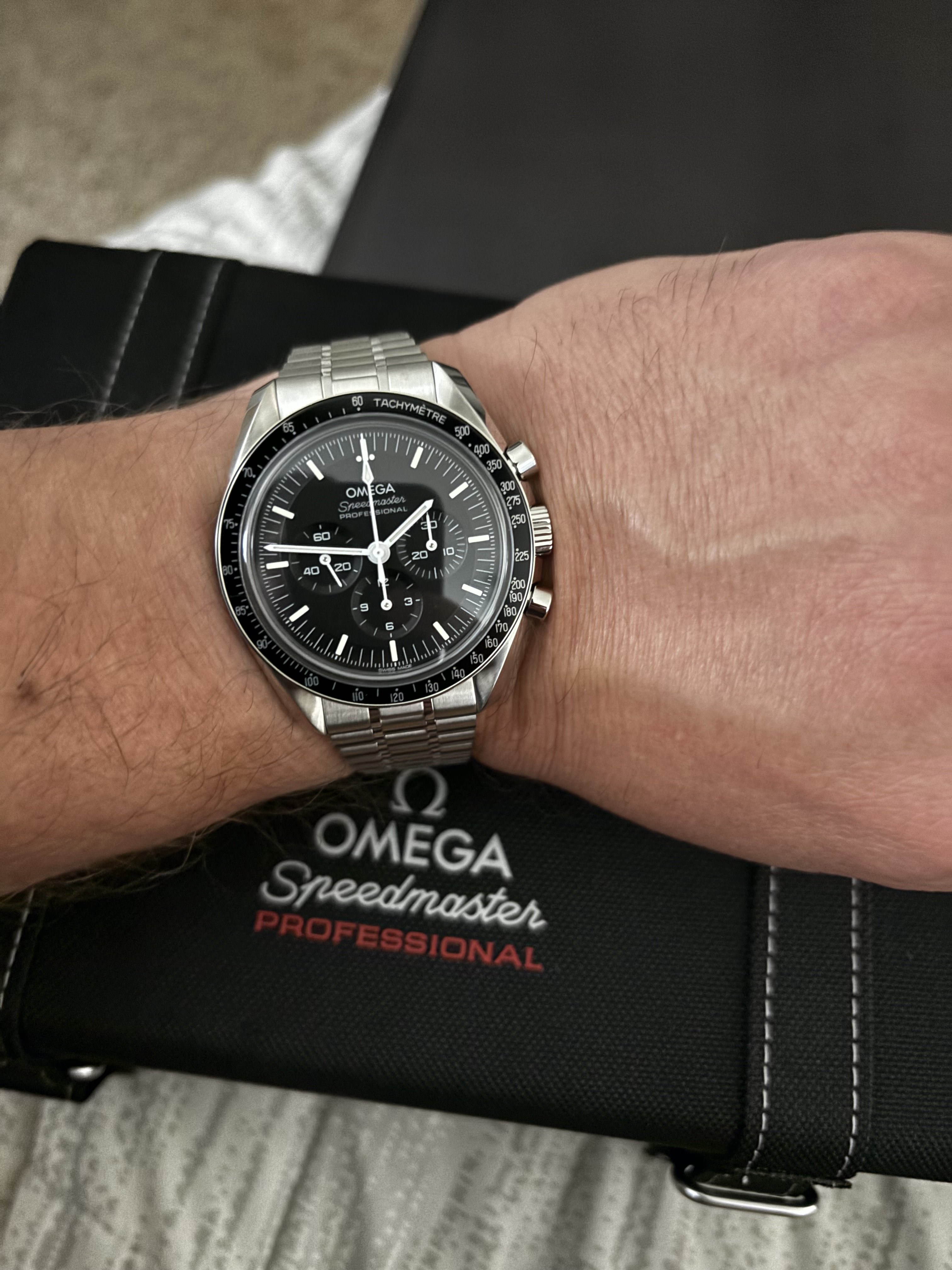 R Posts 1 Likes 3 Rapier84 路Jan 30, 2024 Got my first (hopefully not last) Speedy Pro (1861, Haselite) Was worried about the fit on my wrist but the Moonswatch helped 馃榾
