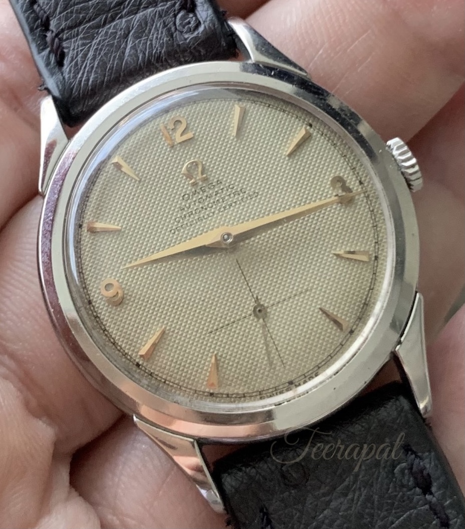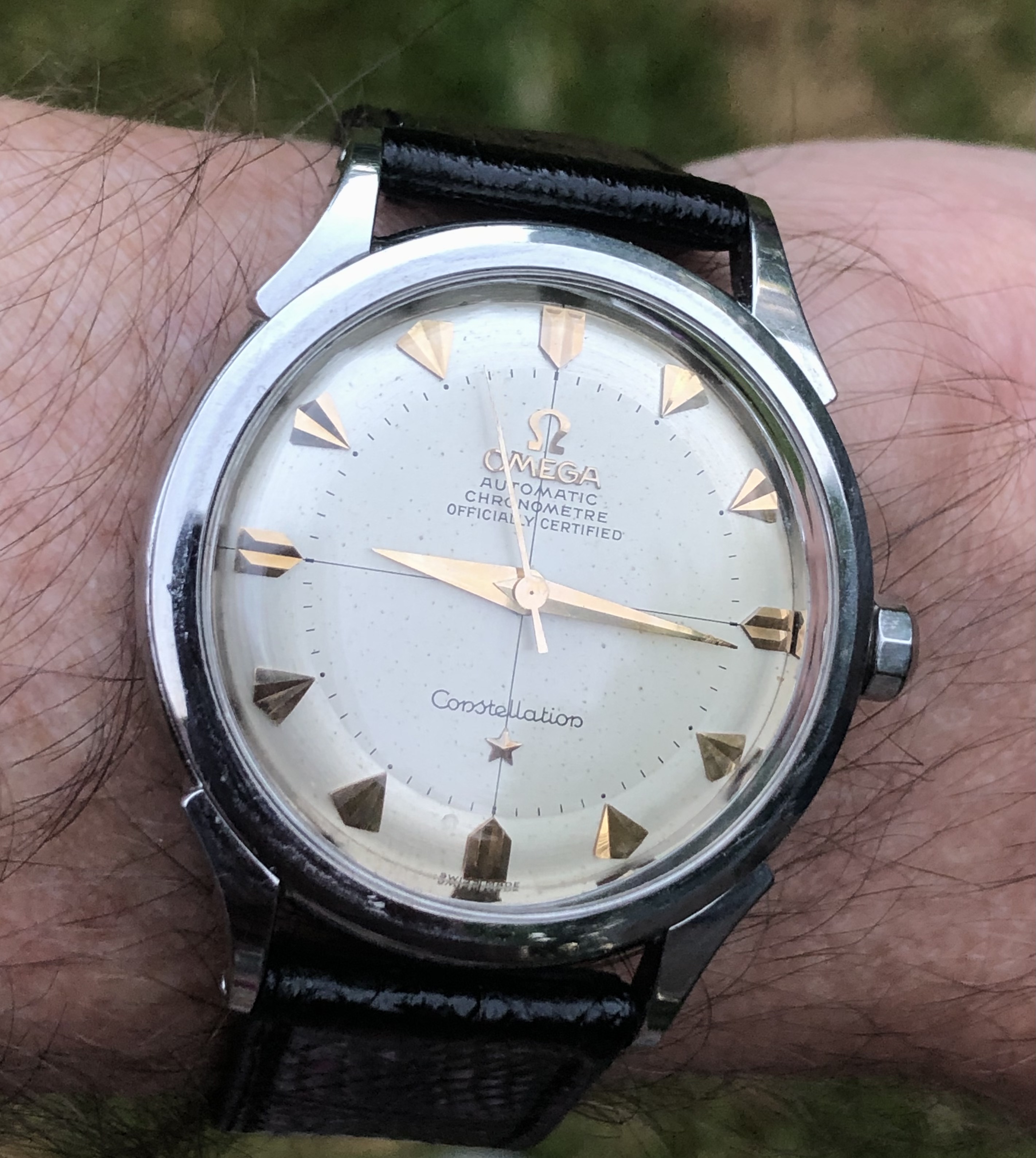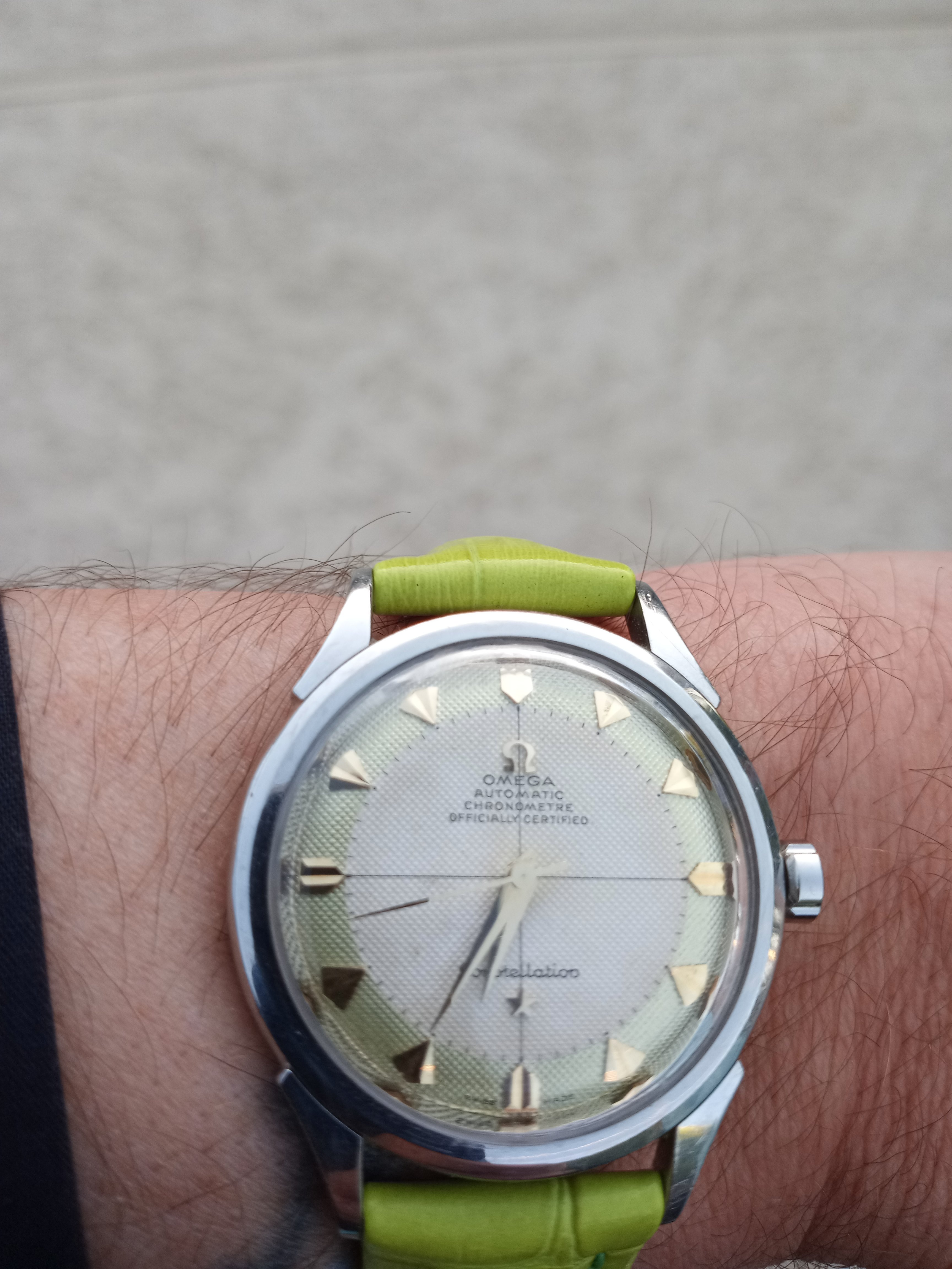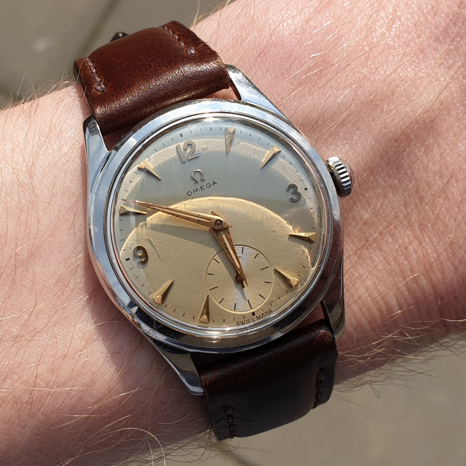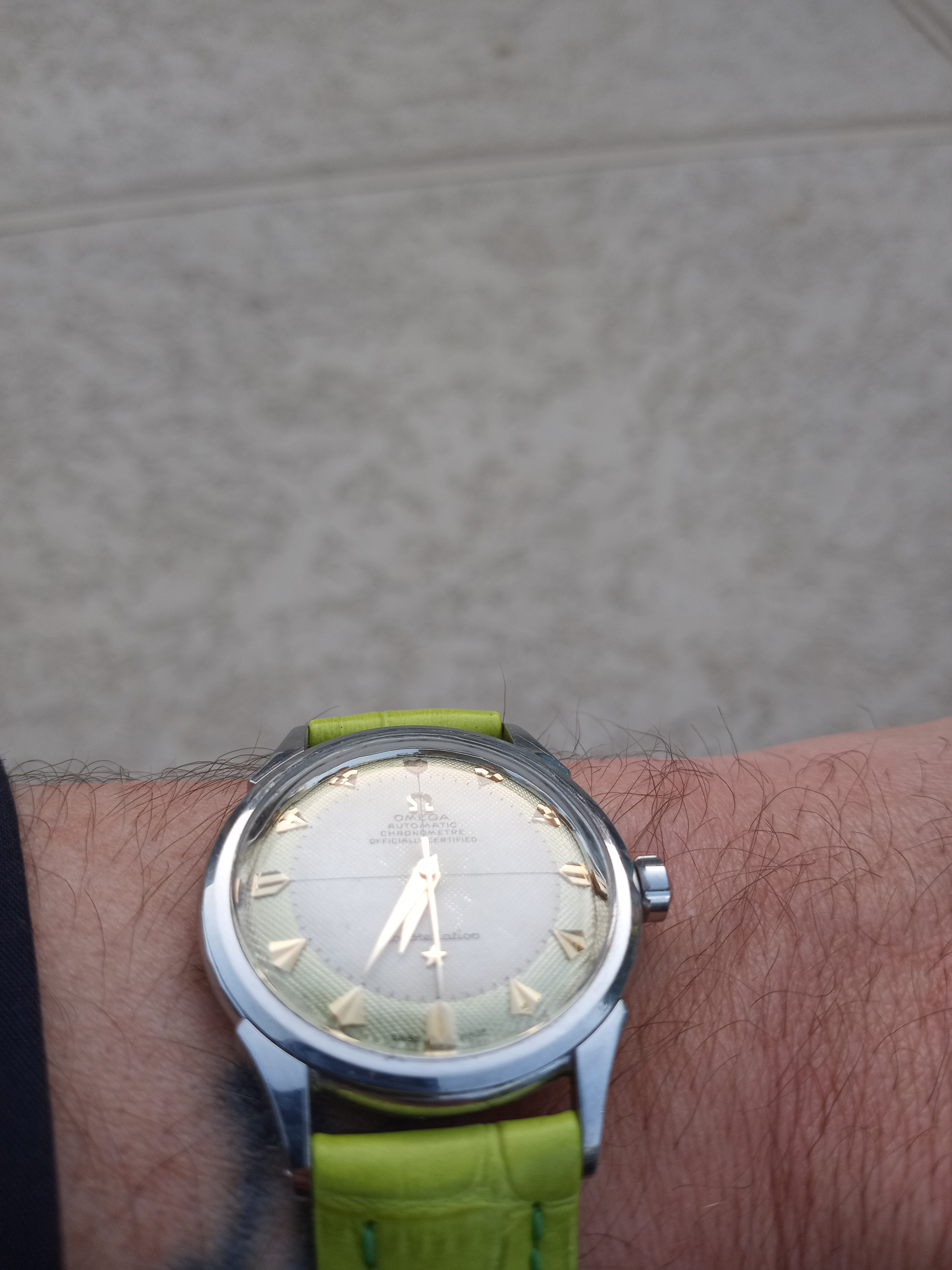 Posts 138 Likes 1,366 ScDevon ·May 30, 2021 View attachment 1230404 1953 DeVille Tresor. Two-tone SS / gold case. Honeycomb dial. Seller's pic and my wrist pic. Cal. 420. Edited: May 30, 2021