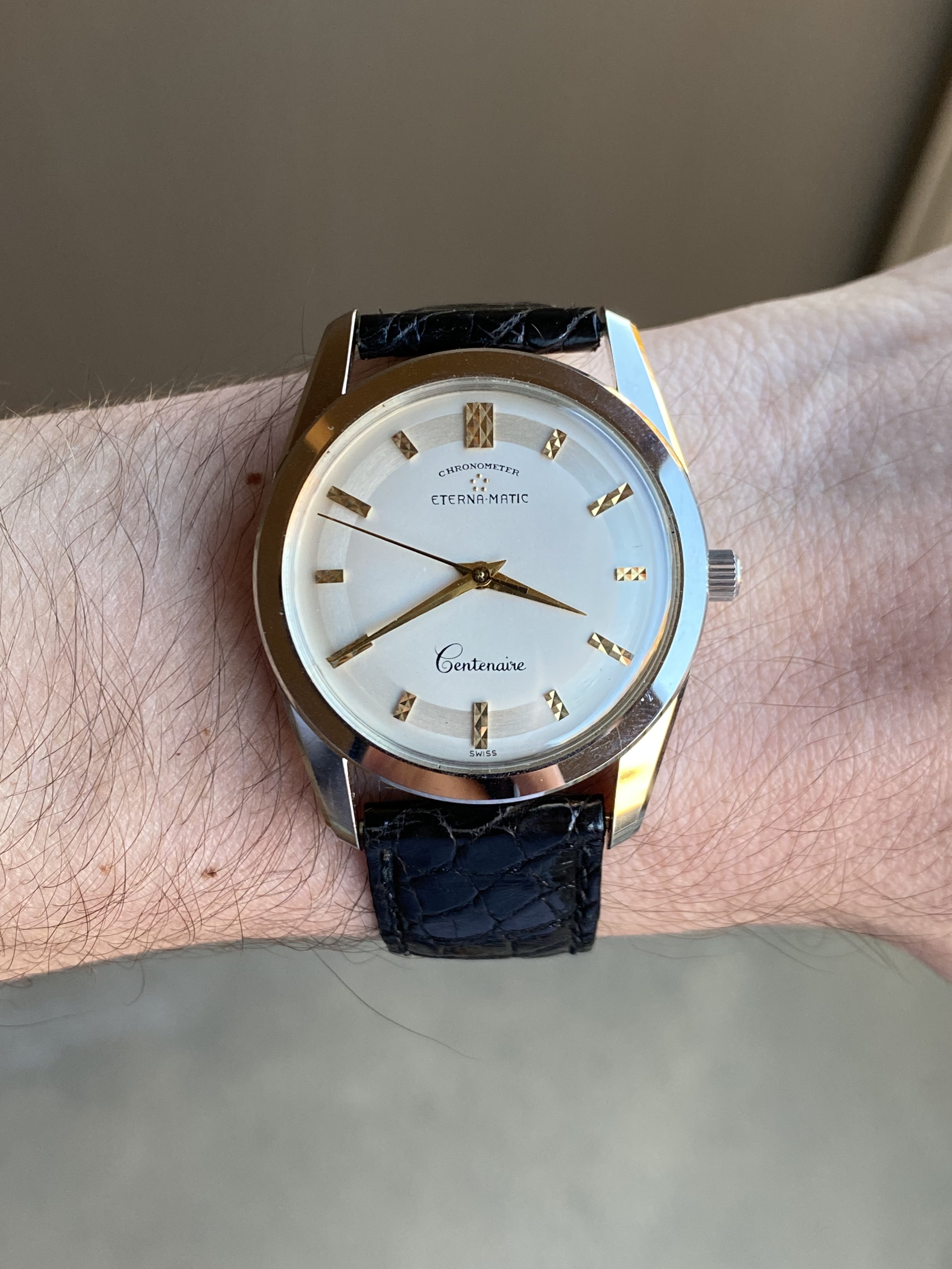 Posts 2,771 Likes 6,879 seekingseaquest ·Dec 14, 2021 A couple new additions that belong in this thread: Black gilt dial 14710 Eterna-matic Chronometer