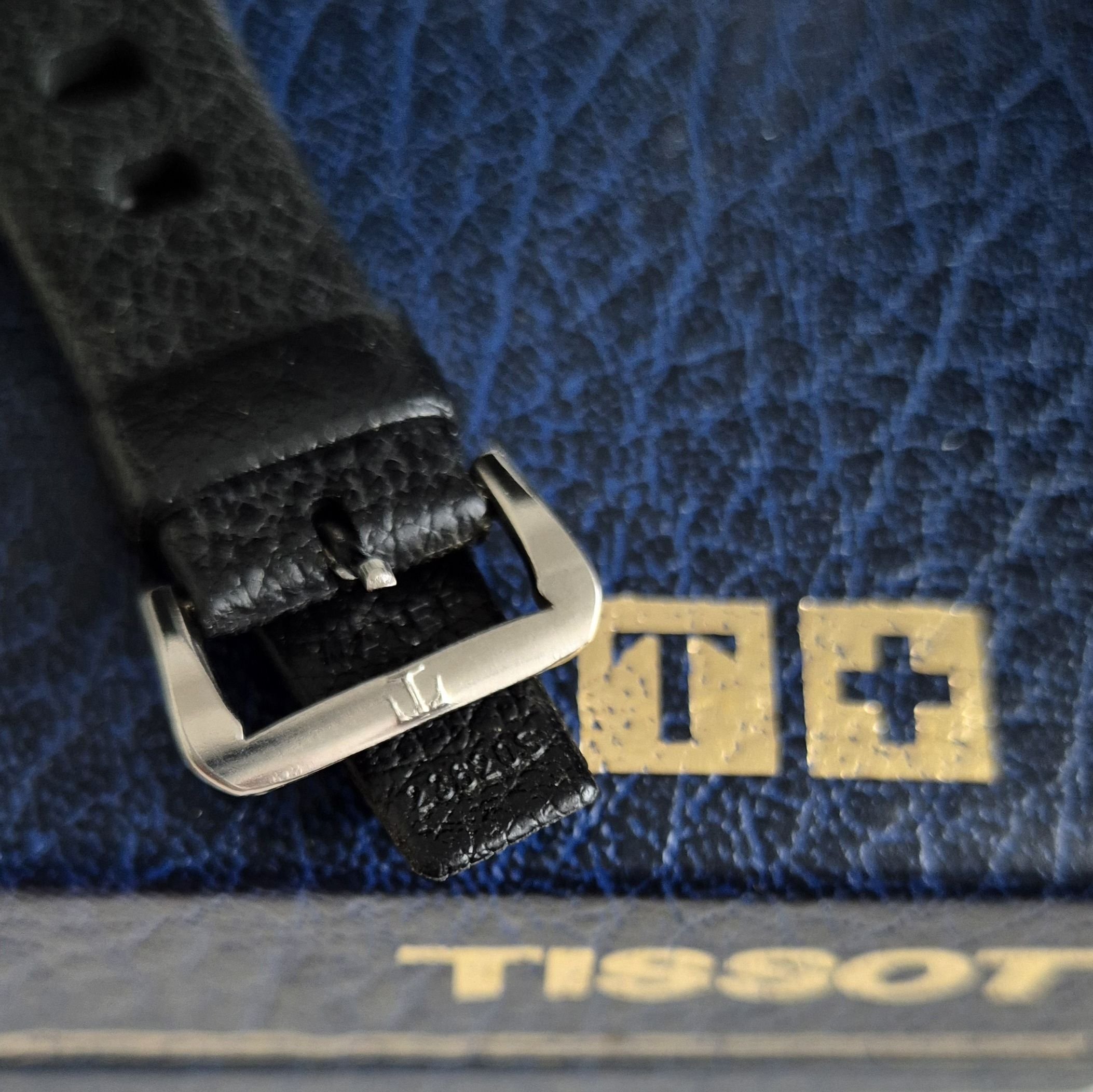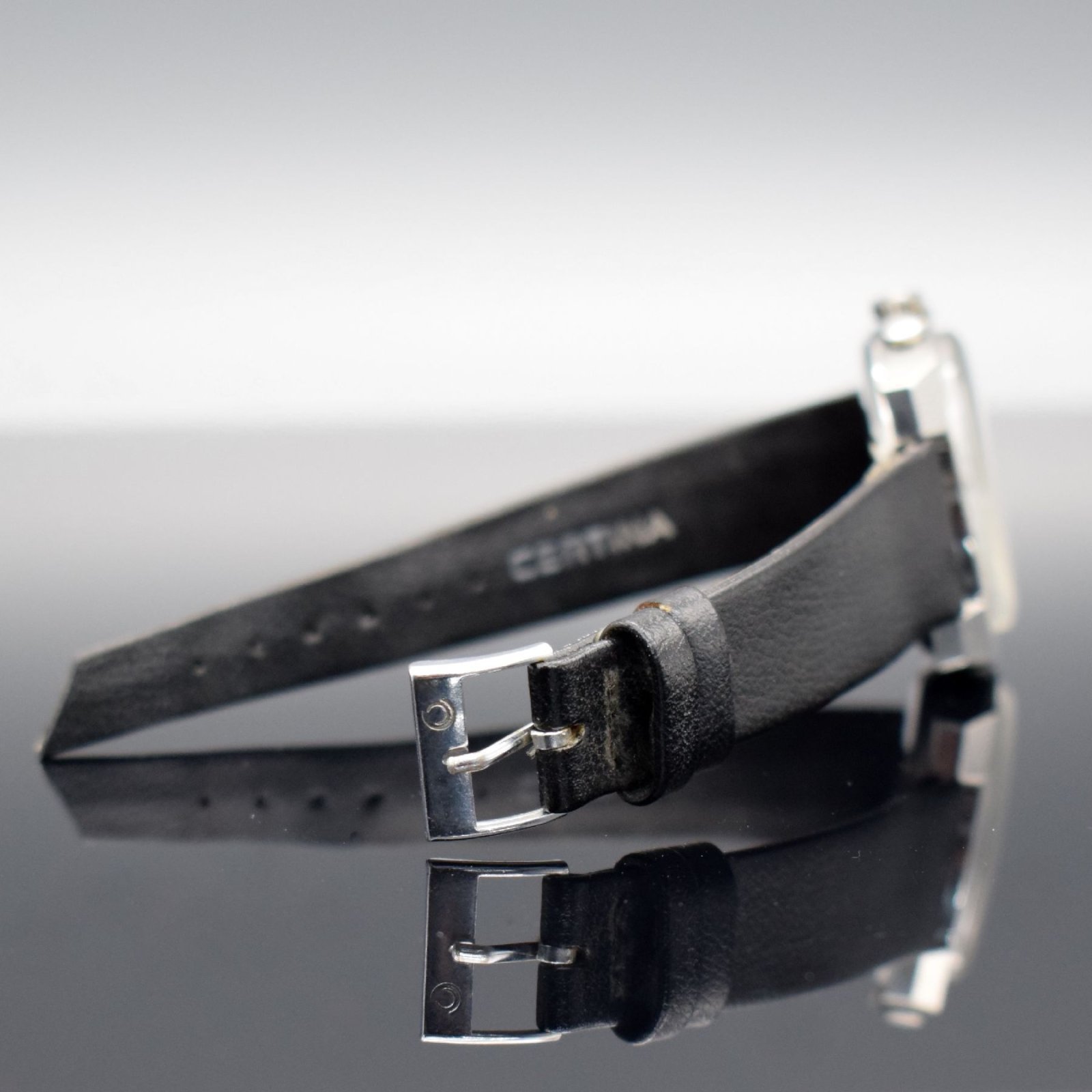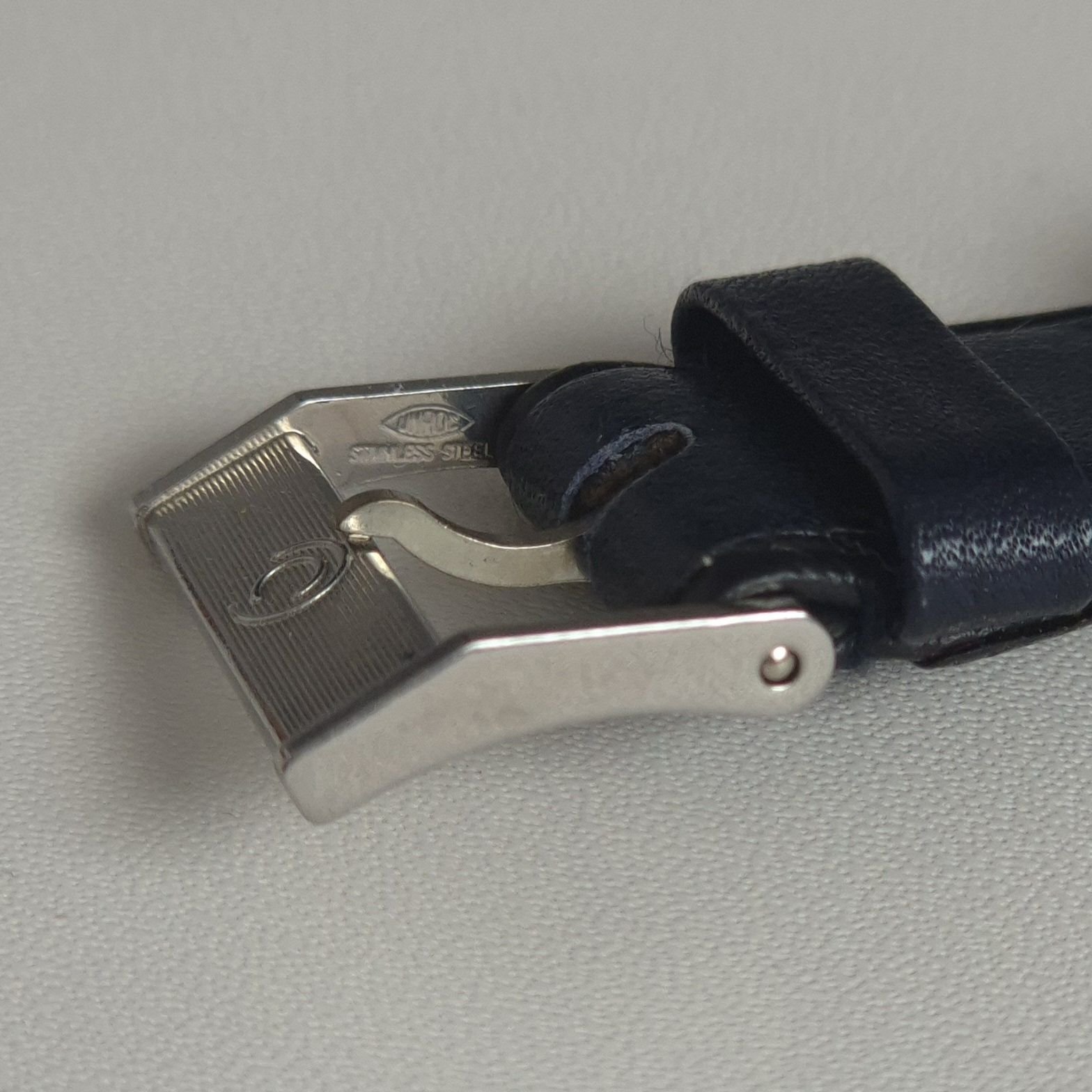 As far as I can tell, all these buckles are from watches originating from the late 1960s to 1970s, the one on the top right came mounted on an unused leather strap embossed with ‘DS’, as was originally available e.g. with the DS-2 models, while the one on the top left is from an unembossed Certina strap. On the front left you can see a buckle on a Certina Corfam strap (NOS), the corresponding watch model was available from 1971 onwards. This buckle has an inner width of 14mm, while the others all are 16mm wide. As with the gold-plated buckle, the surface structure on the part with the logo is grainy, in contrast to the grooved finish on the top right. But there also exist Certina buckles with a grainy surface structure (not just grooved ones) with an internal dimension of 16mm. Unsurprisingly, these look like this: