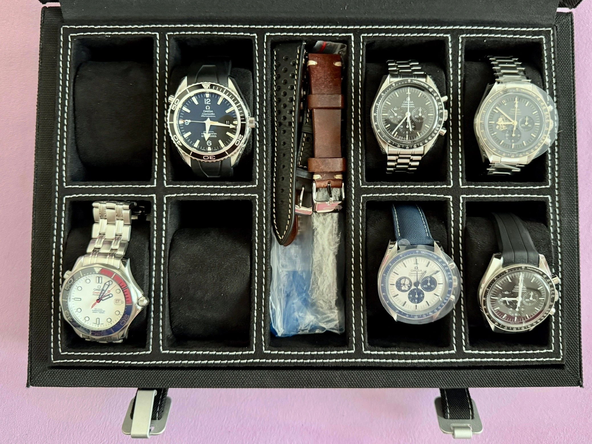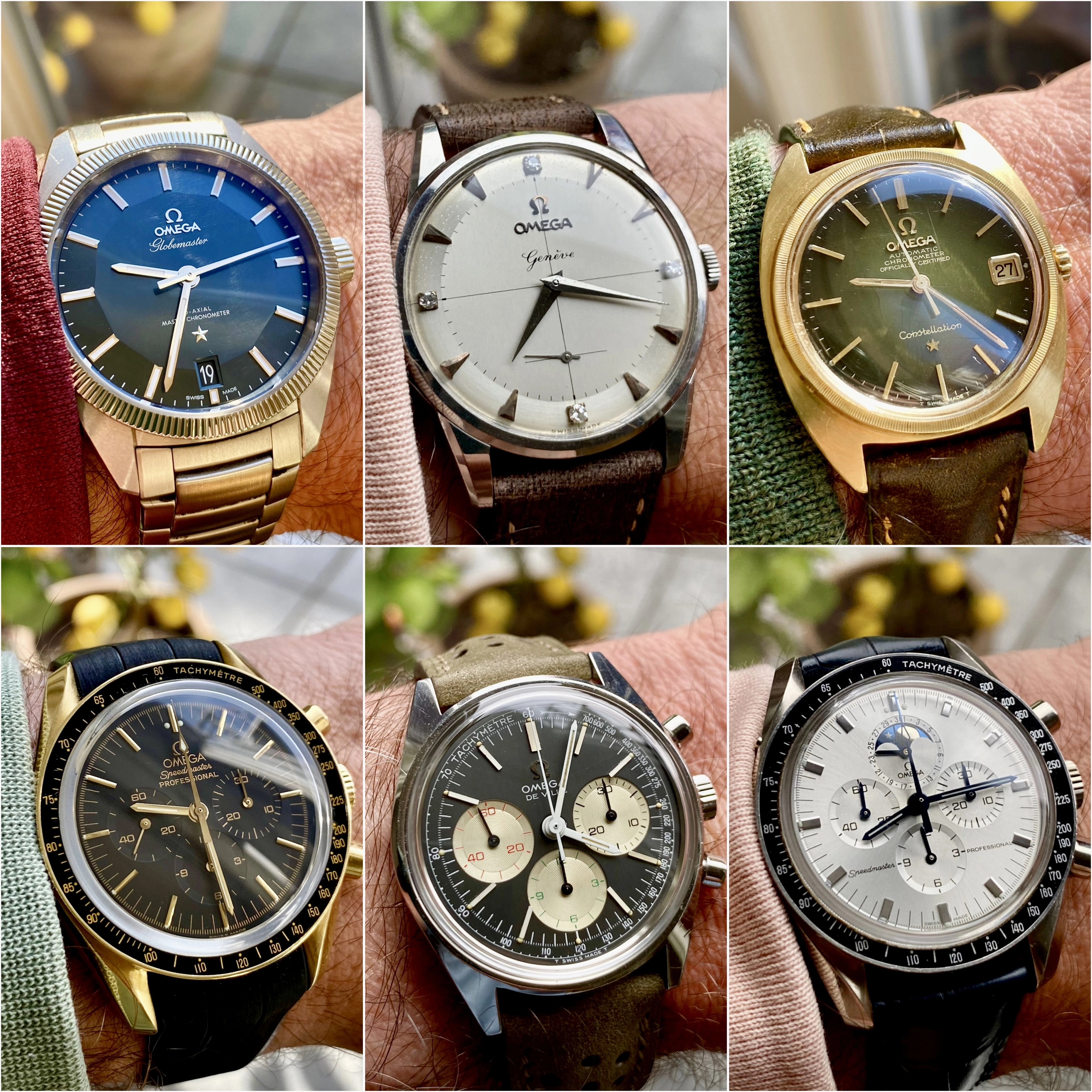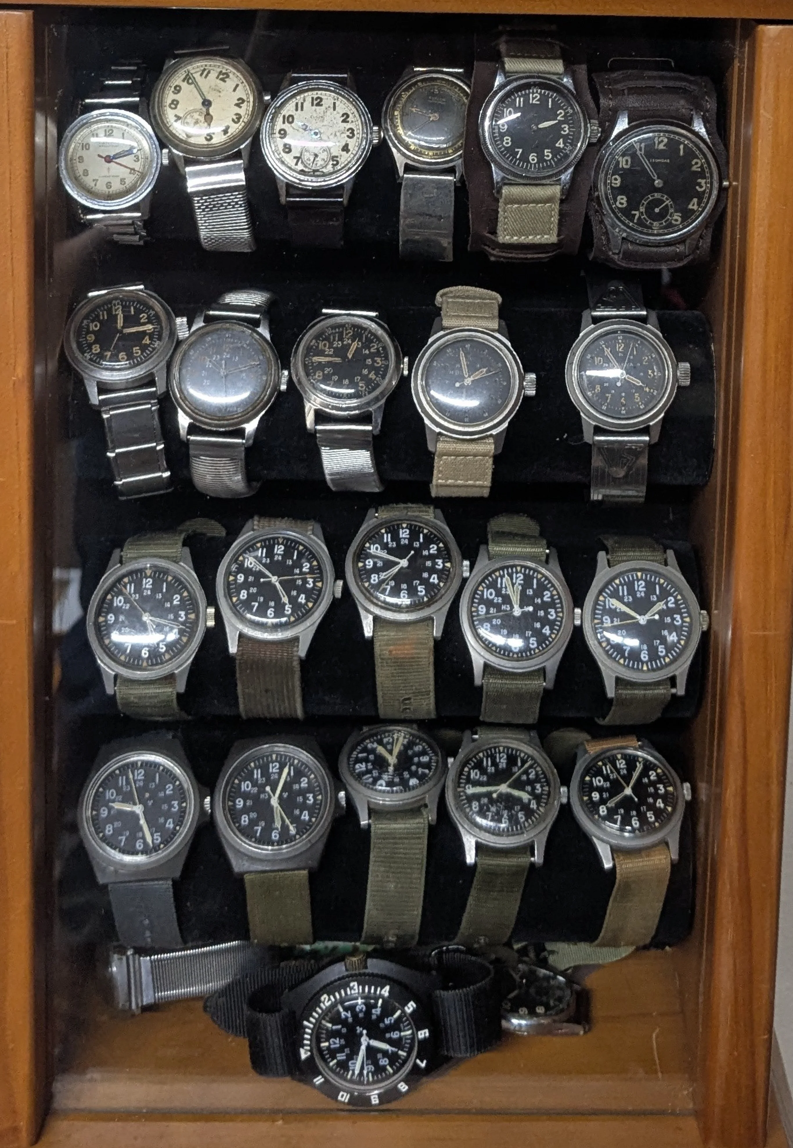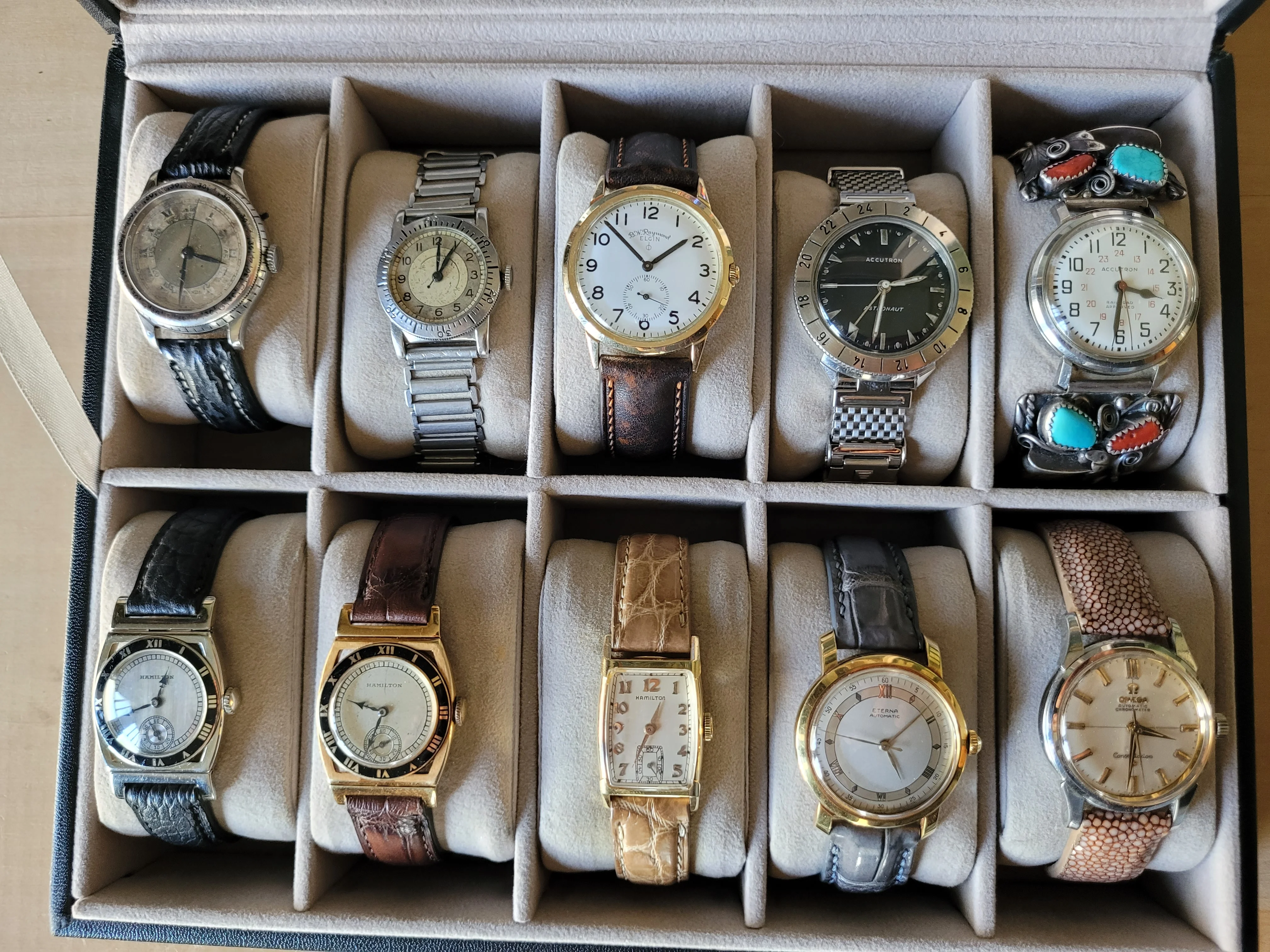 I can't show all my watches in one picture, but I can show my wrist watches in one picture. Five tool watches and five dress watches. Spanning the 1920s to the 1970s.