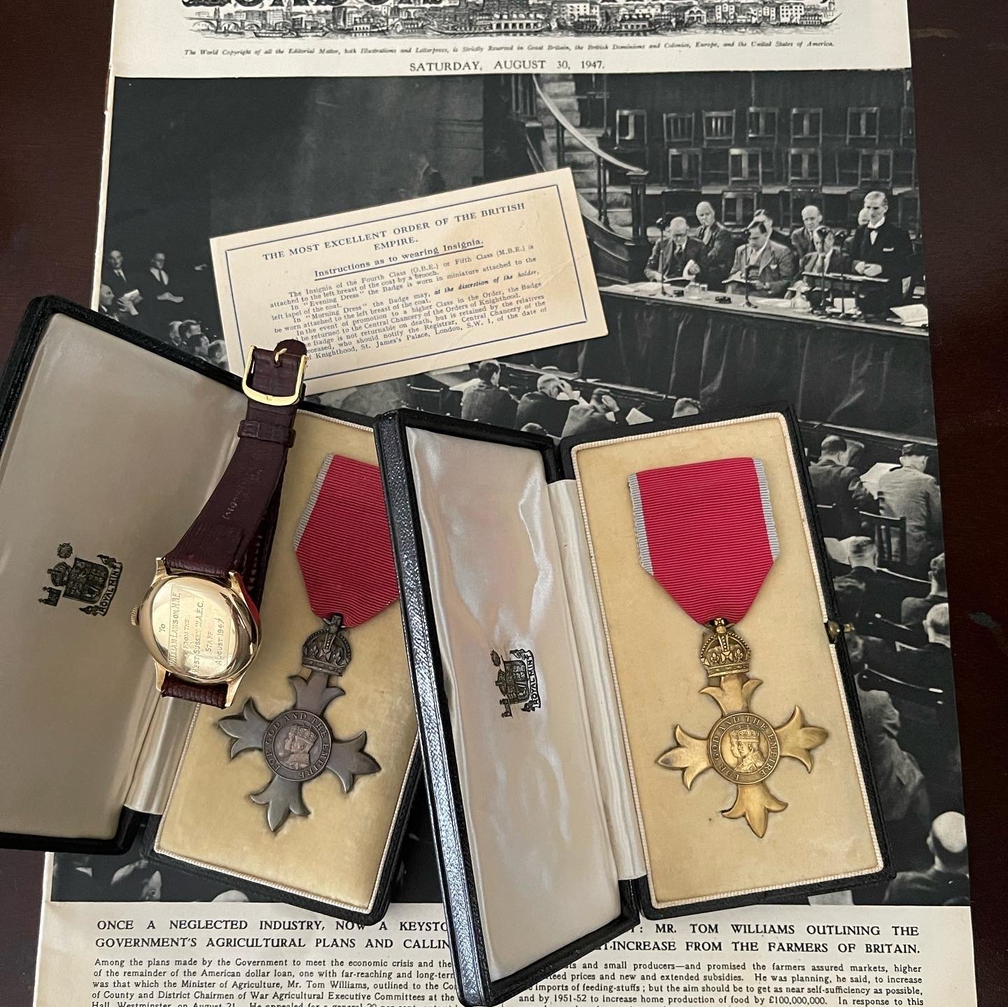This one awarded in 1947 to William Lawson for his efforts in WW1 and WW2 to manage the Women's Land Army as executive of the West Sussex War Time Agriculture Executive Committee. He was awarded twice the Order of the British Empire. Once by King George VI for WW1 and then by Queen Elizabeth II for WW2. He appears in several books on the subject of how the women of the UK provided the resources for the men of Britain to fight the wars.