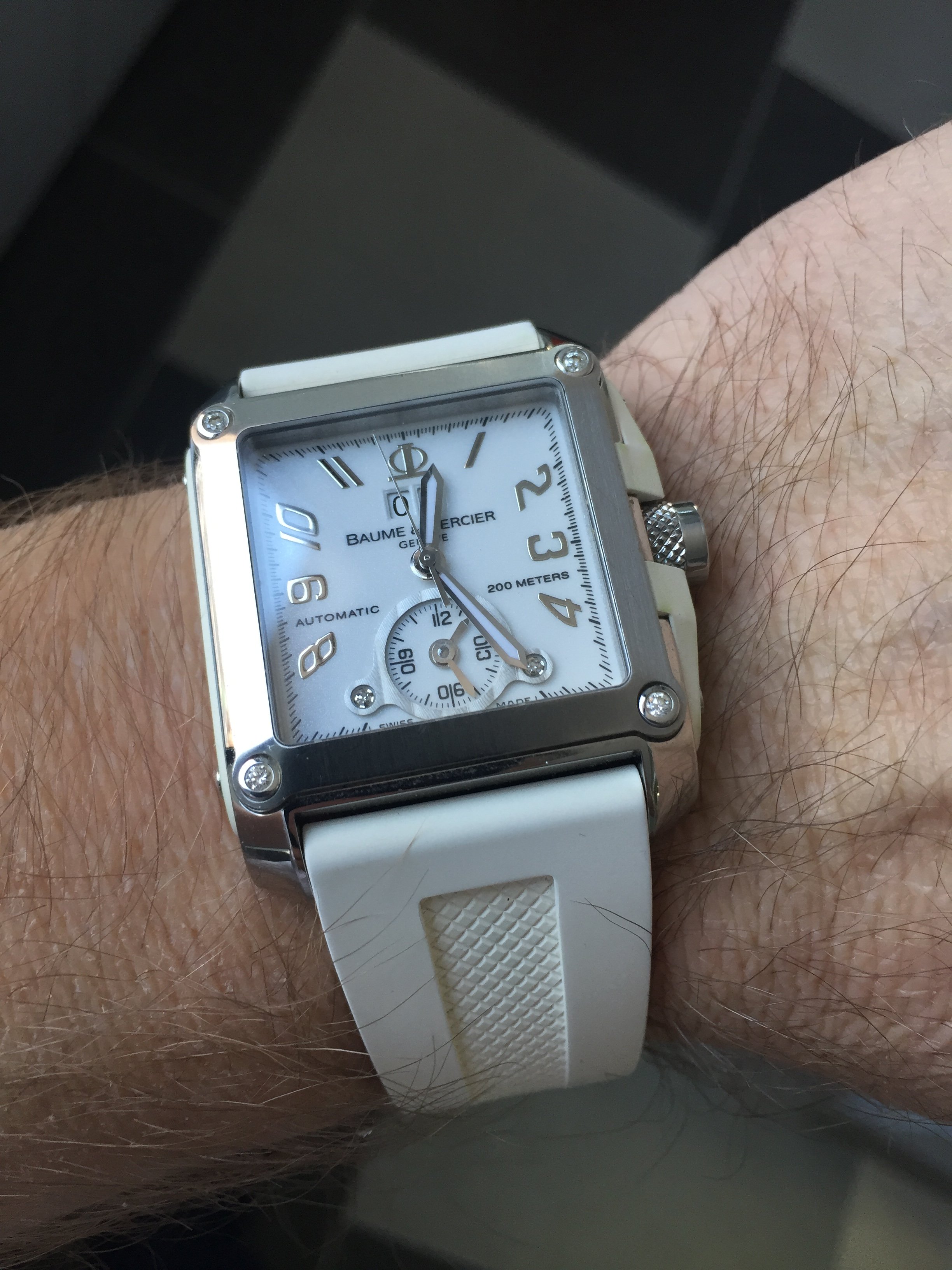 ·Satin-finished steel case set with 4 diamonds, Transparent case back, Screw down crown, White rubber strap, Triple folding security buckle, Shimmering white dial set with 2 diamonds, Luminous hands, Silver Arabic numerals, GMT Second time zone, Date at the 12 o'clock position, Scratch resistant sapphire crystal, Swiss automatic chronograph movement, Water resistant to 200 meters.