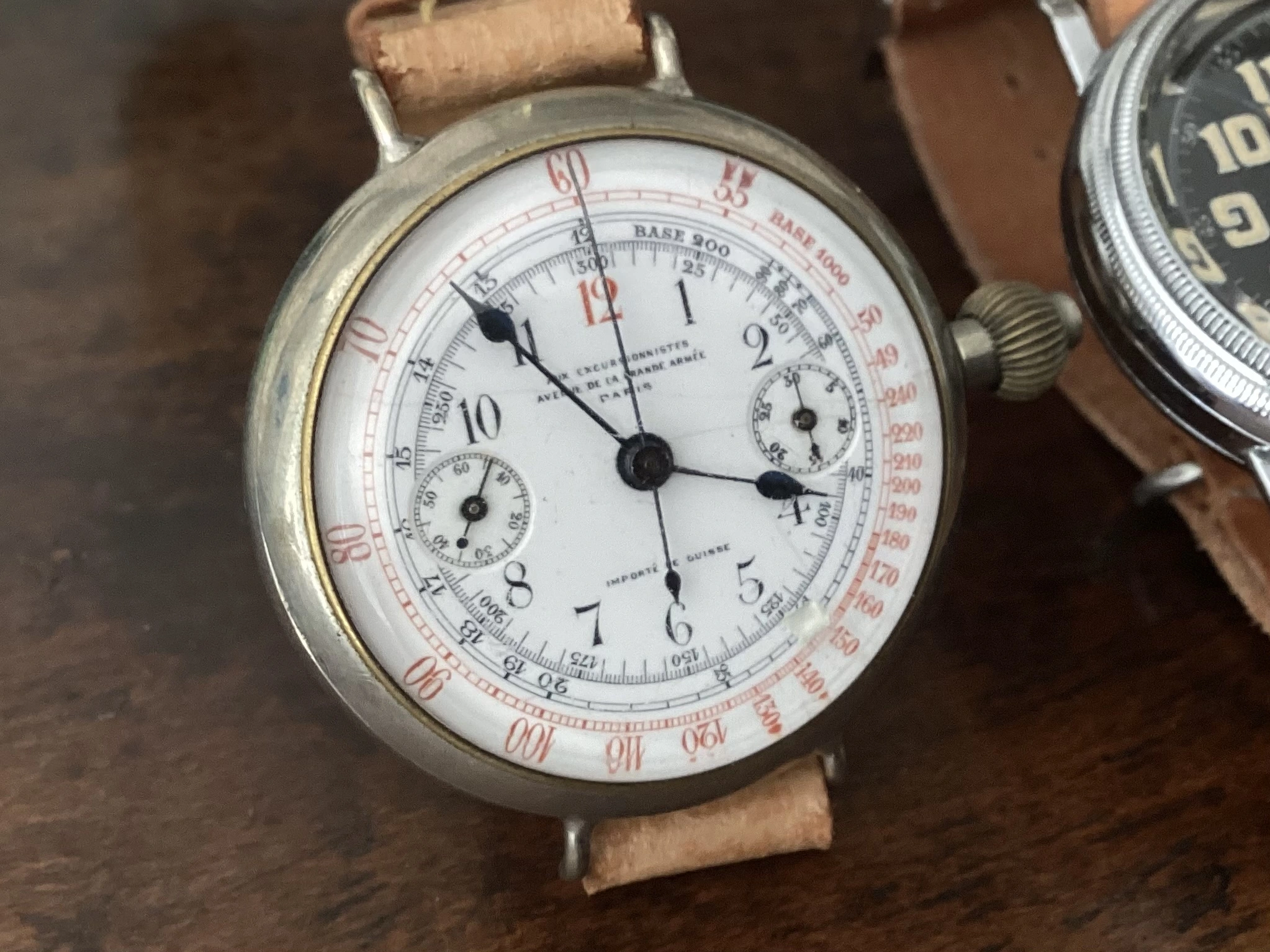 Abercrombie & Fitch 1930s chronograph made by Heuer. Landeron 13 movement. Note the asymmetrical pusher locations. Originally sold for $25 per the A&F catalog.