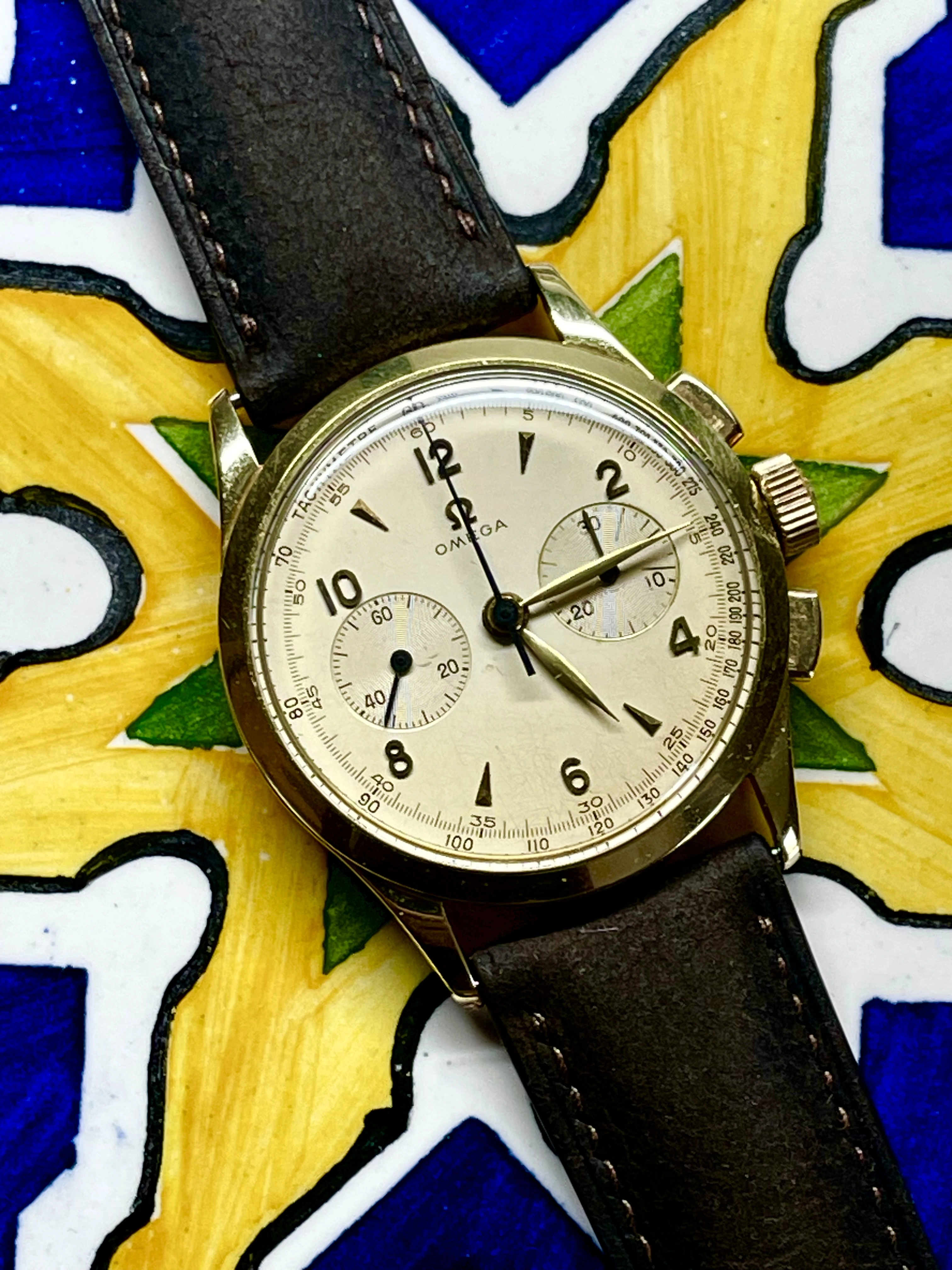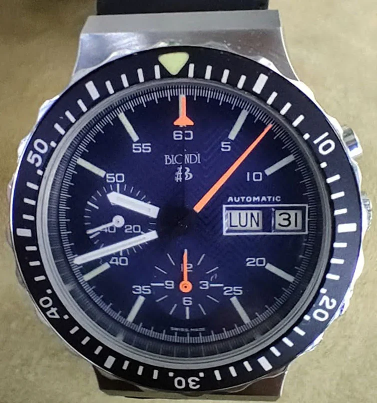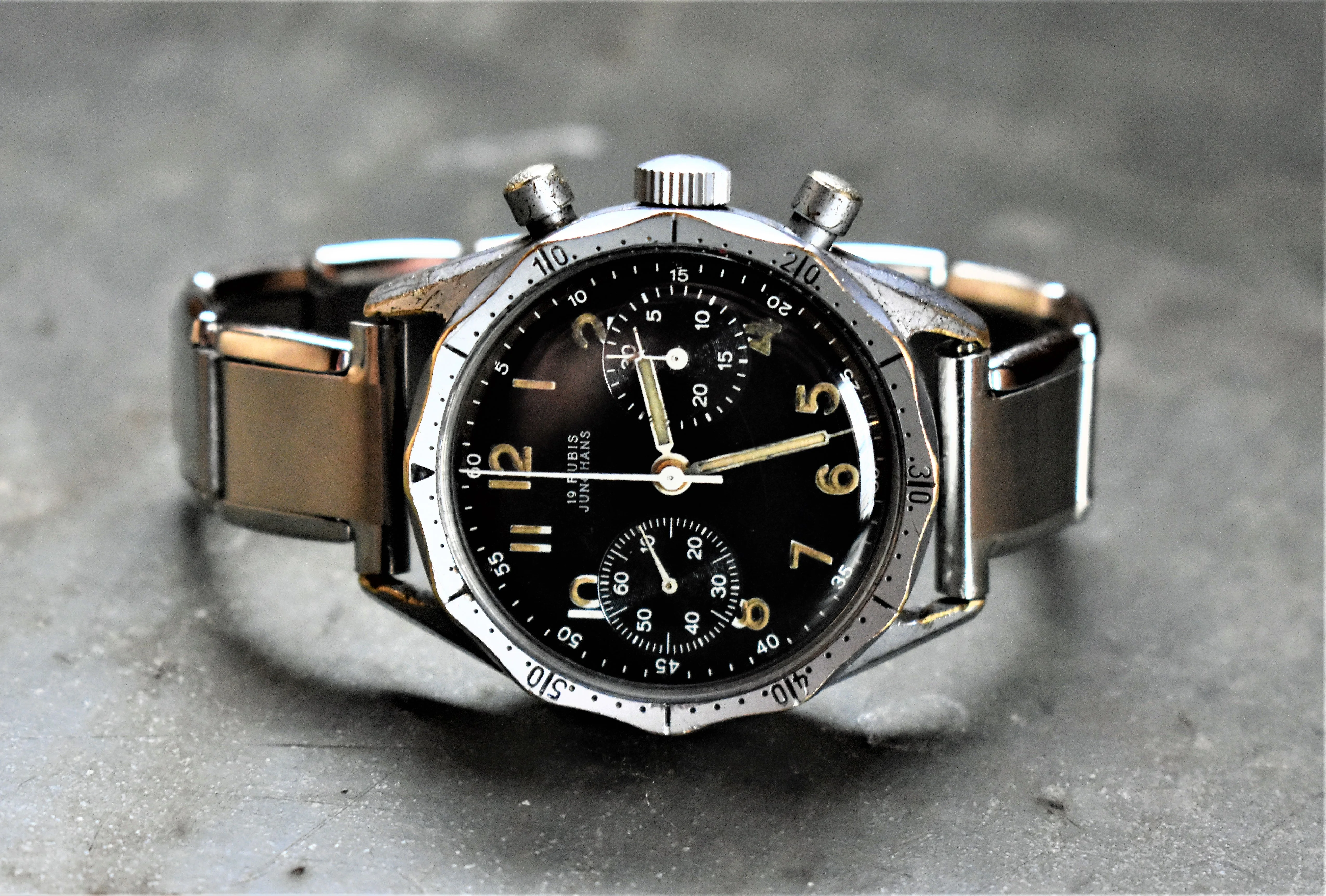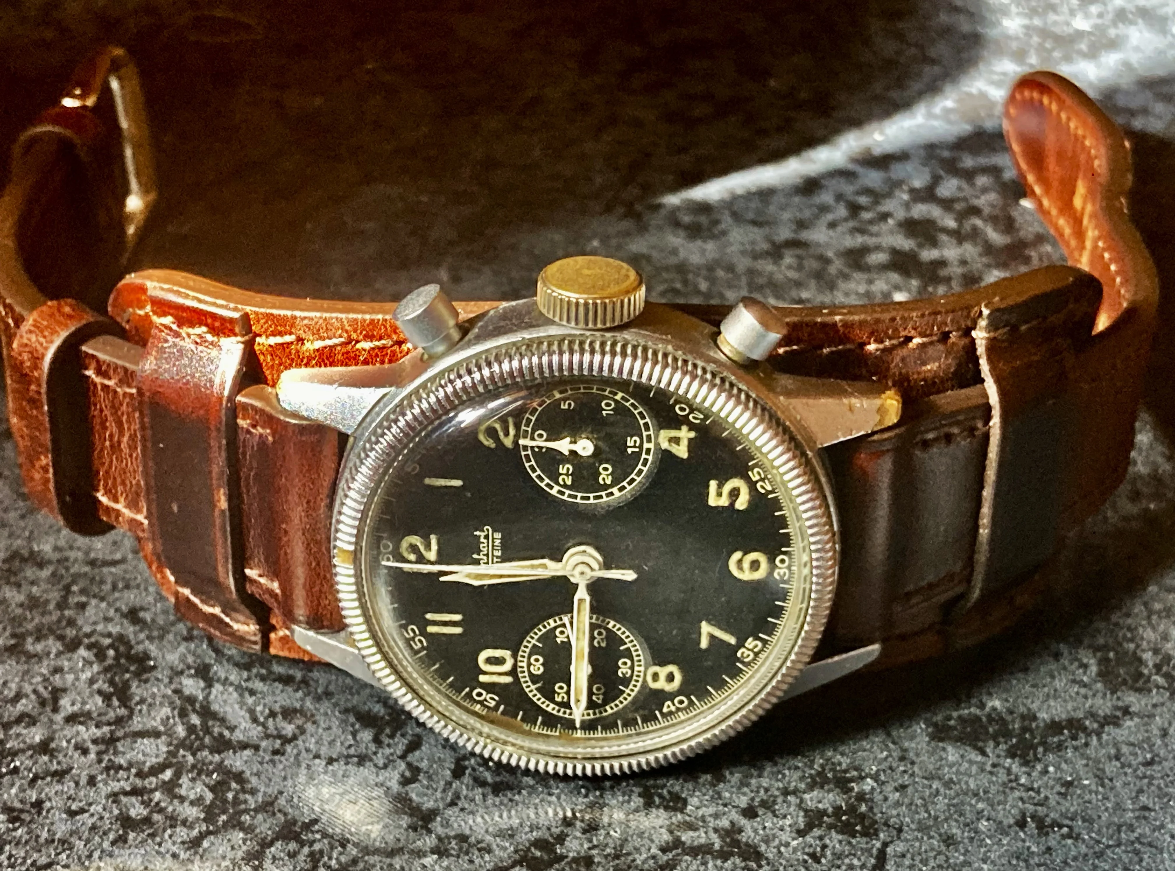 This 2 register Sigdin chronograph from the 50's with push buttons. Not sure unusual is the right word, but scarce information about this brand. appears to have a landeron movement, though still narrowing down which one. 248 is my best assessment at this time, but just as easily "222, 223...you know...whatever it takes..." Does not, at the moment, function.