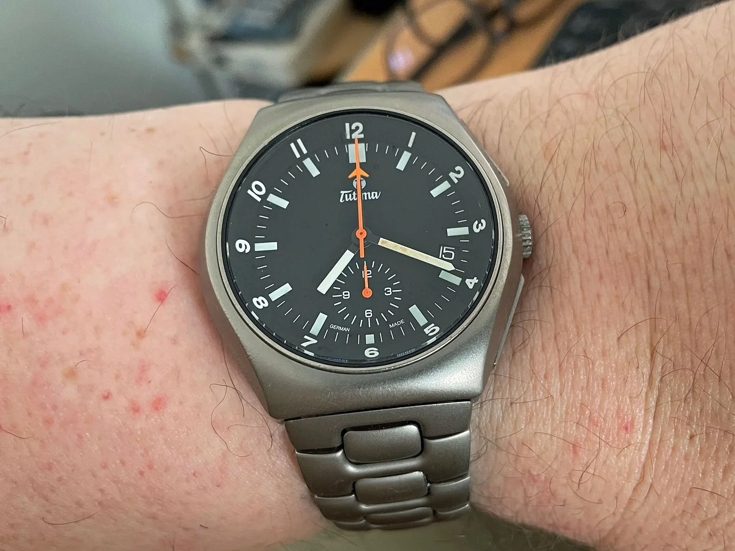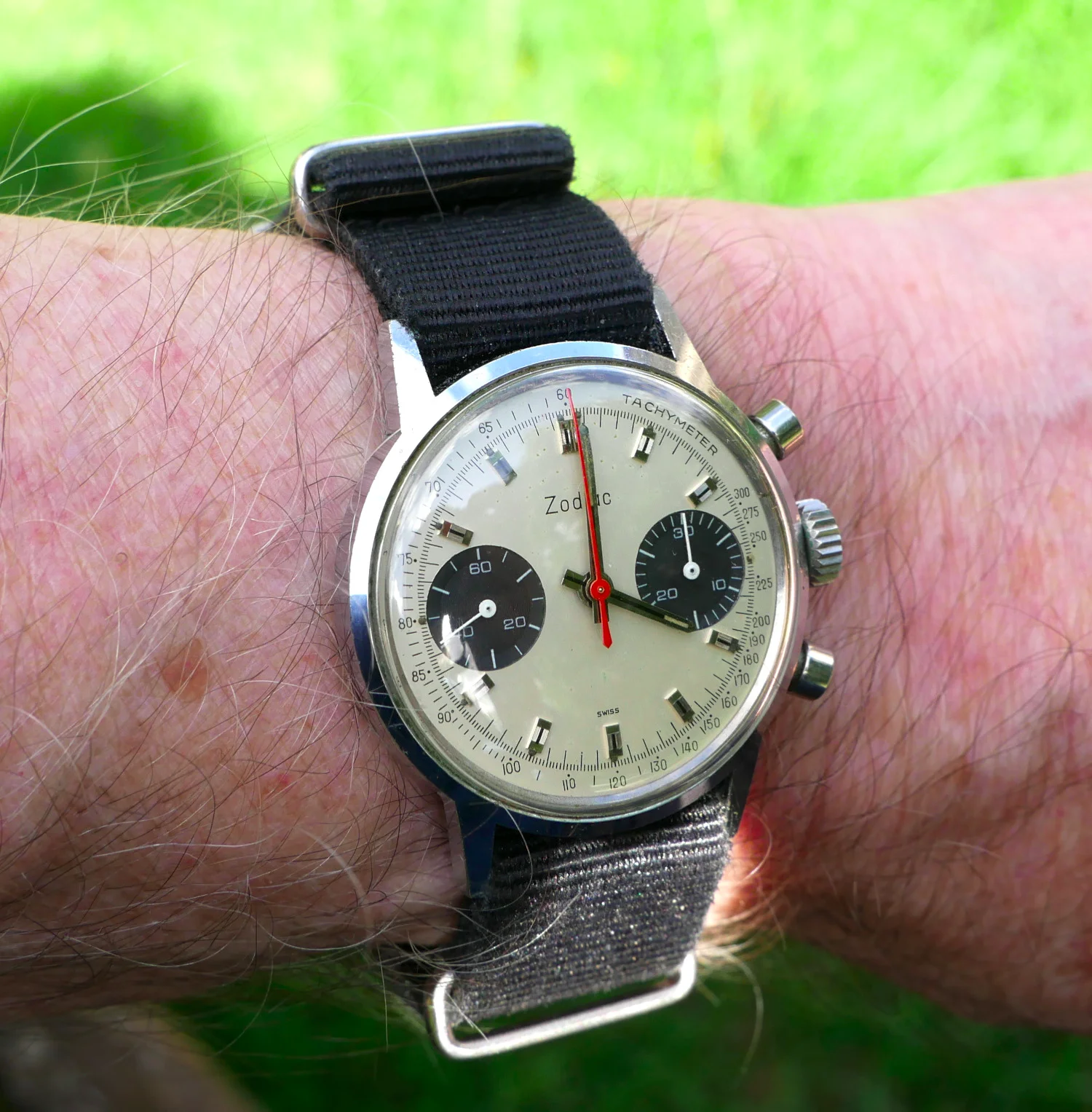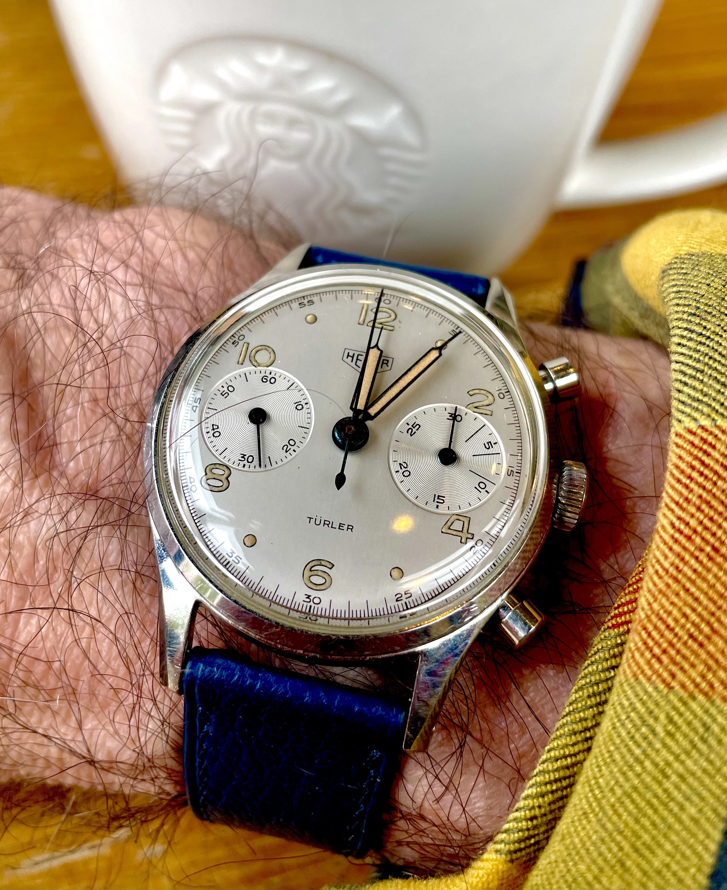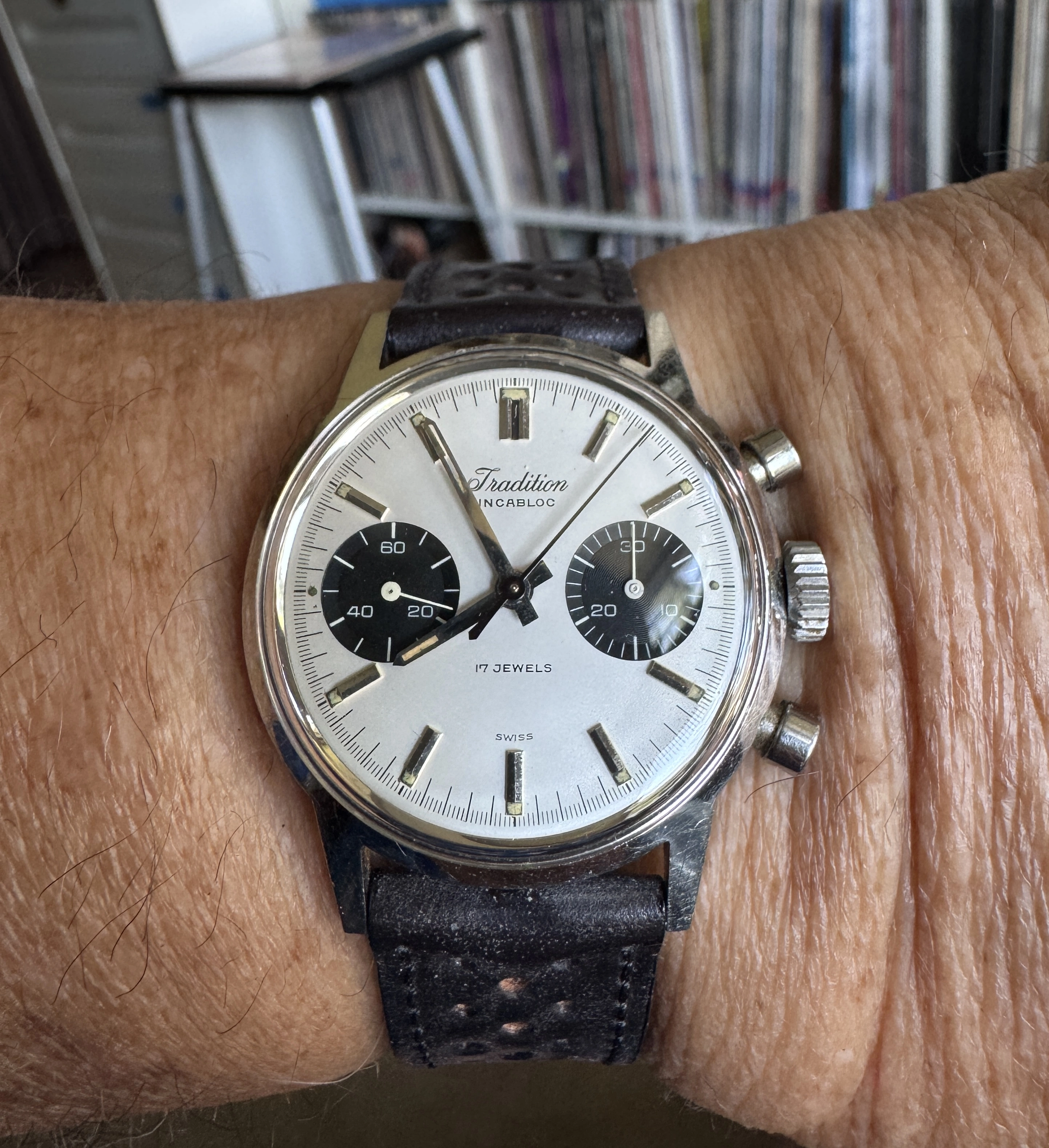 This 2 register Sigdin chronograph from the 50's with push buttons. Not sure unusual is the right word, but scarce information about this brand. appears to have a landeron movement, though still narrowing down which one. 248 is my best assessment at this time, but just as easily "222, 223...you know...whatever it takes..." Does not, at the moment, function.