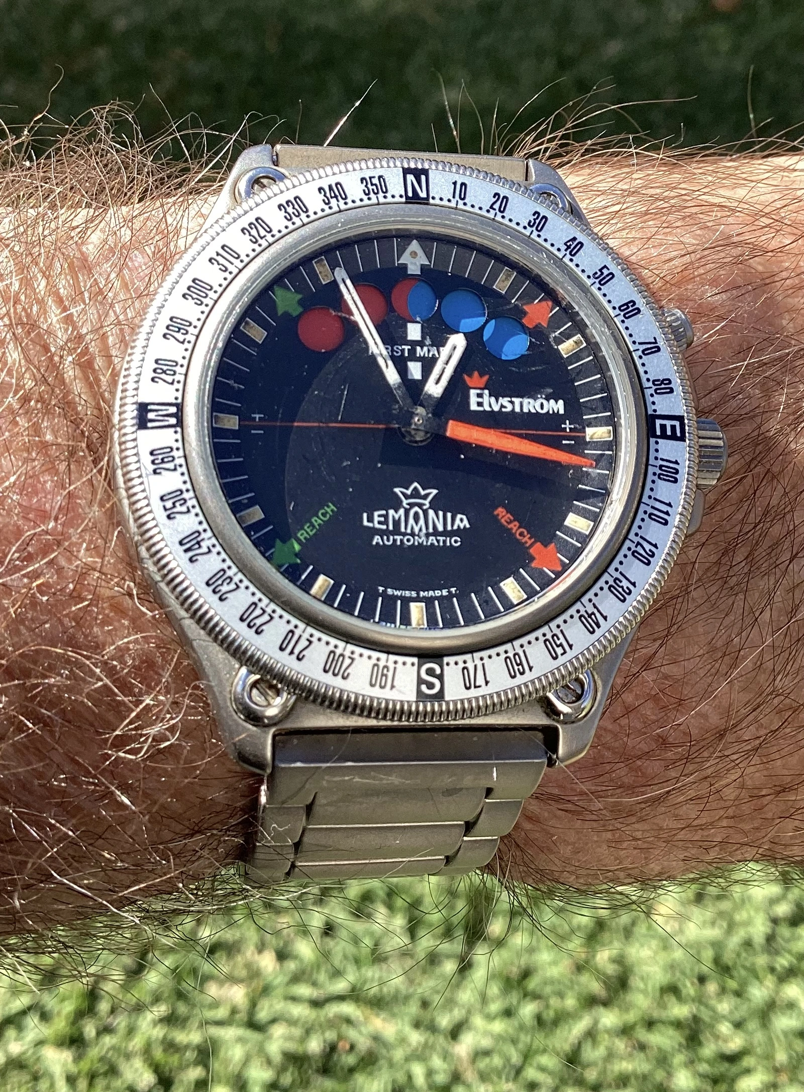 Elvstrom’s Yacht watch was an ingenious adaptation of the Regate watch originally produced by aquastar whereby it not only counted off the time with the minute discs and a central second chrono hand , which by the way reverted to a normal second hand , from the ten minute gun so as to arrive on the start line as gun gun went off but also to pre plot your course to steer by compass from mark to mark whether the wind is aft or forward of the beam. This is a titanium case which I understand was the last model before Paul Elvstrom jumped ship from Omega to Rolex and Omega recalled all .