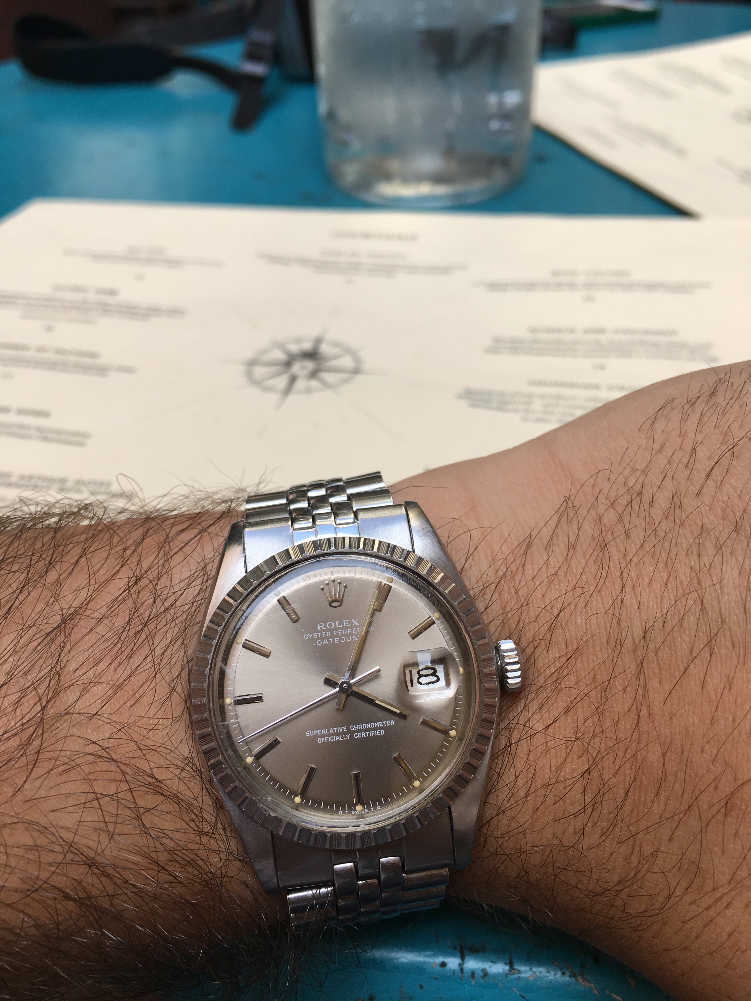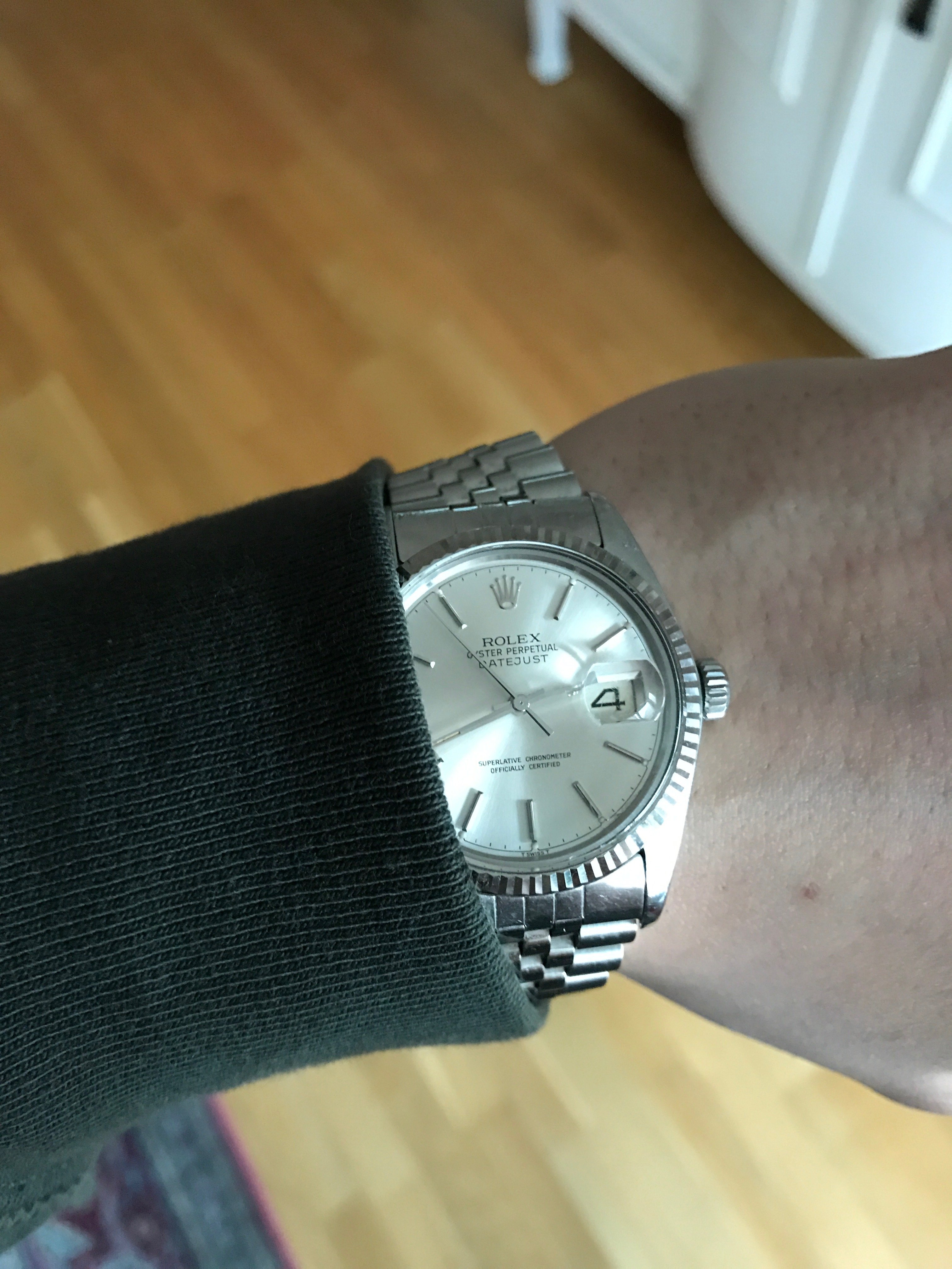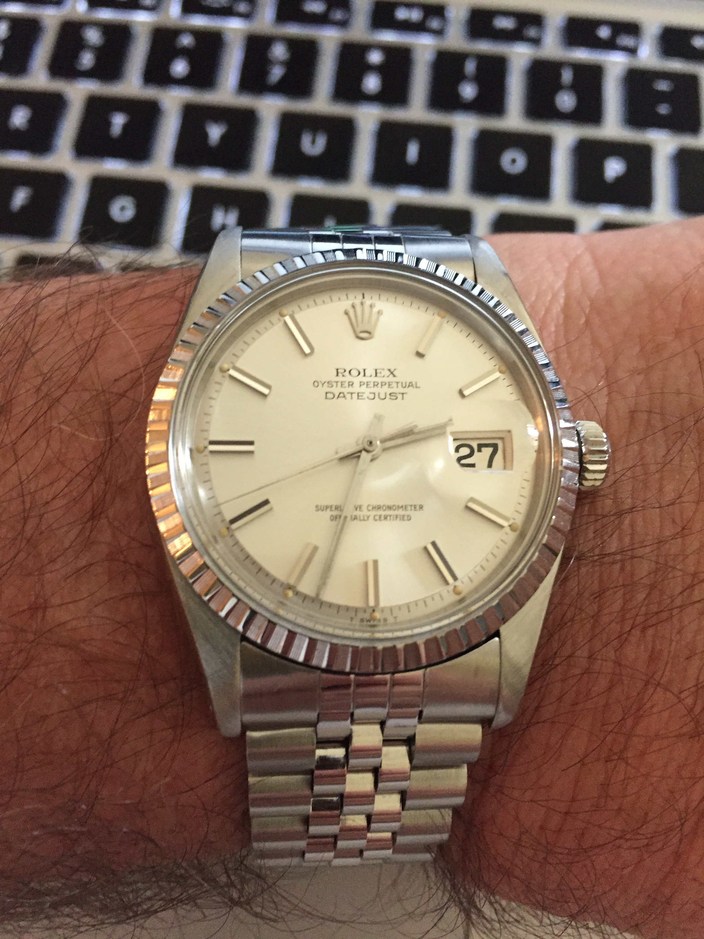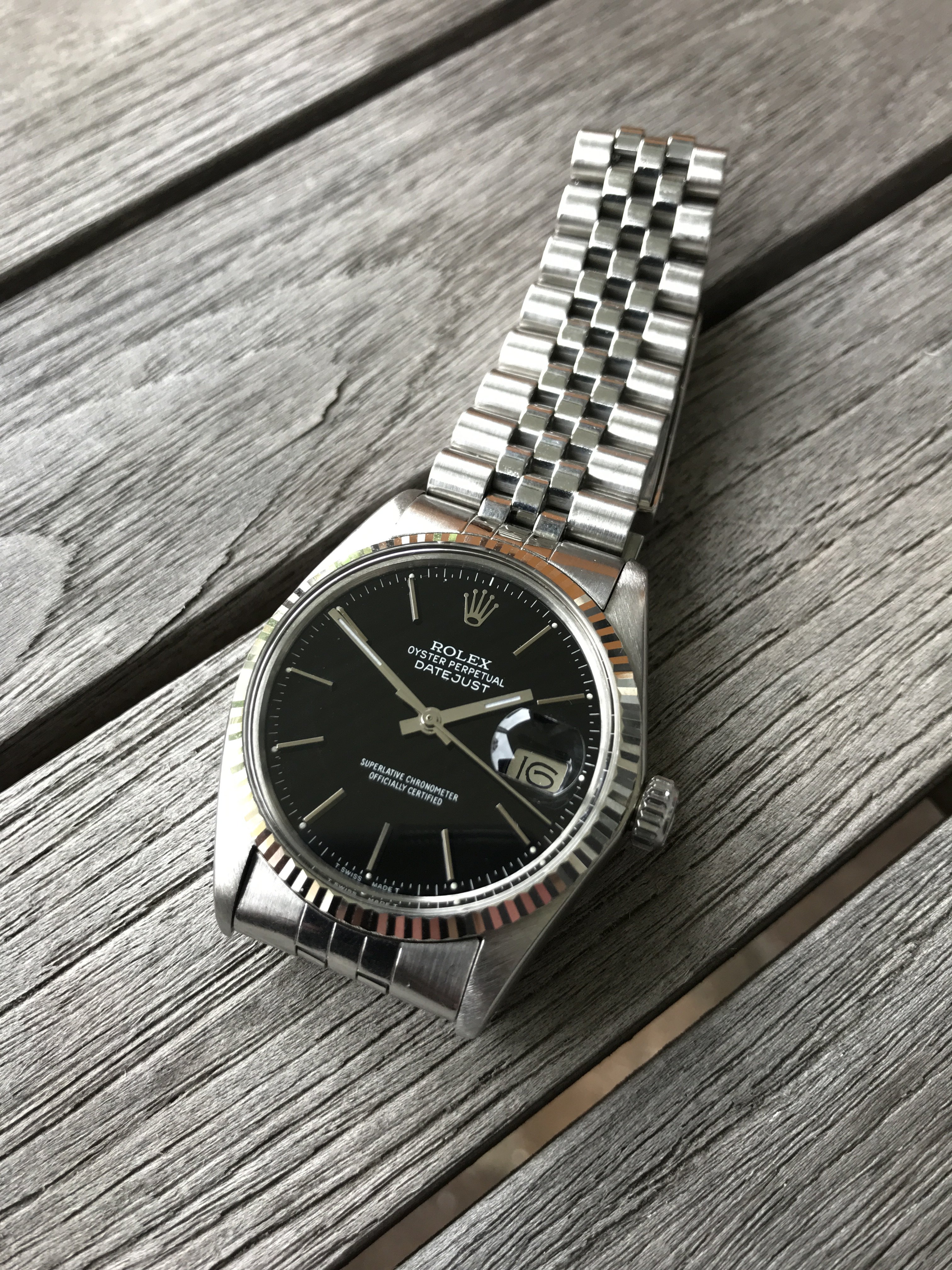 路Unlike many of the other Date-Justs shown in this thread, only because of the unique dial. This one came my way right after Rolex fitted the Date-Just with a sapphire crystal. The dial has applied Roman numerals, and is the only one like it that I have seen. My all time favourite dial on this model. Currently running just 19 seconds fast in the past six months! Who needs quartz?