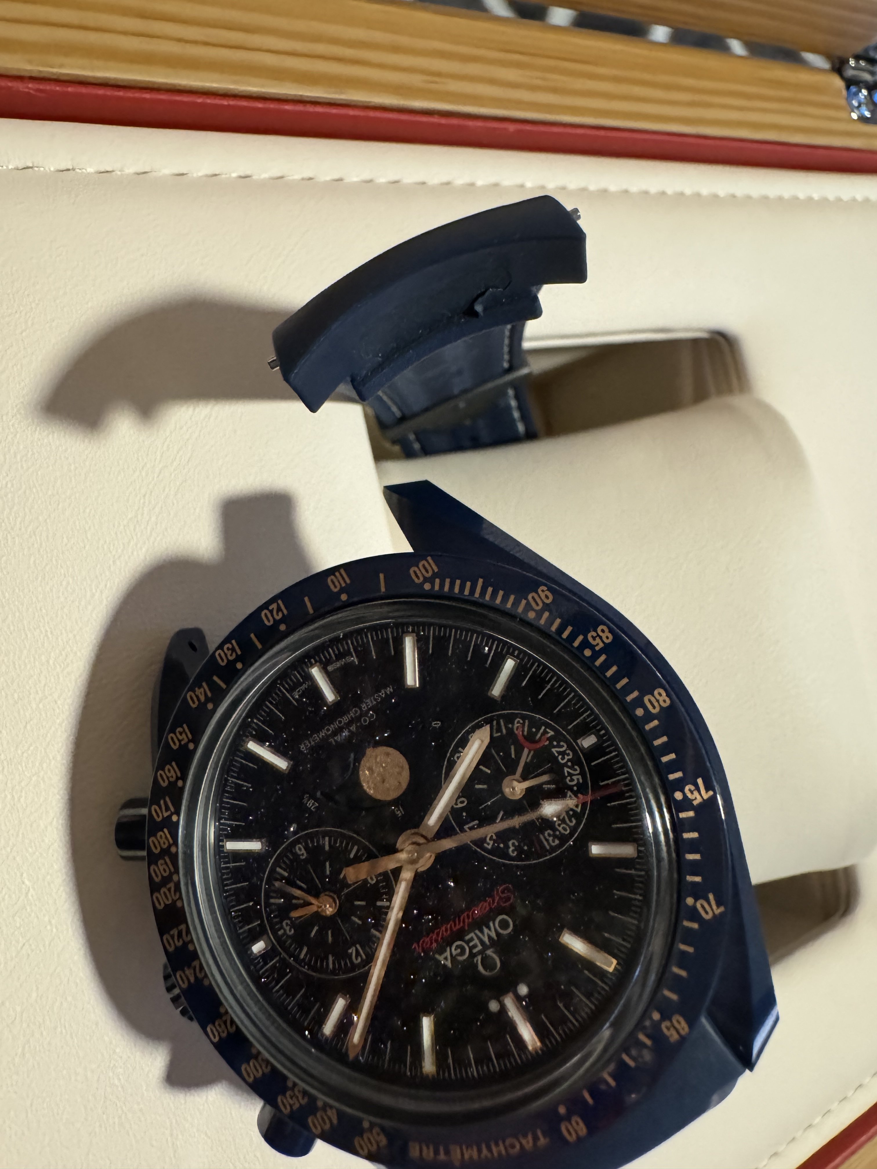 ·I bought a Speedmaster Moonphase and swapped out the leather band for the silicone band. I have worn it about 2 hours total. Today, the band randomly popped off. Thankfully I was sitting on the bed when it happened. The pin was intact and the watch just, literally, fell off.